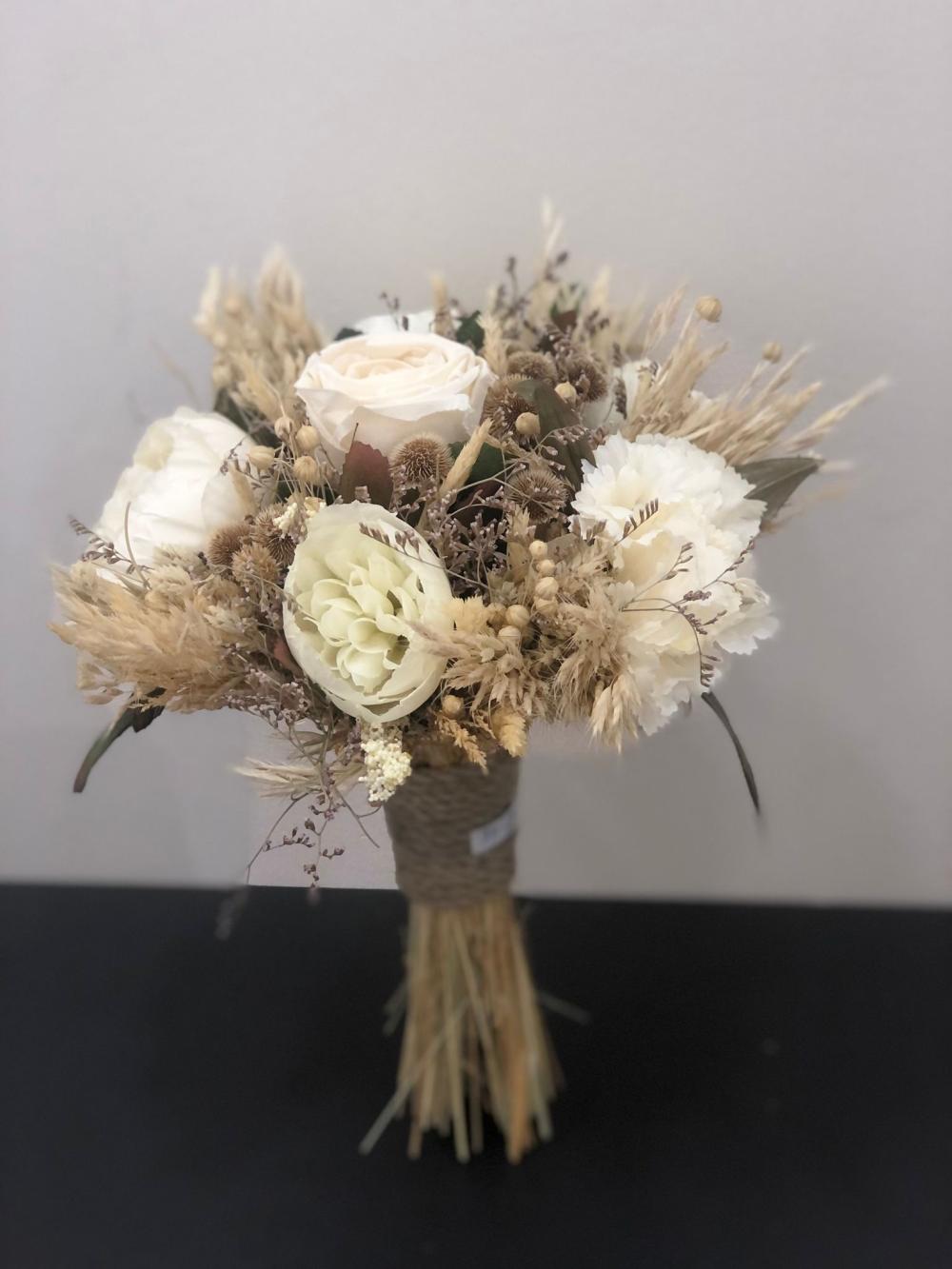 Kahve rengi tonlarına sahip beyaz güllerden oluşan yapay gelin buketi.
