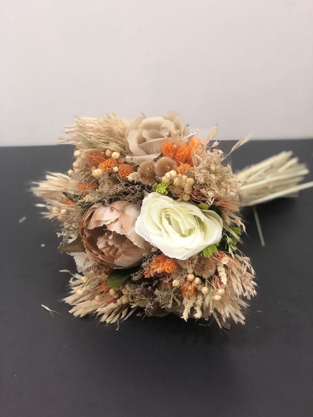 Turuncu detaylara sahip beyaz ve kahve tonlarında yapay gül gelin buketi.