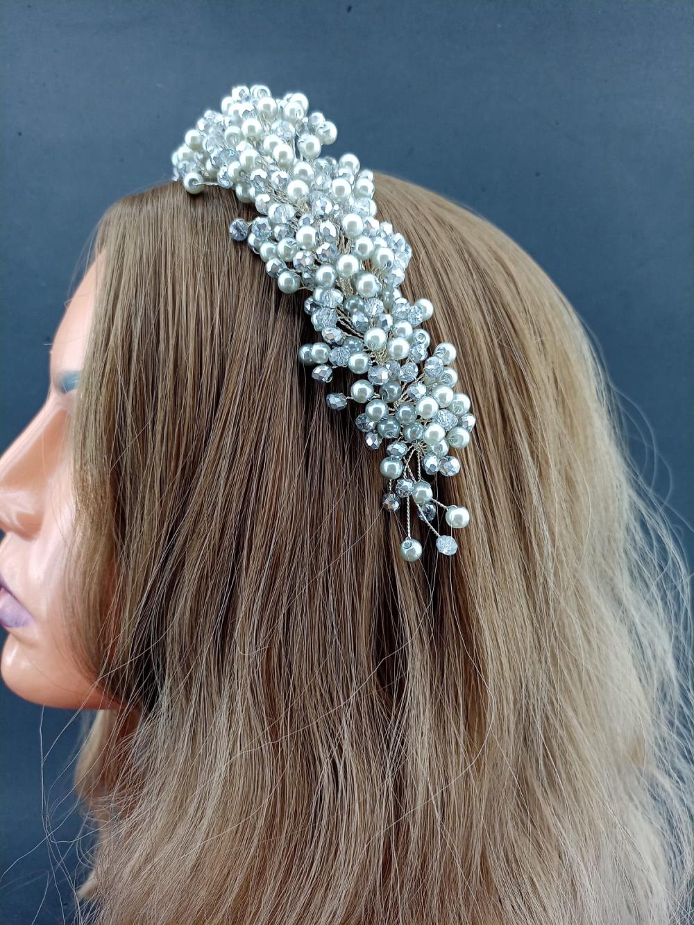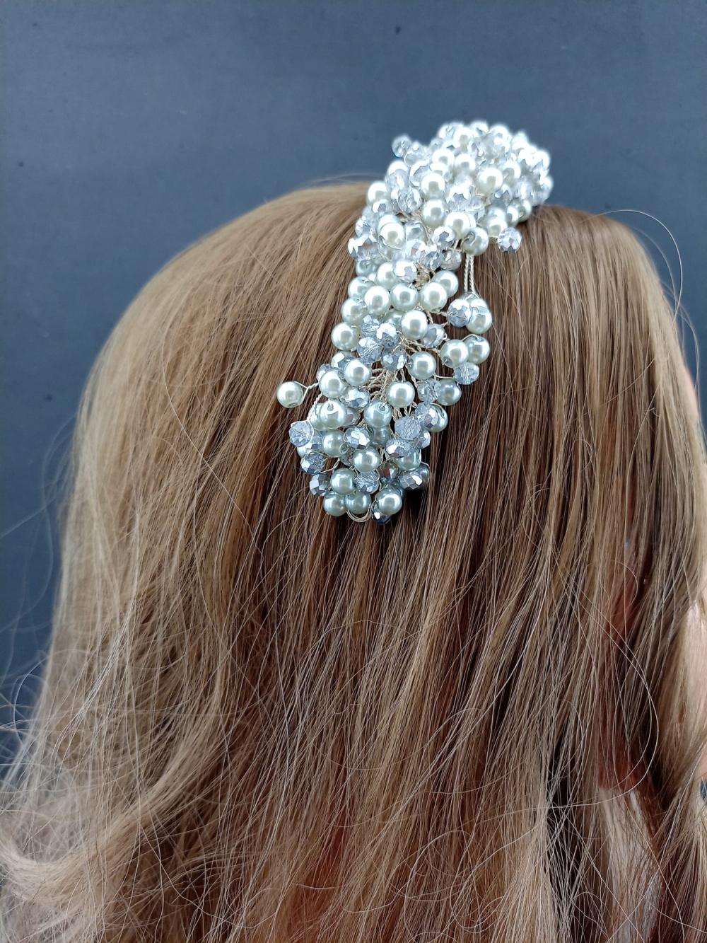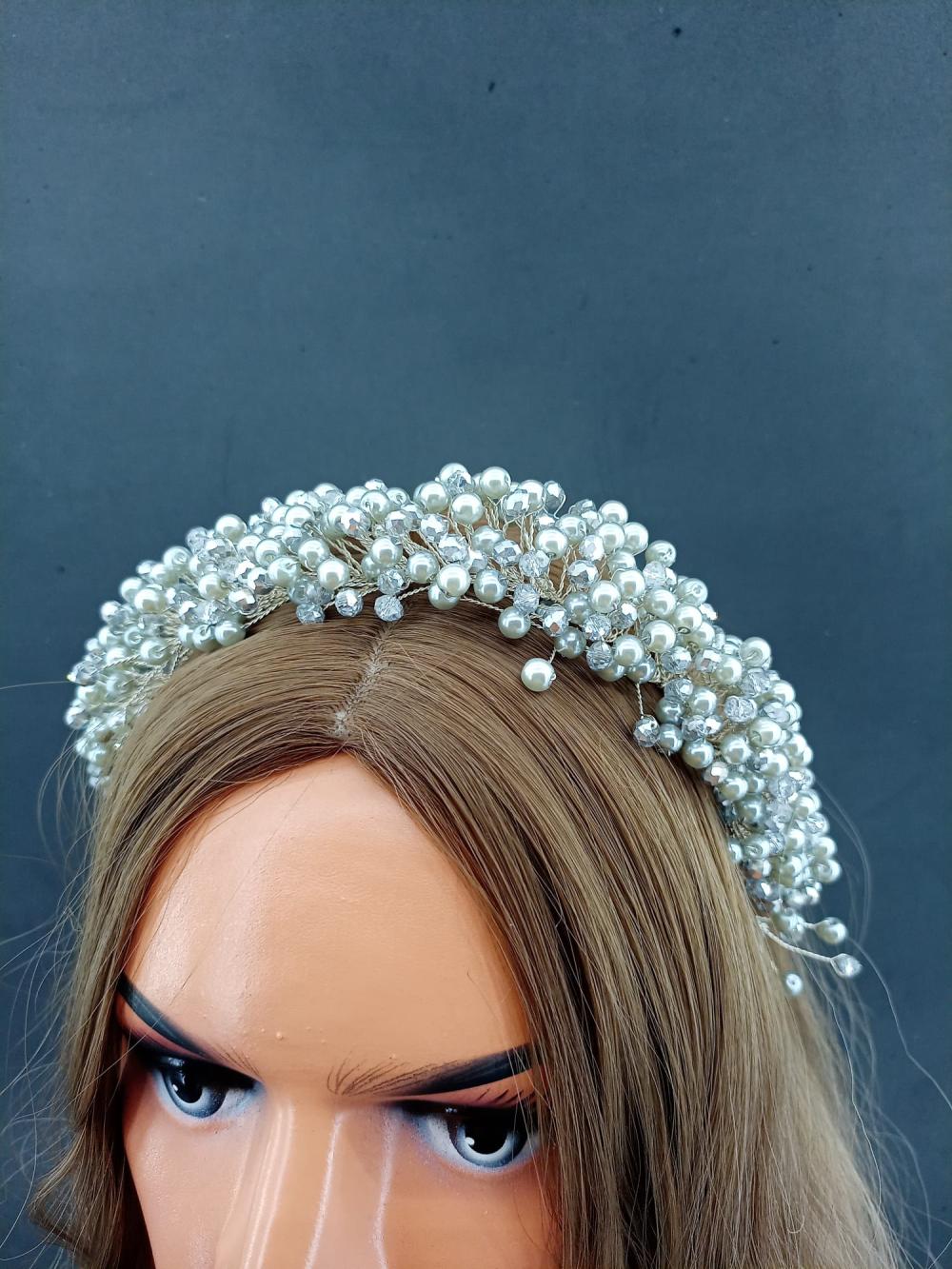 Açık Mavi İncilerle Süslenmiş Gelin Tacı