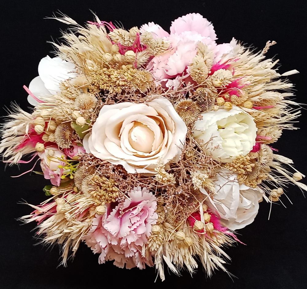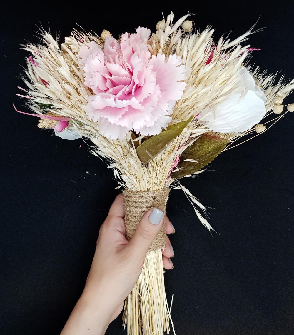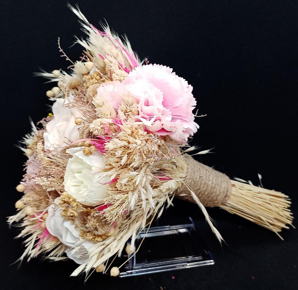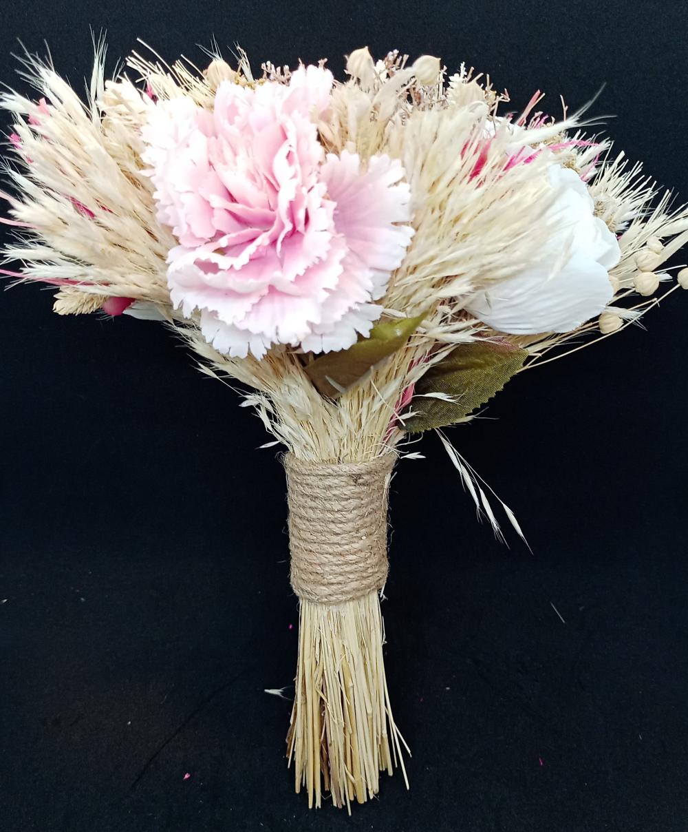 Kahve tonları otlarla süslenmiş gül, karanfil karışımı yapay gelin buketi.