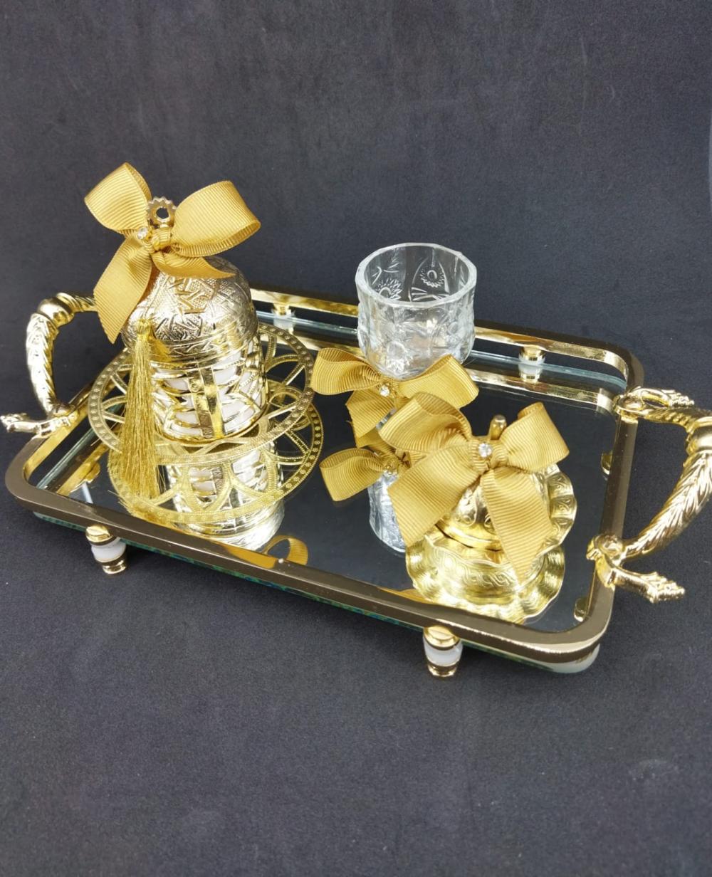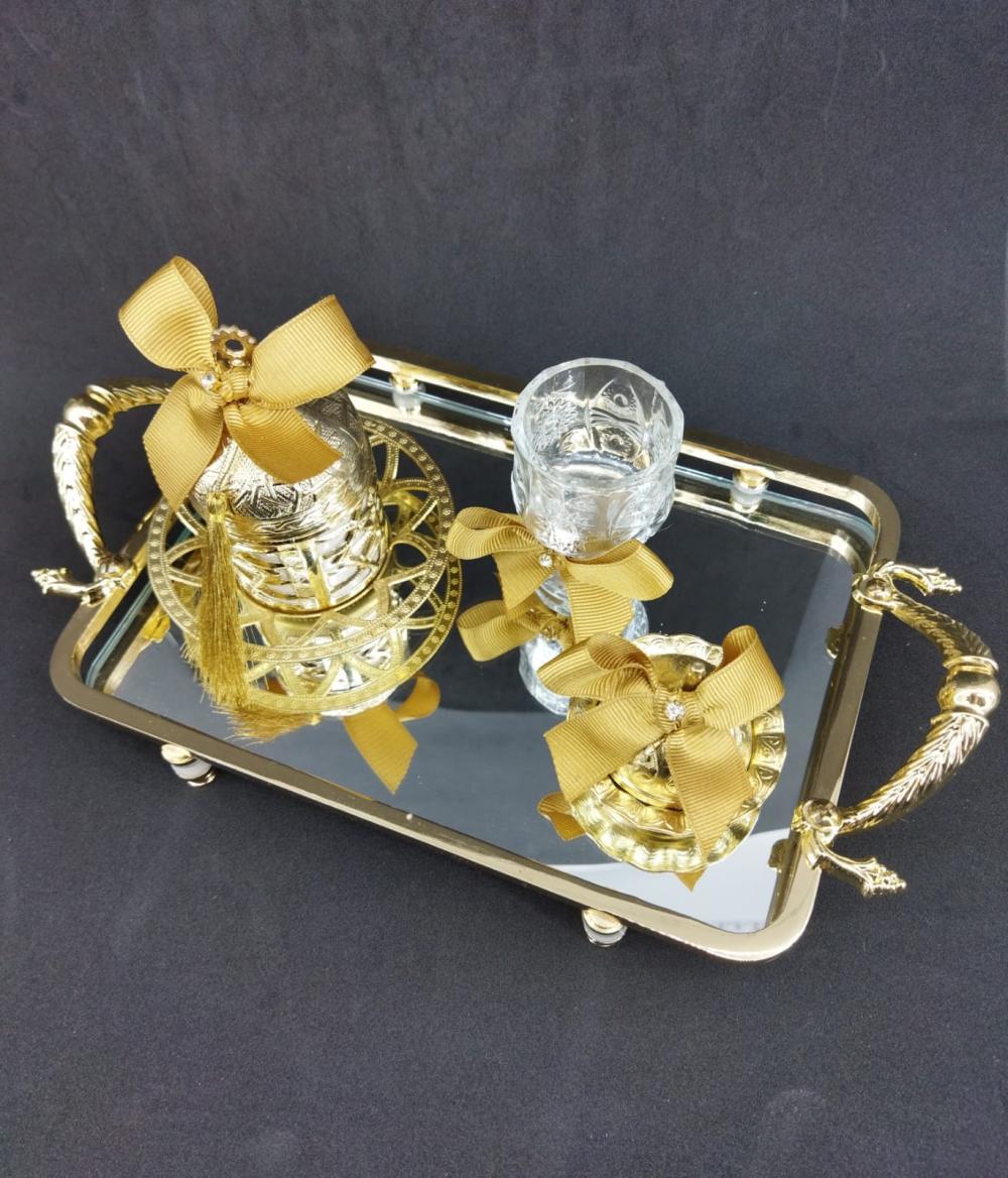Ayna Detayına Sahip Gold Renk Söz - Nişan Kahve Tepsisi