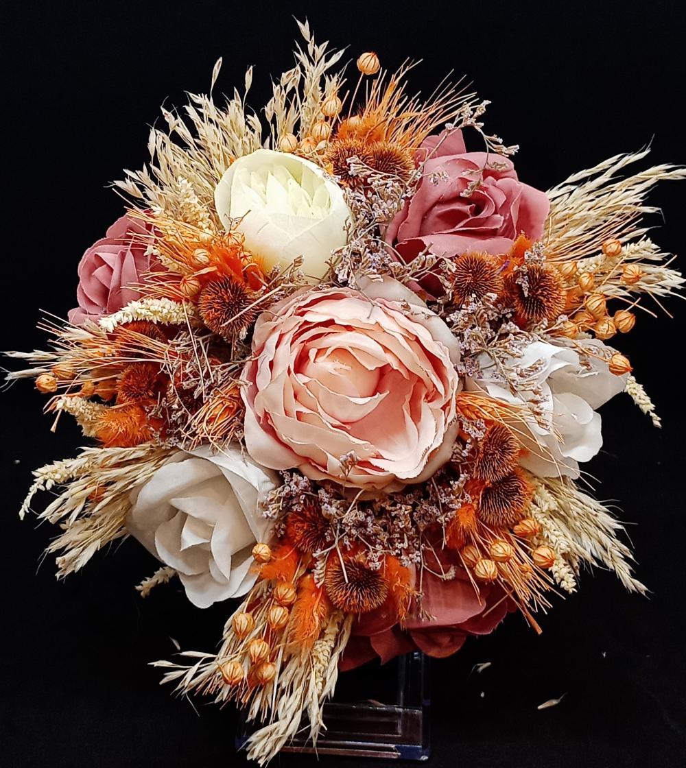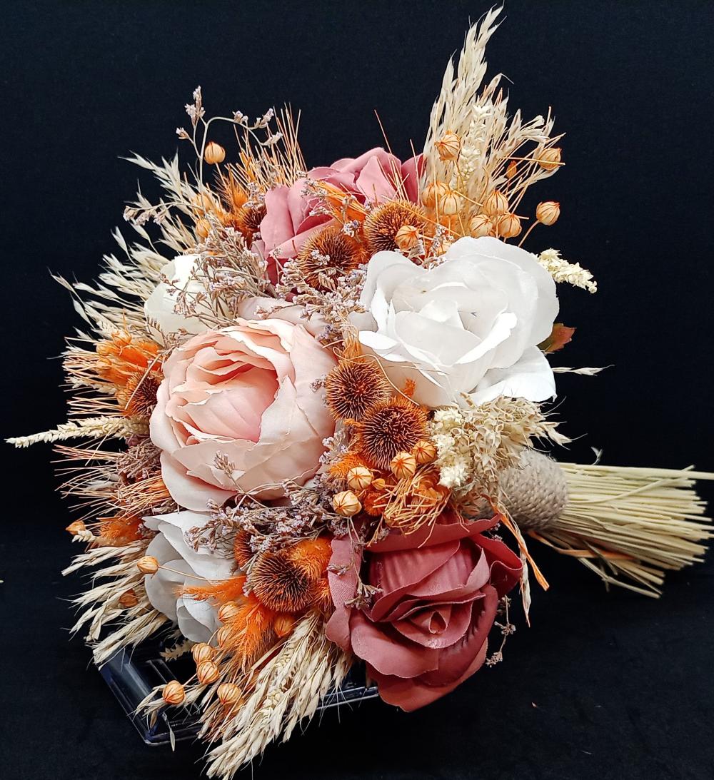 Pembe, beyaz güllerden oluşan yapay gelin buketi.