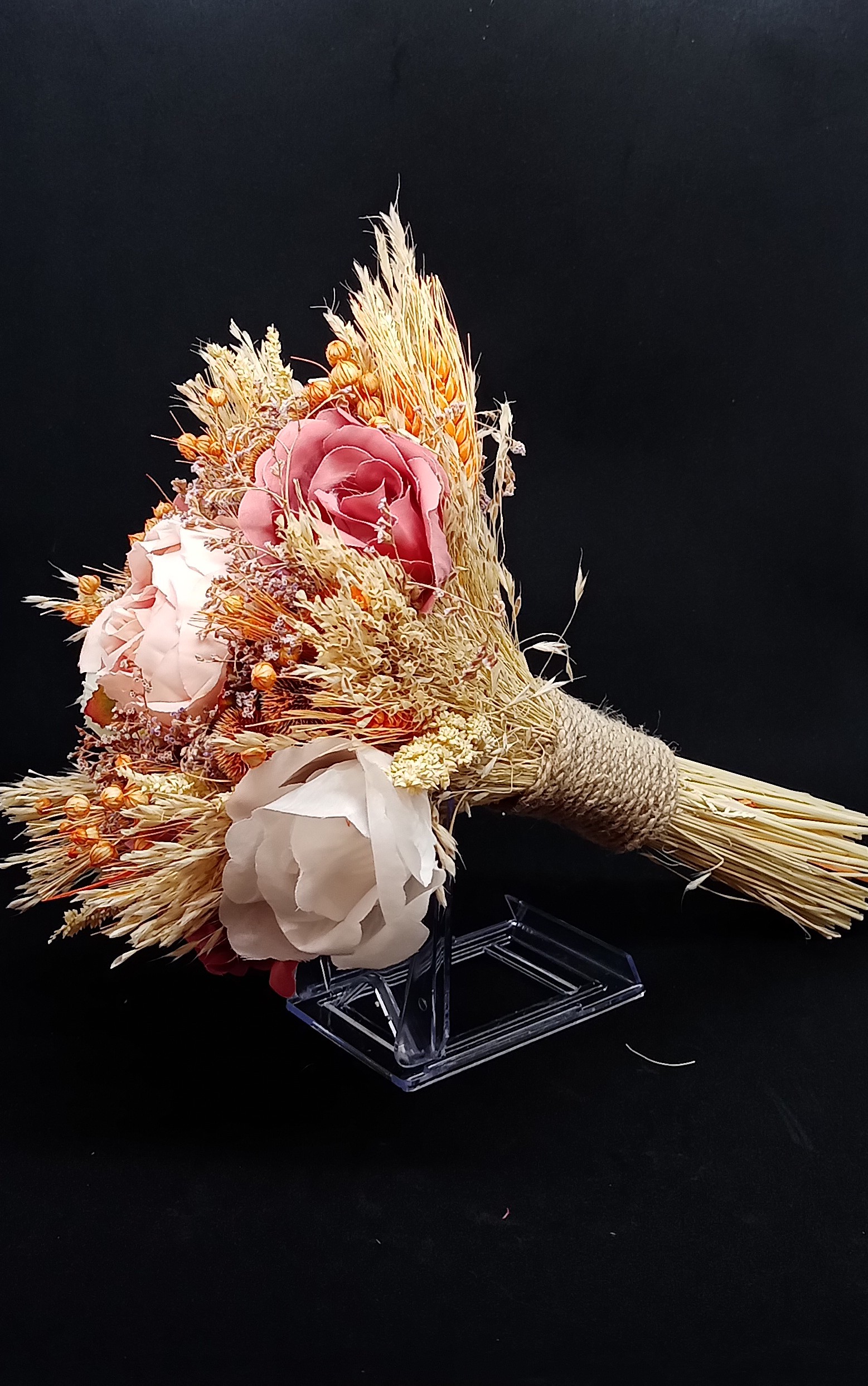 Başaklar Ve Turuncu Cipsolarla Süslenmiş Renkli Gül Gelin Buketi