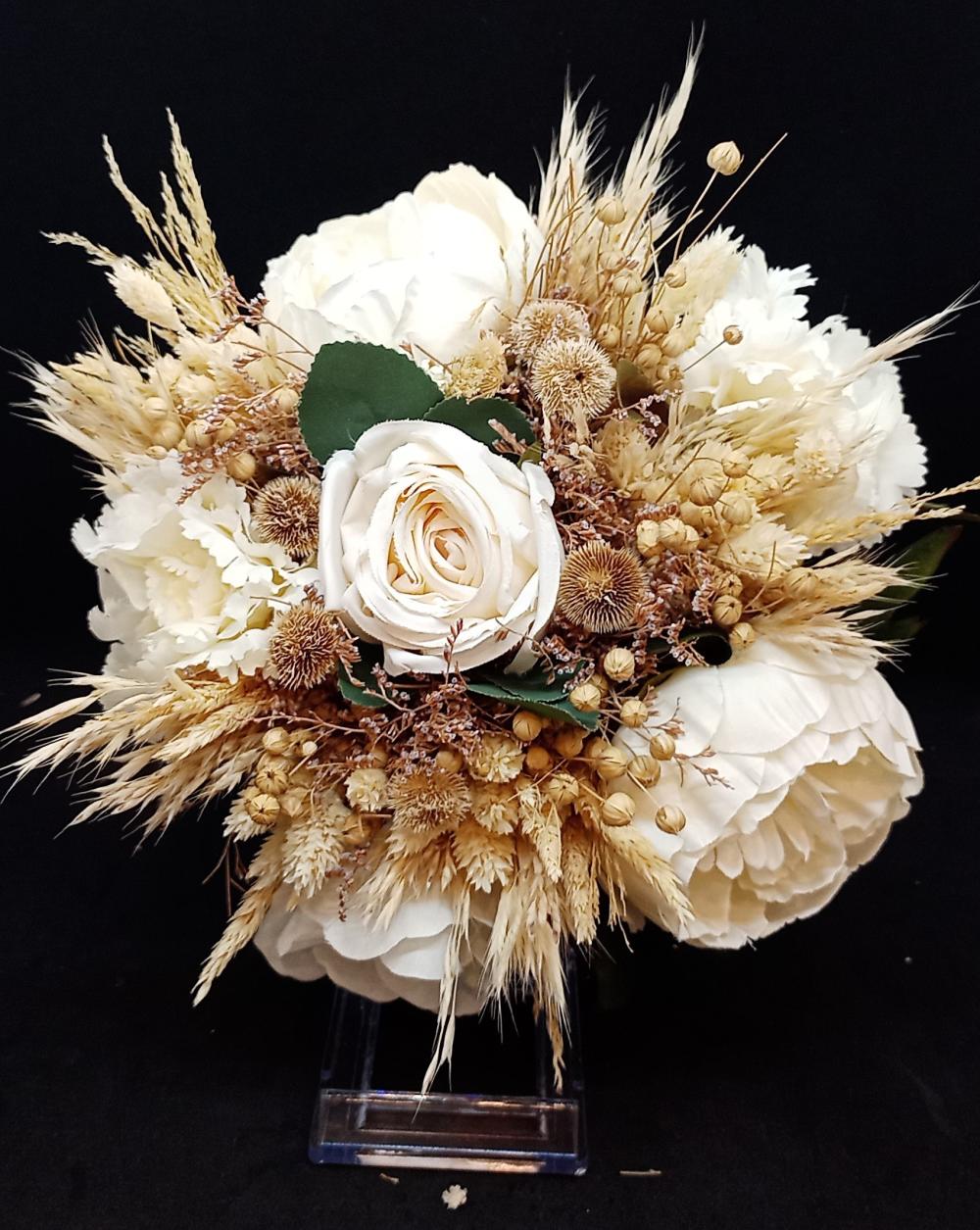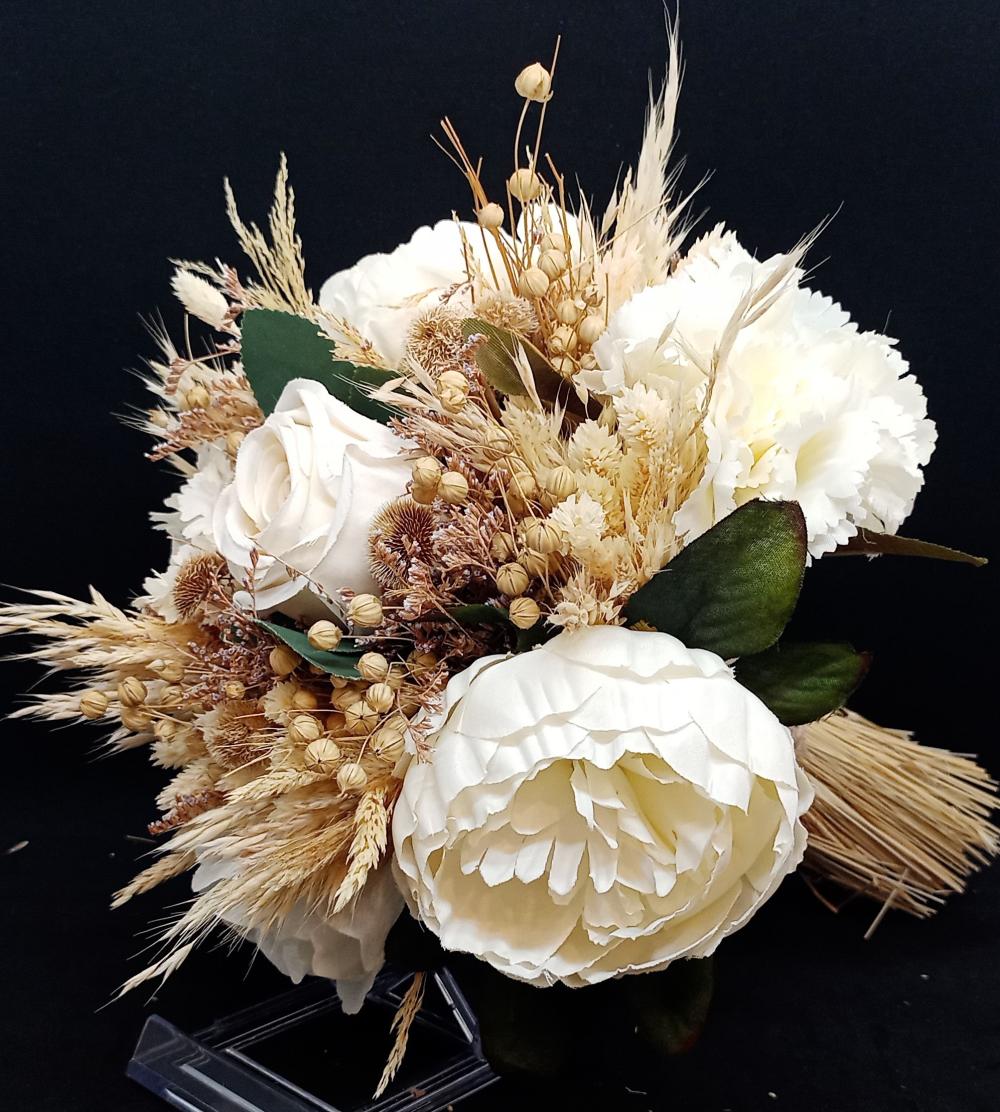 Başaklarla Süslenmiş Beyaz Gül Ve Karanfil Gelin Buketi