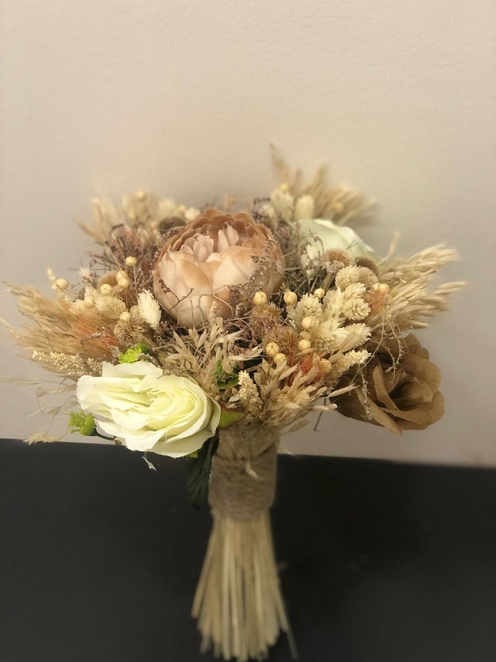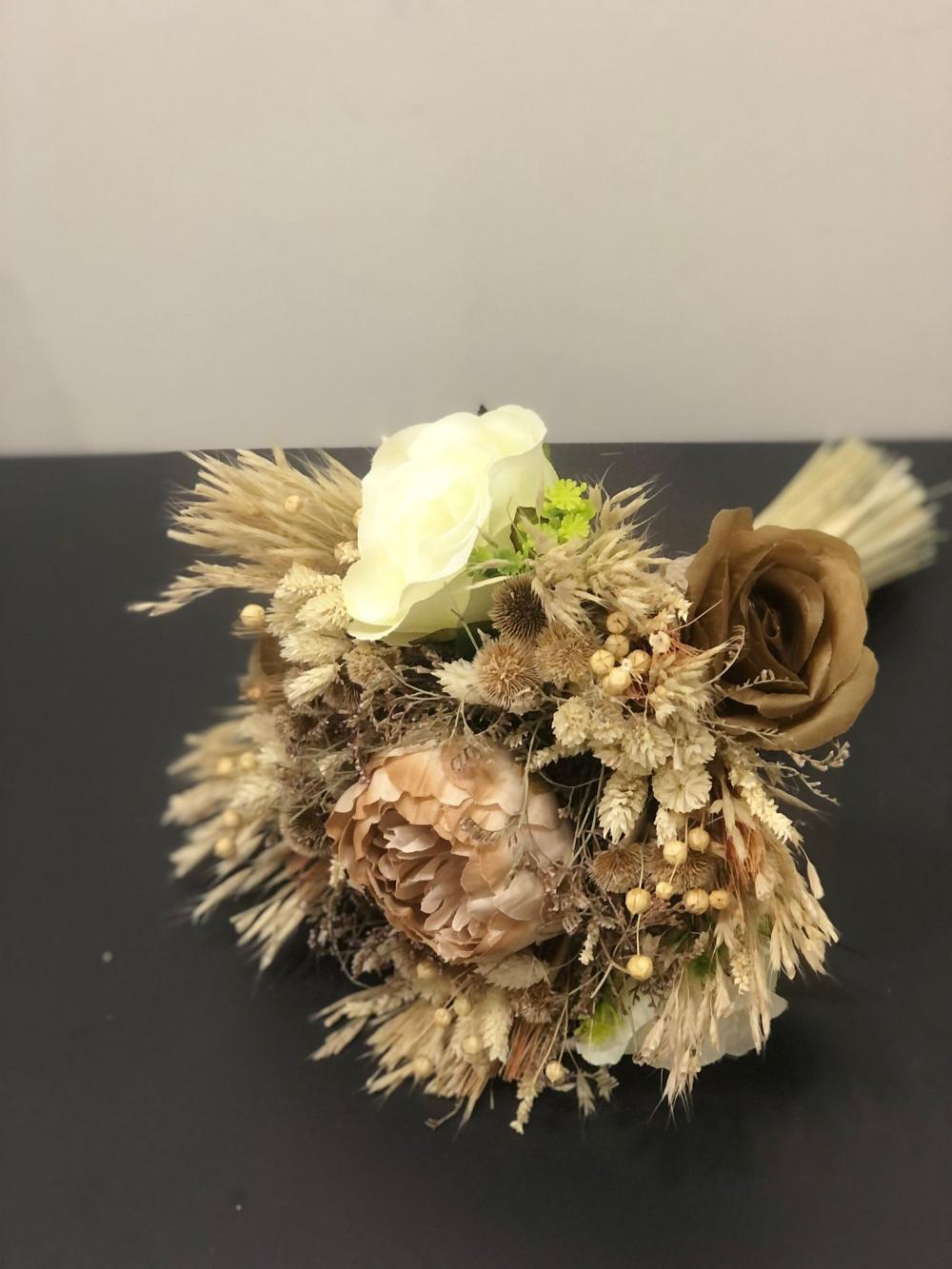 Kahve, bej ve beyaz renk güllerden oluşan yapay gelin buketi.