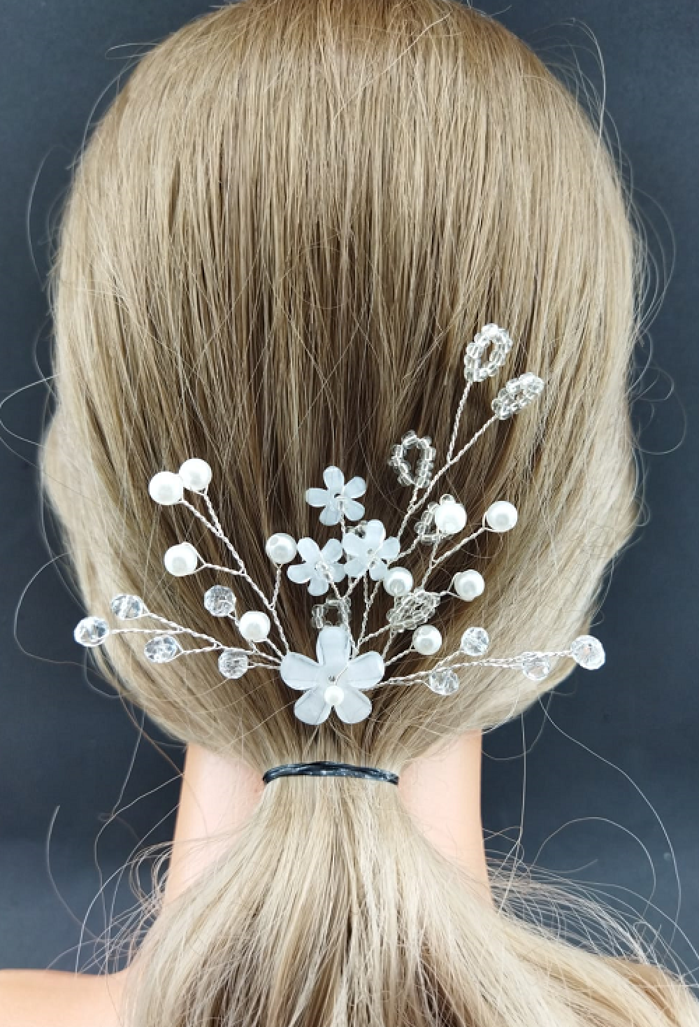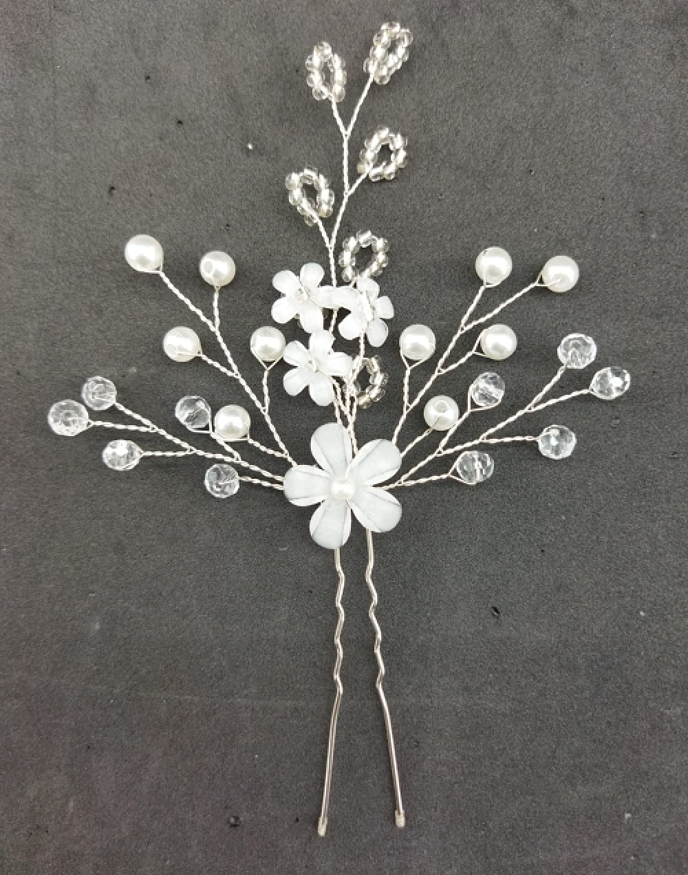 Beyaz Çiçek Detaylı İnci Ve Kristallerle Süslenmiş Gelin Tokası
