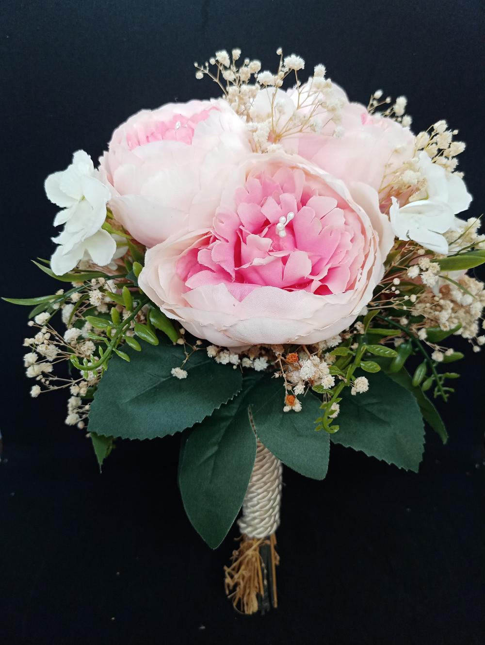 Beyaz Çiçekler Ve Yapraklarla Süslenmiş Pembe Gül Gelin Buketi