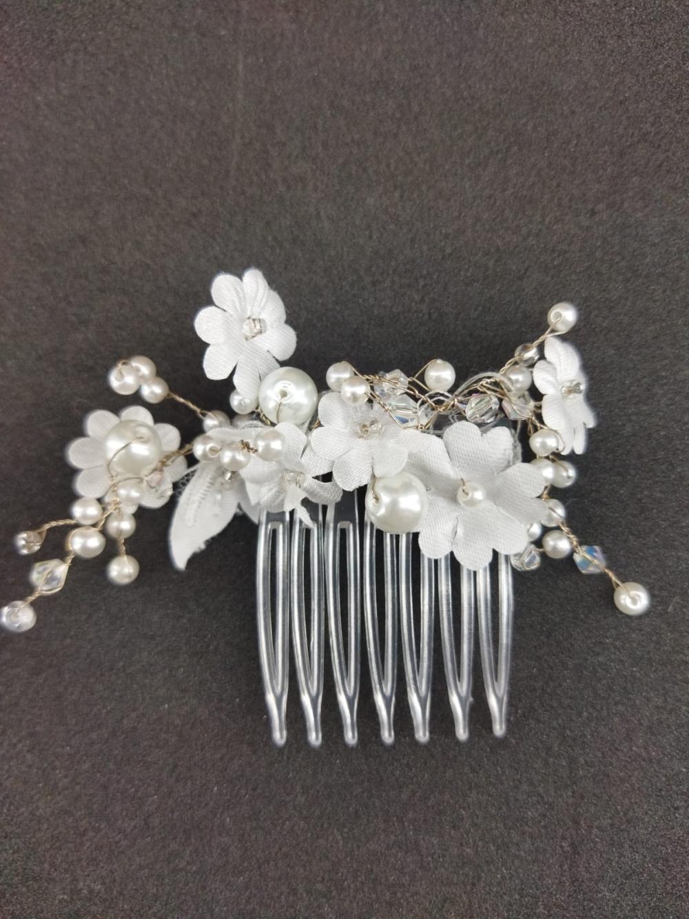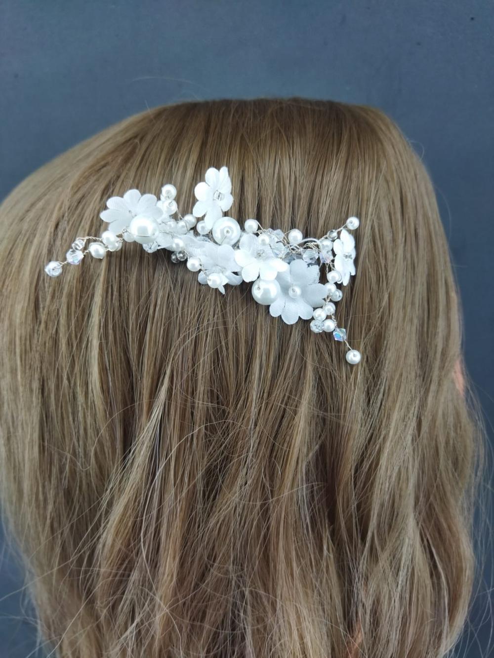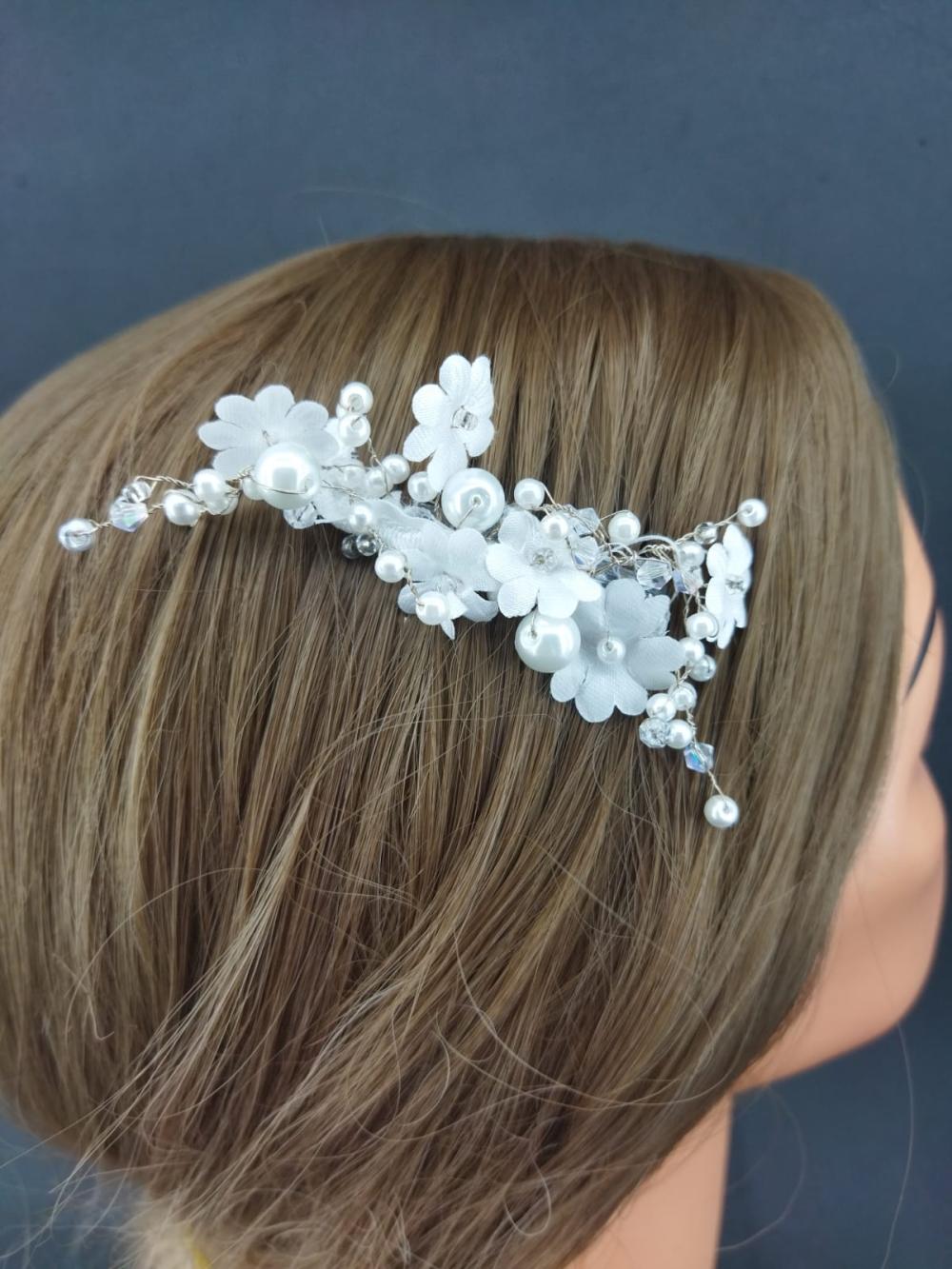 Beyaz Çiçeklere Sahip İnci Ve Kristal Detaylı Gelin Saç Tokası