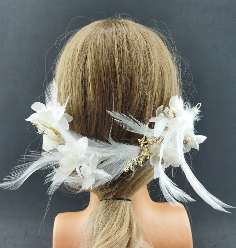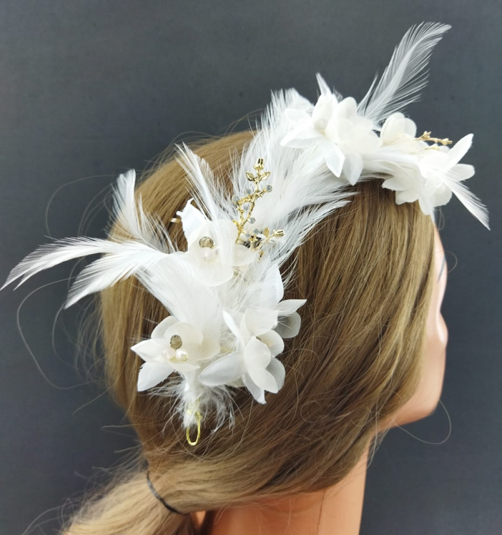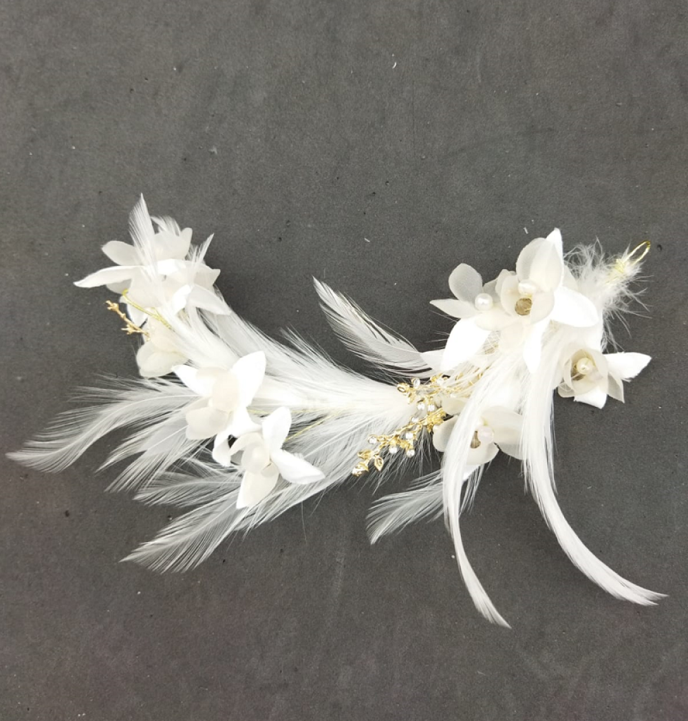 Beyaz Çiçeklerle Süslenmiş Tüy Detaylarına Sahip Şık Gelin Tokası