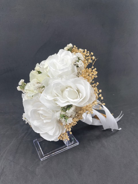 Beyaz Çiçeklerle Ve Cipsolarla Süslenmiş Kurdeleli Gül Buketi