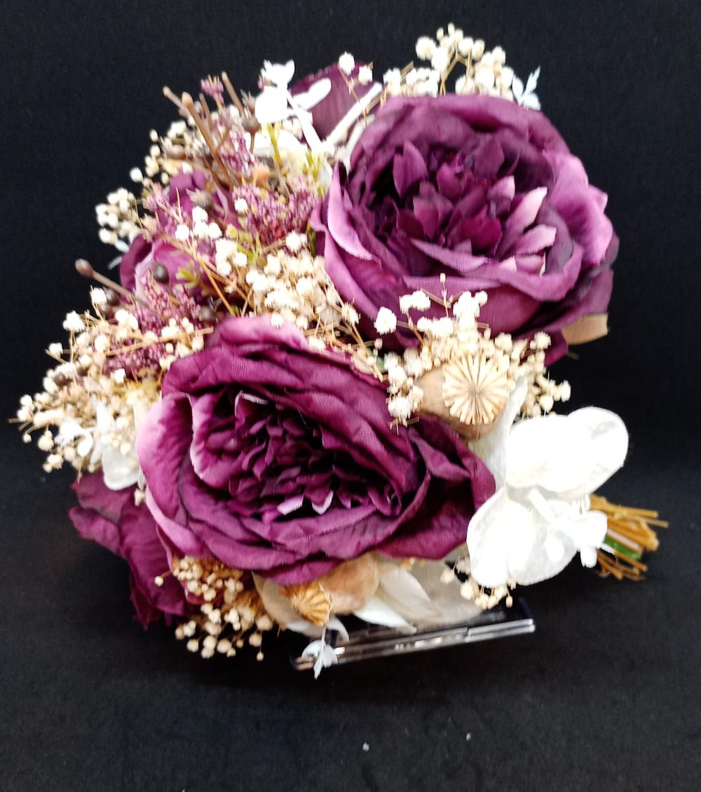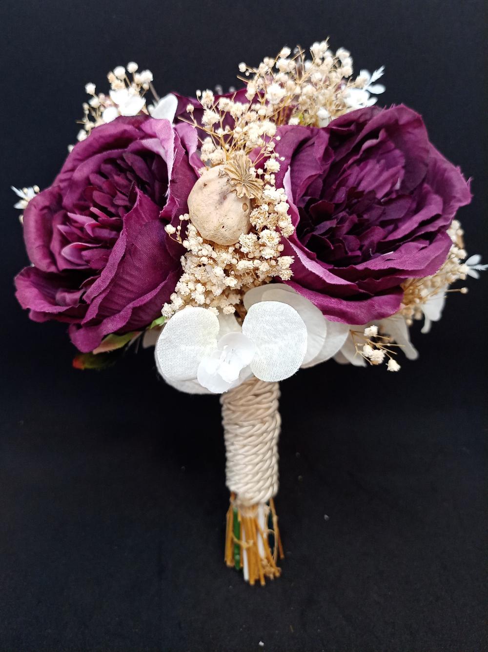 Beyaz Cipsolar Ve Beyaz Çiçeklerle Süslenmiş Mor Gül Gelin Buketi