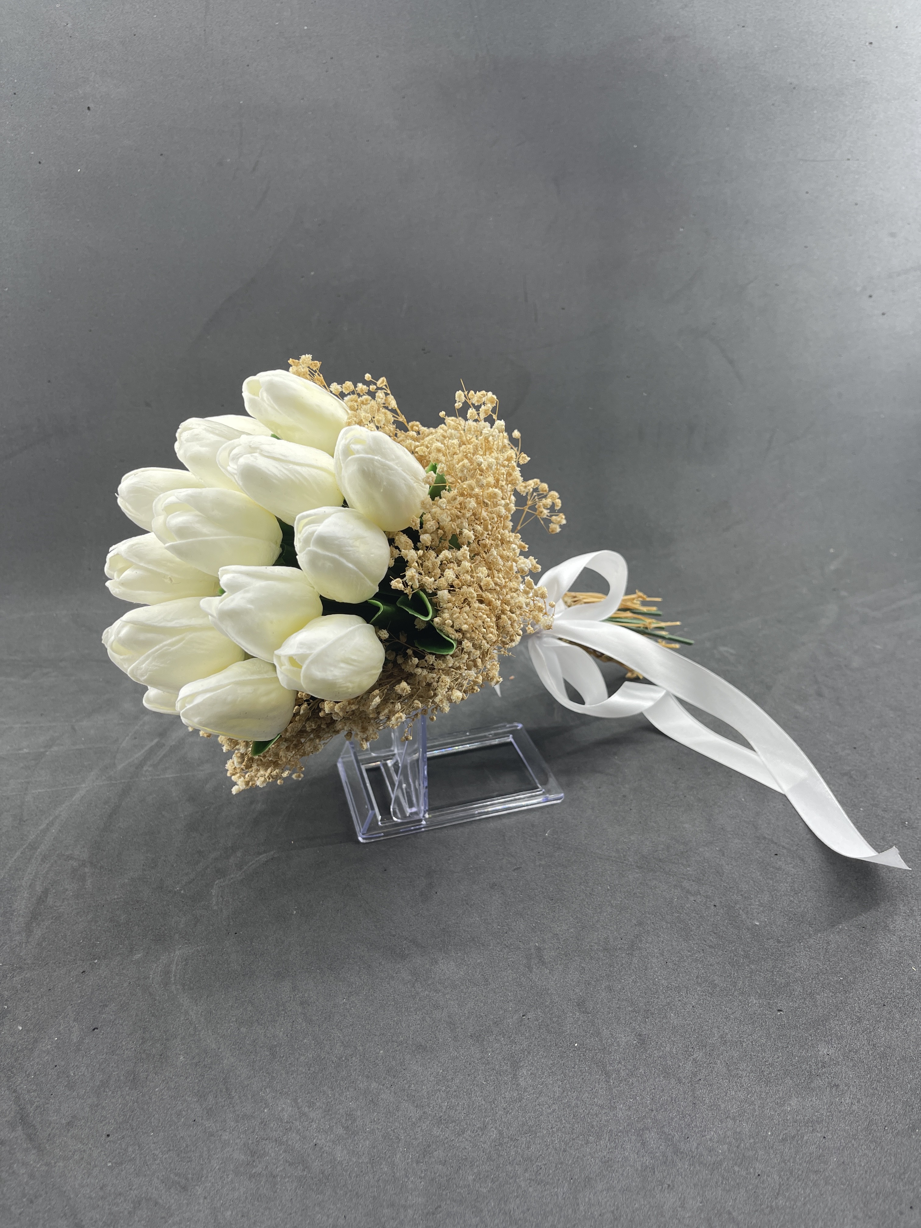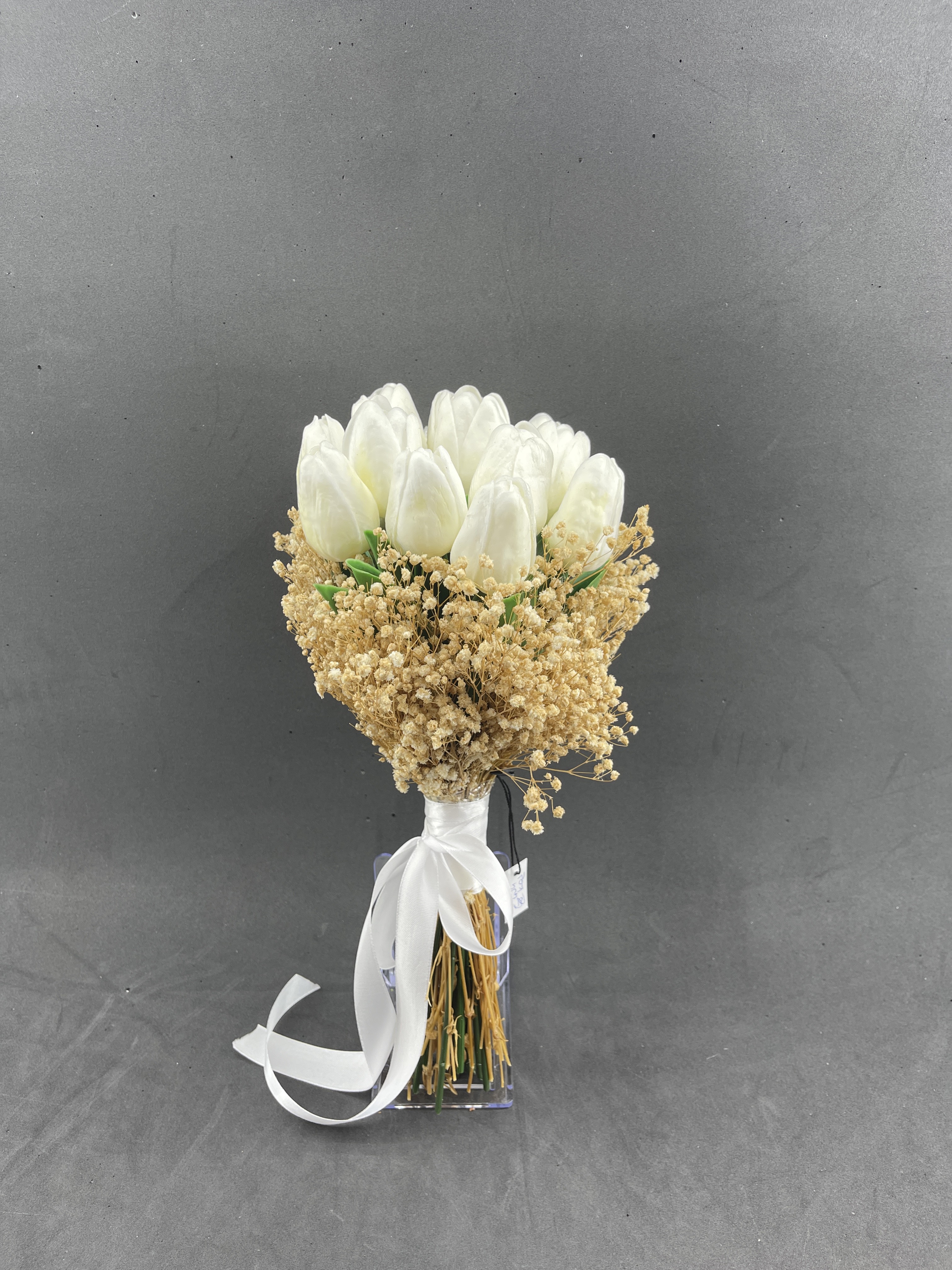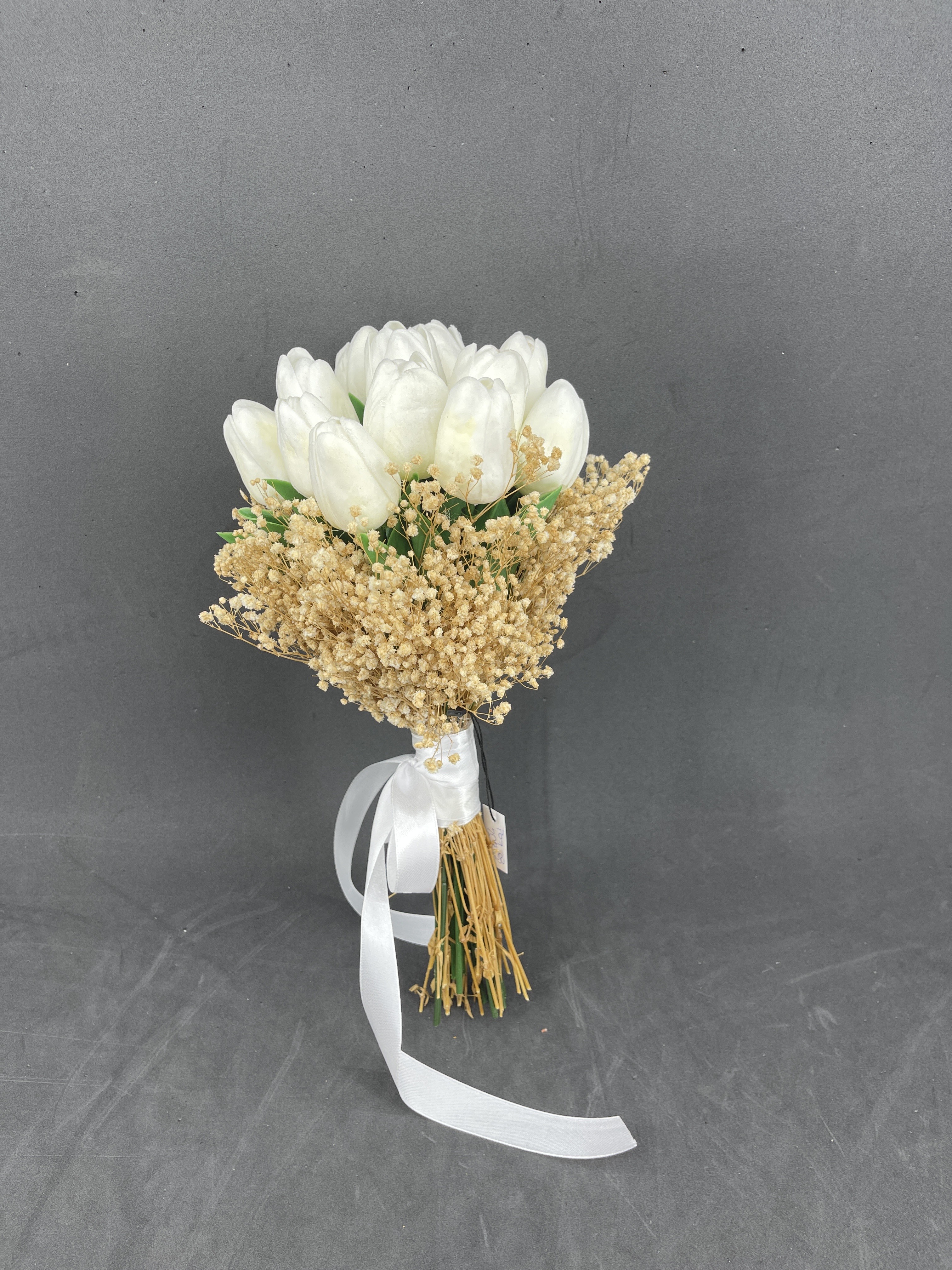 Beyaz Cipsolarladan Oluşan Kurdeleli Lale Gelin Buketi