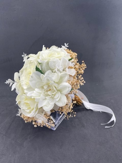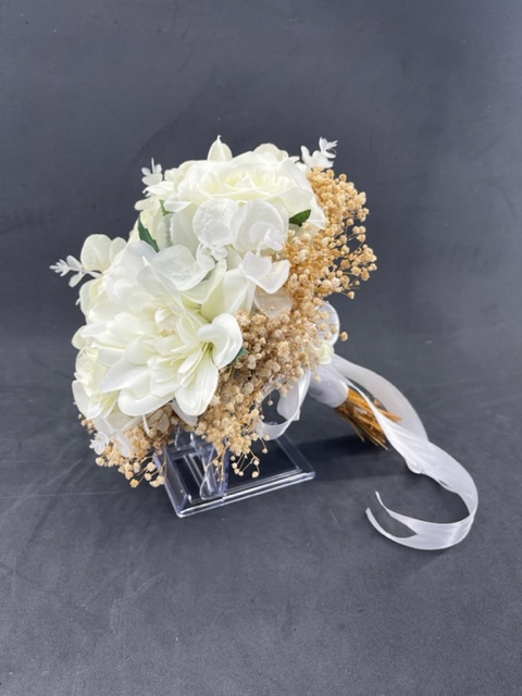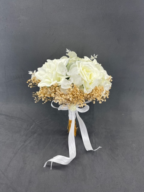 Beyaz Cipsolarla Süslenmiş Kurdeleli Gardenya Gelin Buketi
