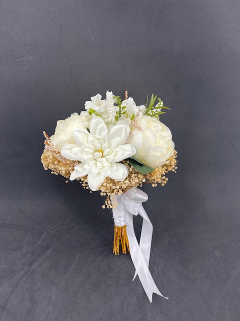 Beyaz Cipsolarla Ve Gardenyalarla Süslenmiş Şakayık Gelin Buketi