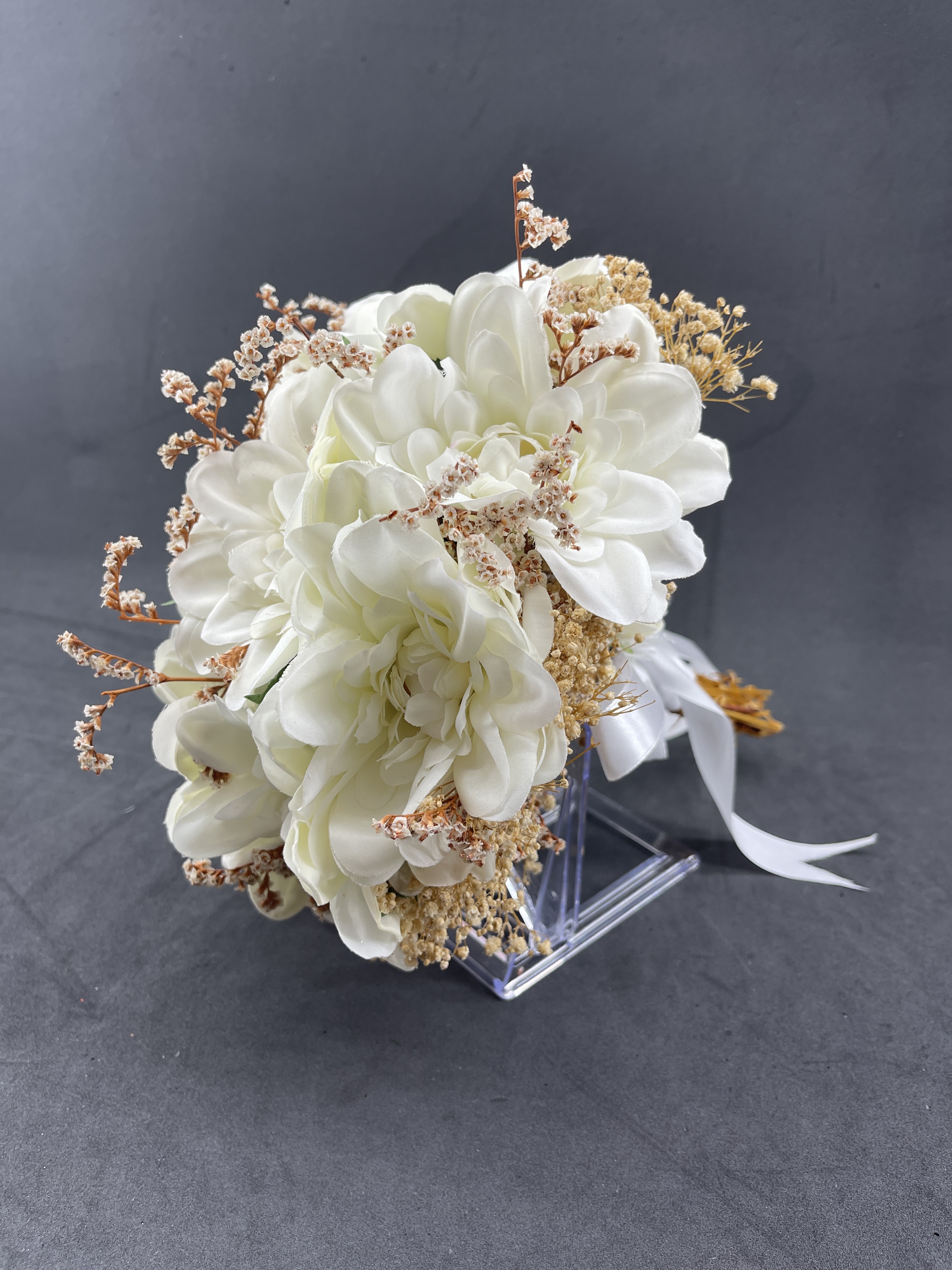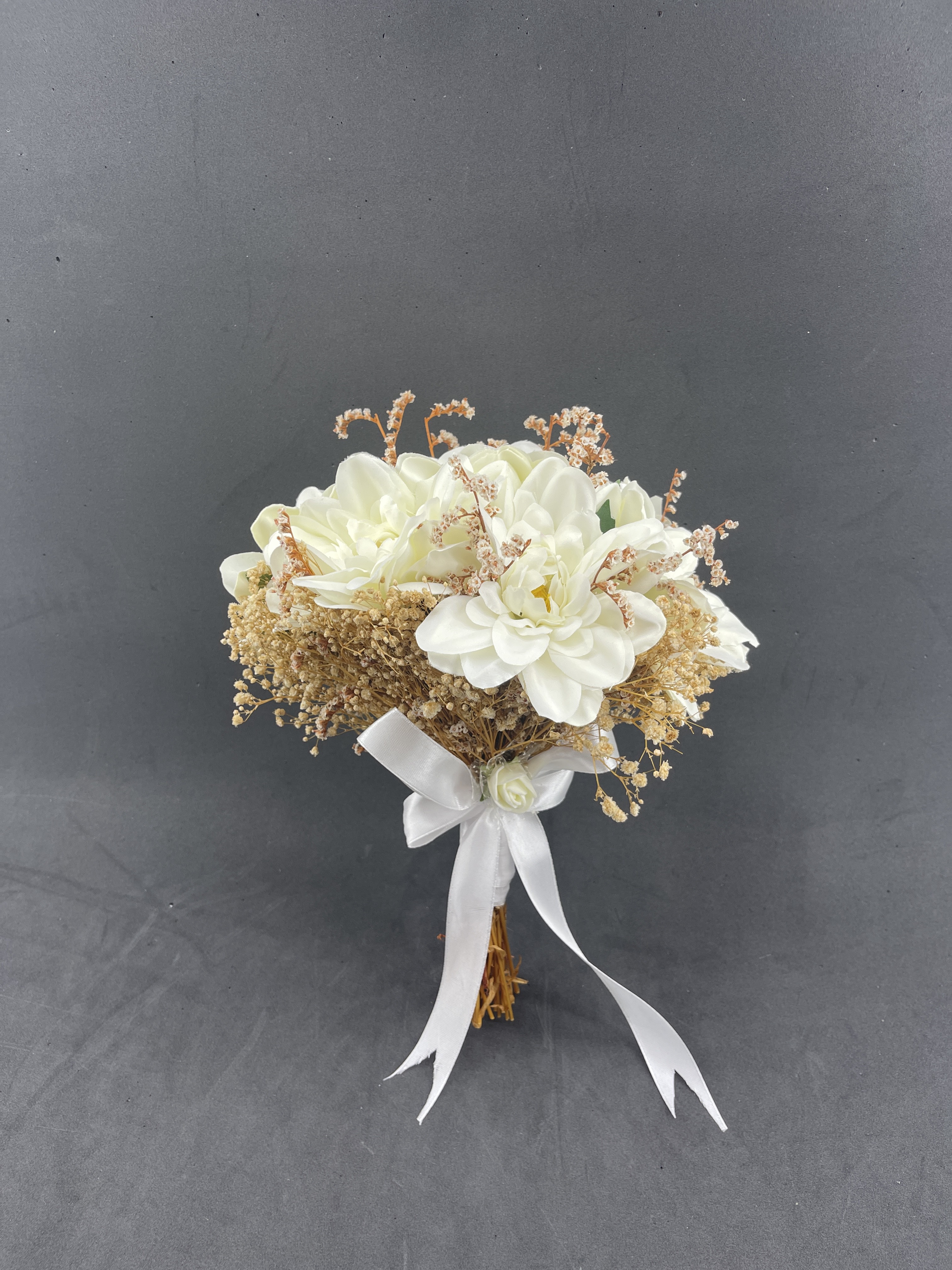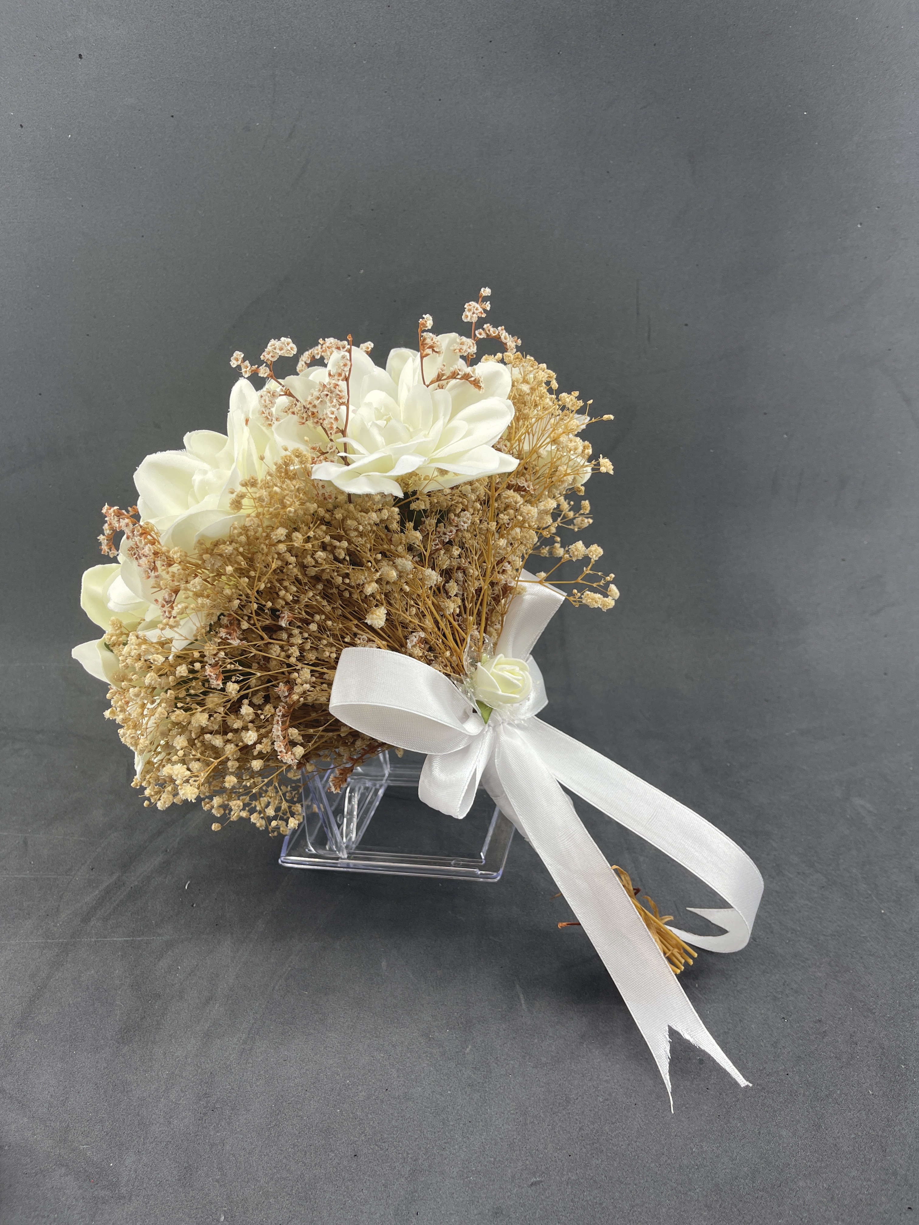 Beyaz Cipsolarla Ve Kır Çiçekleriyle Süslenmiş Gardenya Gül Buketi
