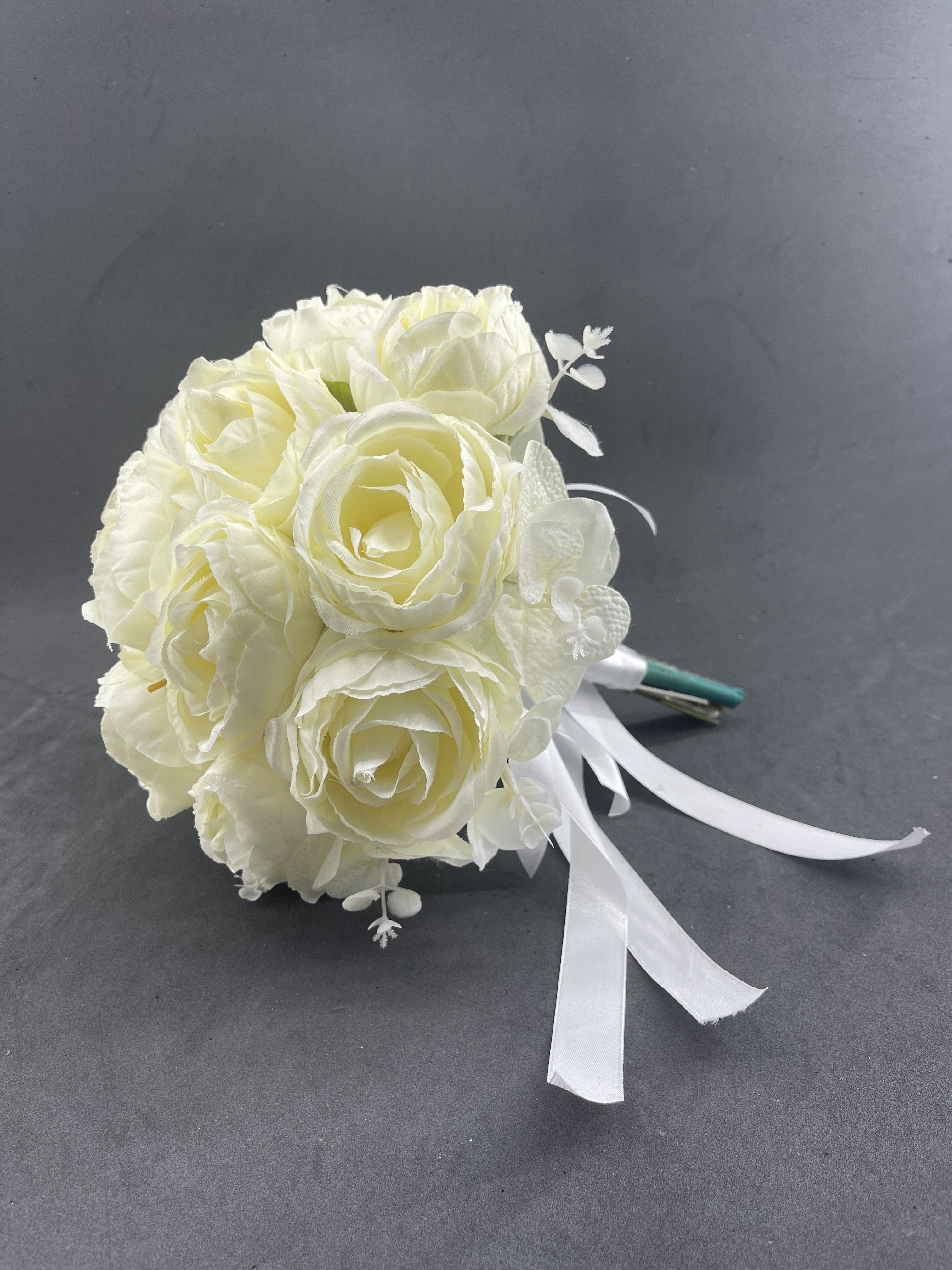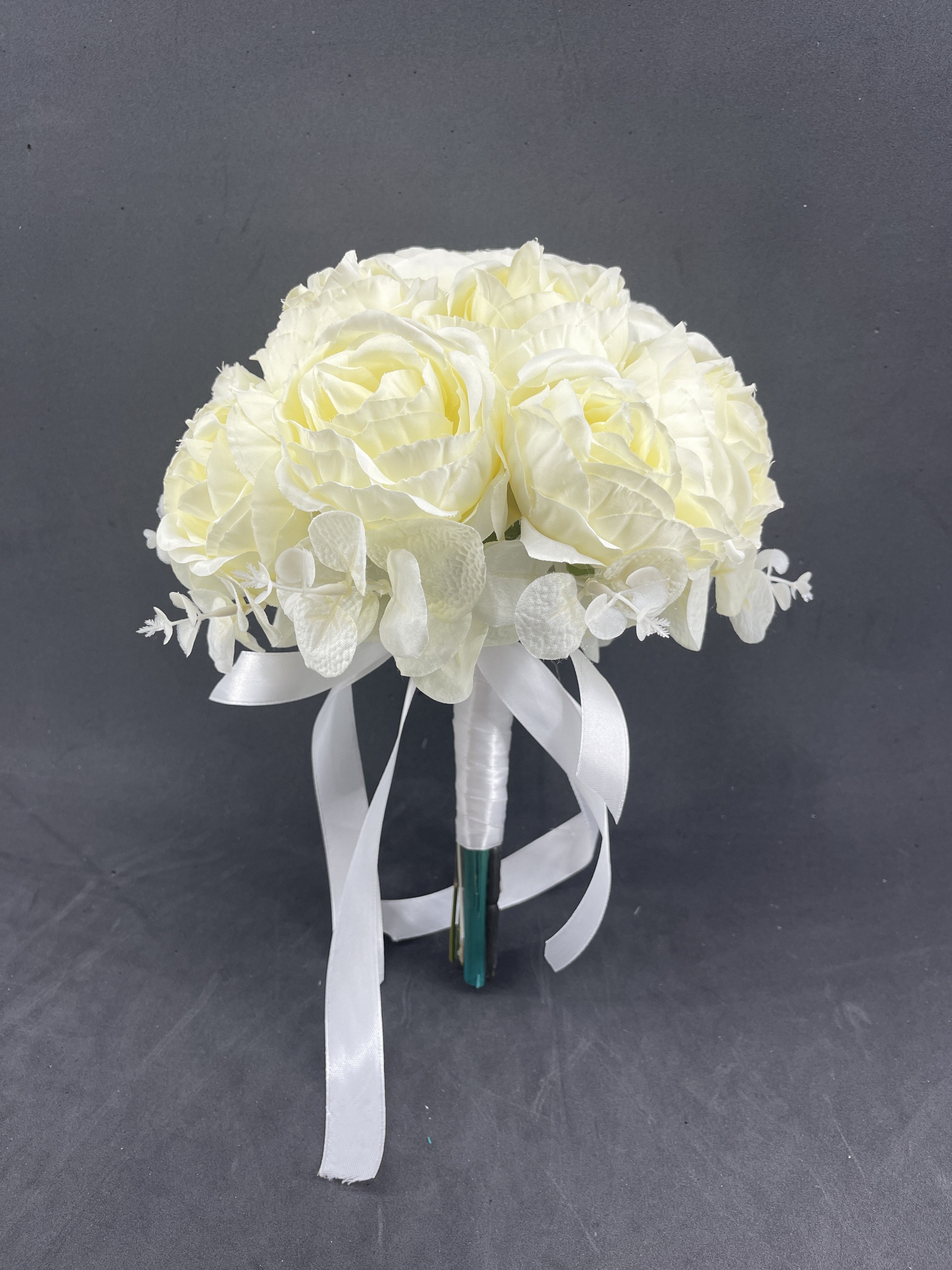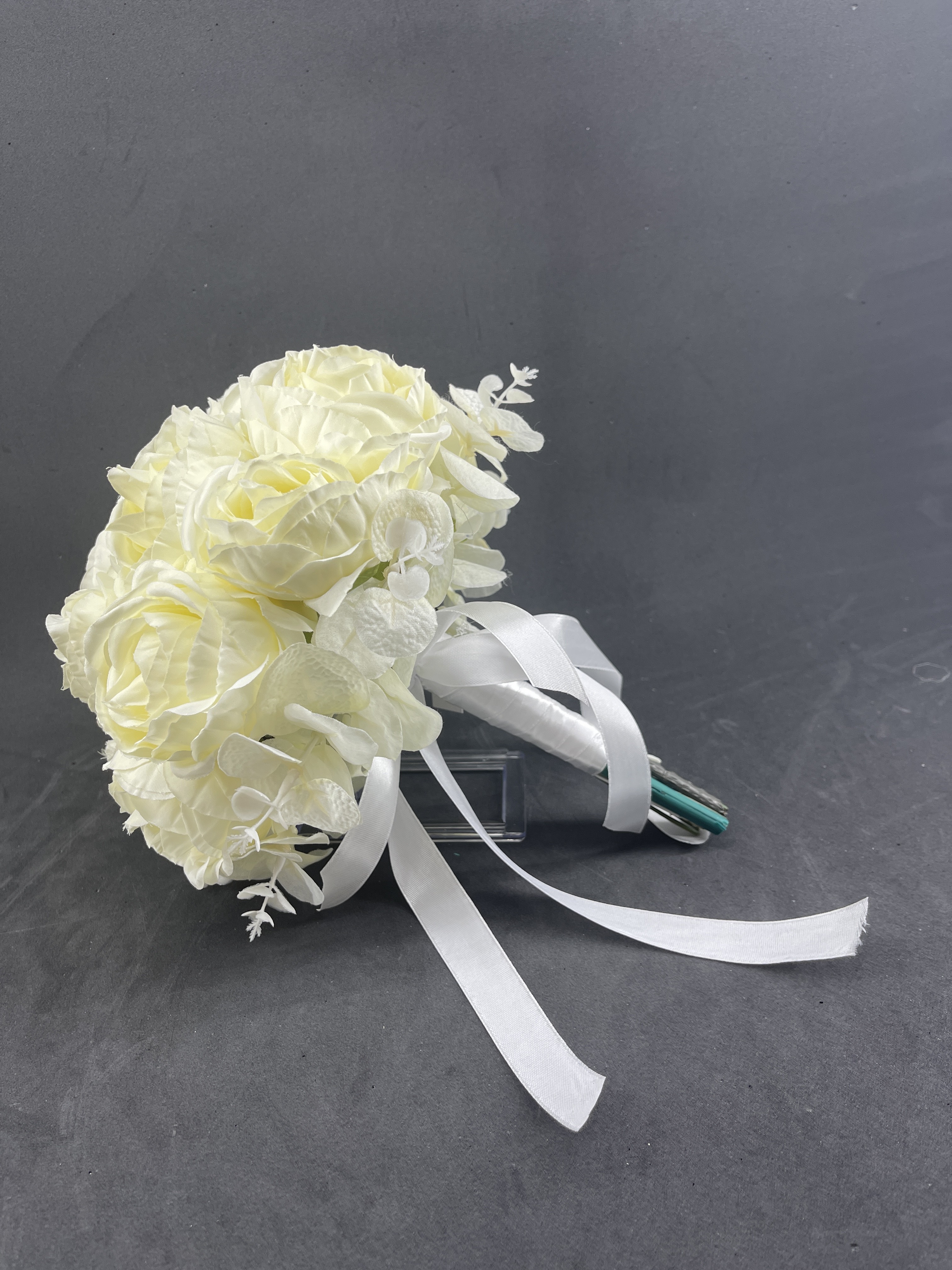 Beyaz Ekru Çiçeklerle Süslenmiş Kurdeleli Gelin Buketi