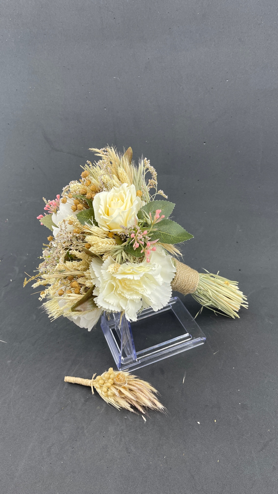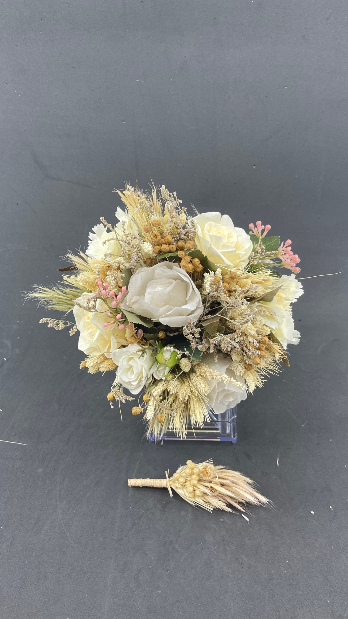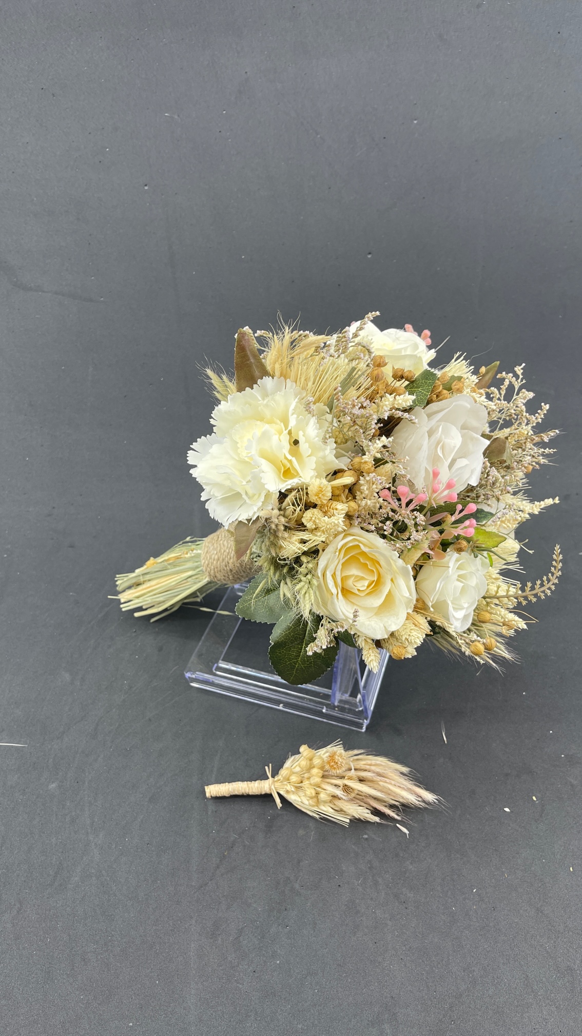 Beyaz Ekru Renklerde Renkli Çiçek Detaylı Gelin Buketi ve Damat Yaka Çiçeği