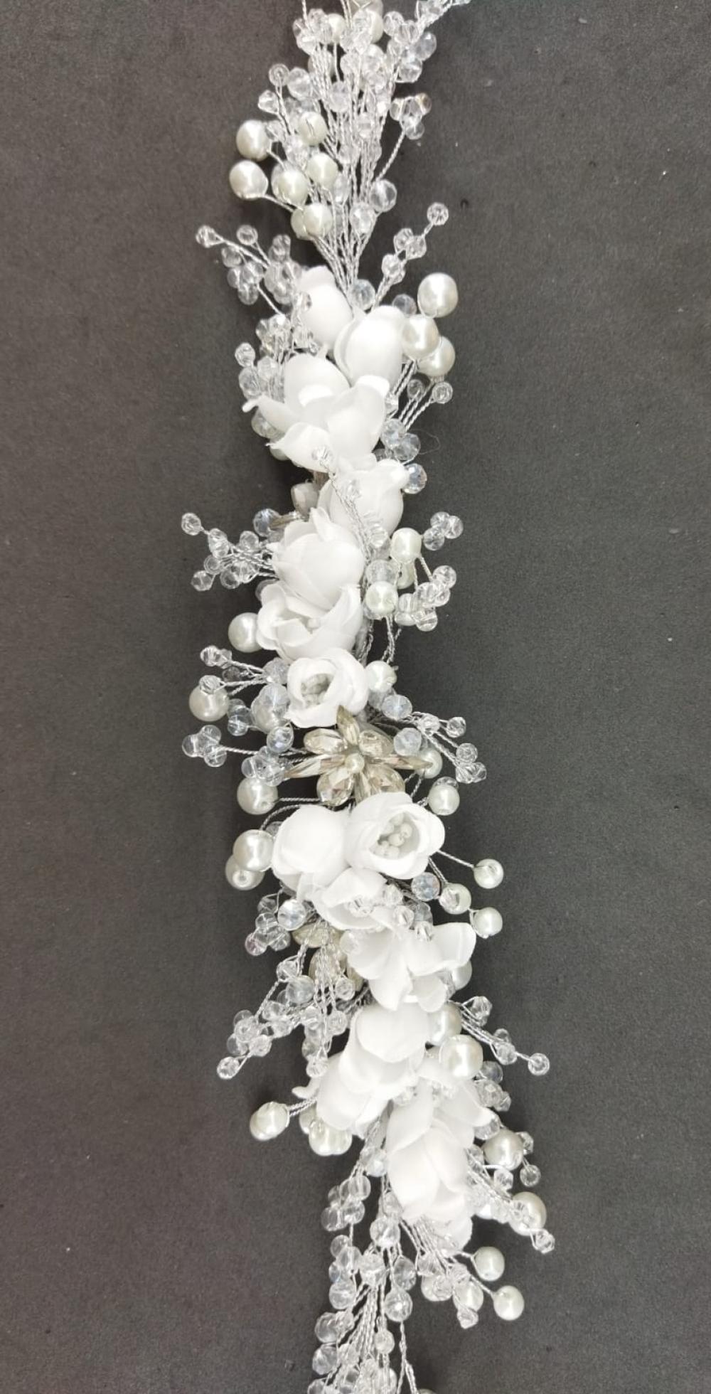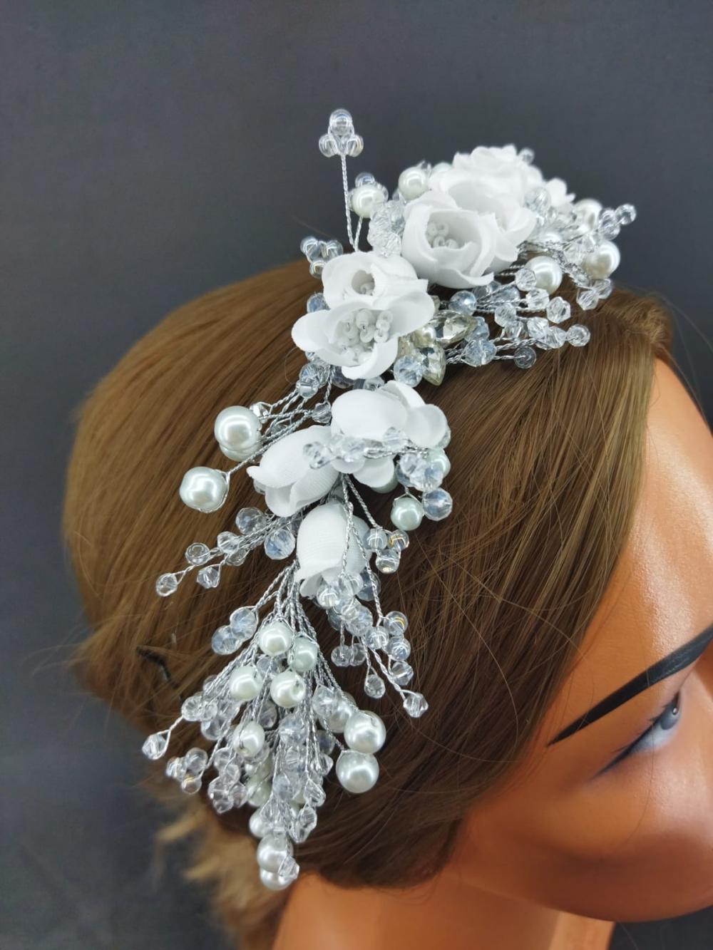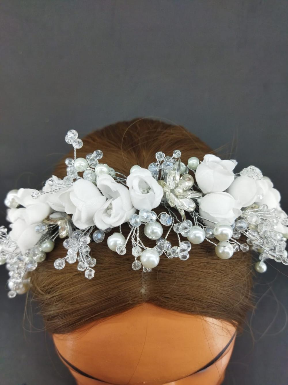 Beyaz Gül Detaylı İnci Ve Kristallerle Süslenmiş Gelin Tacı