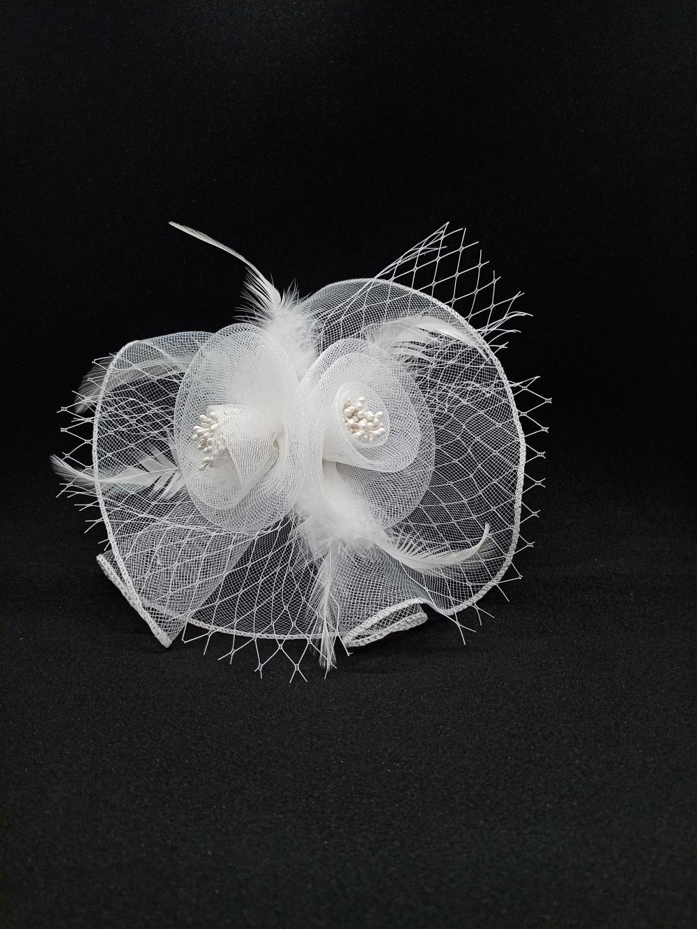 İnce tül ve kafes tül karışımlı tüy detayına sahip vualet nikah şapkası.
