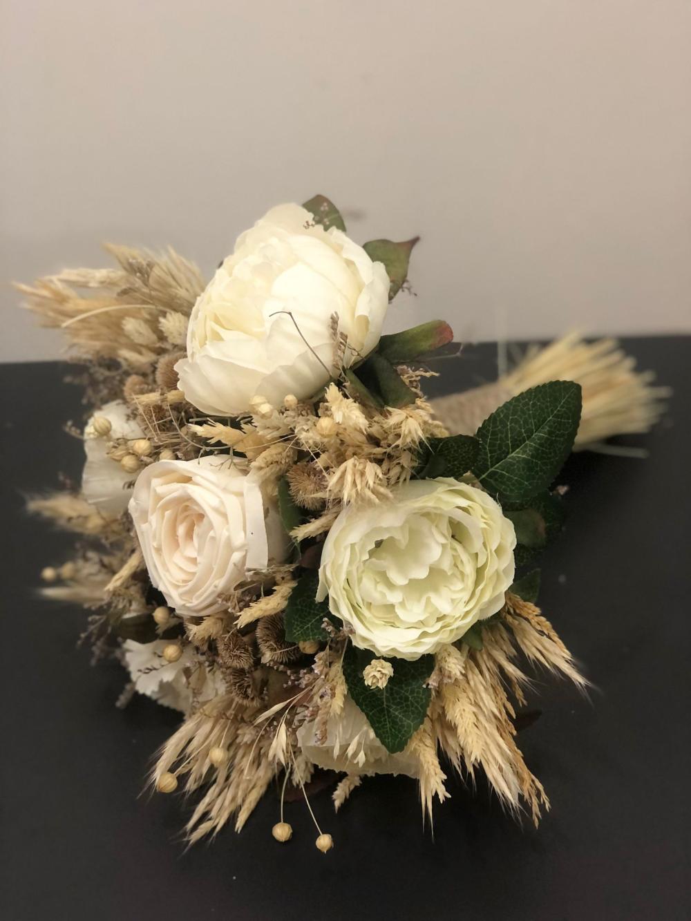 Kahve rengi tonlarına sahip beyaz güllerden oluşan yapay gelin buketi.