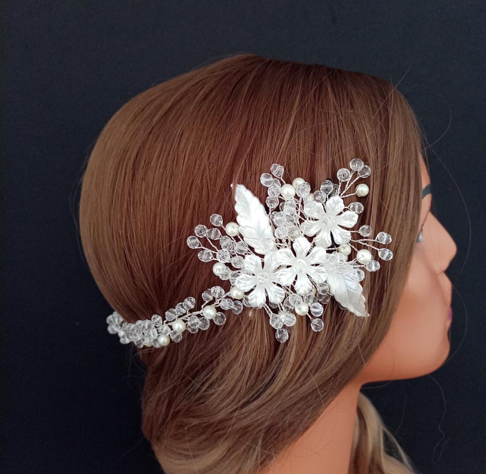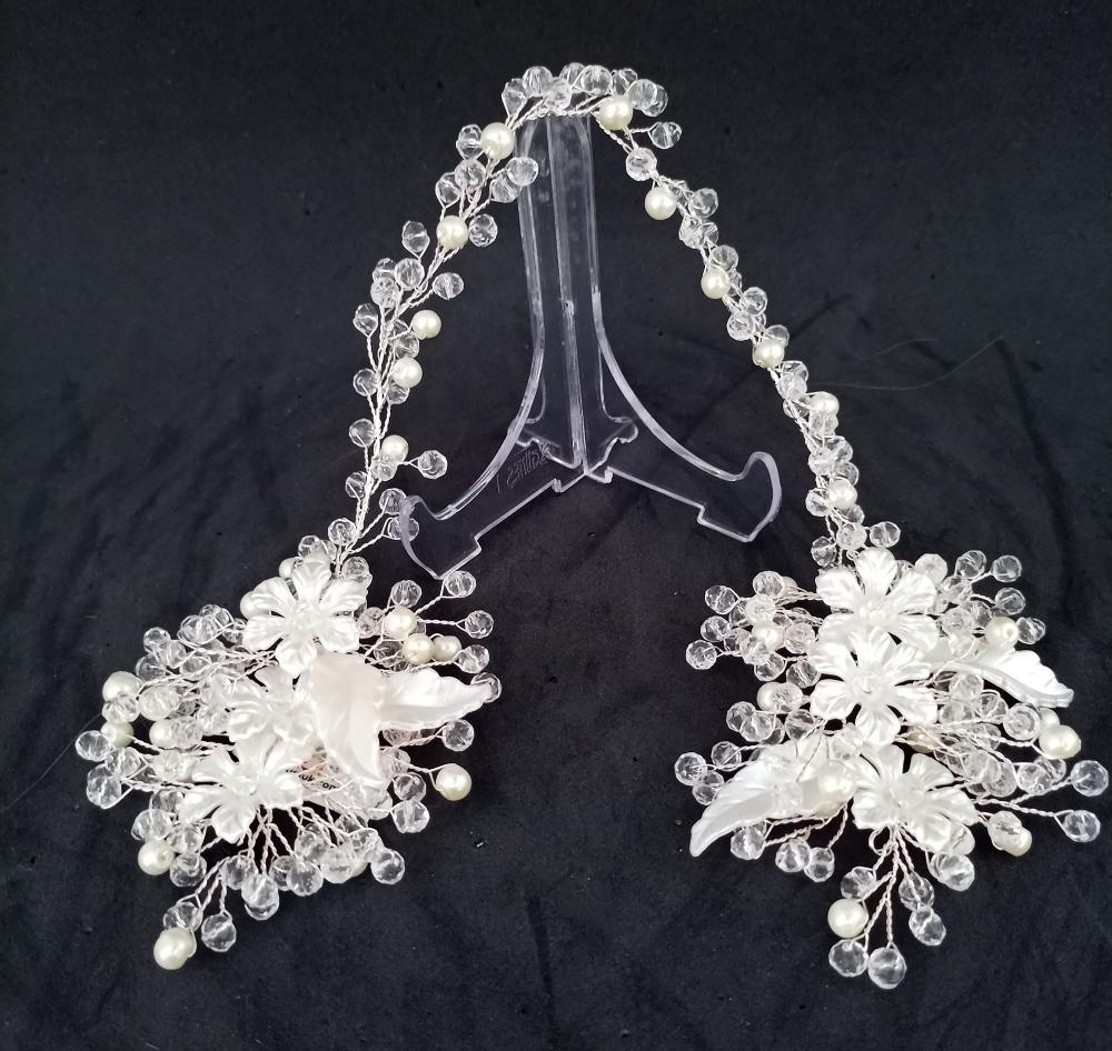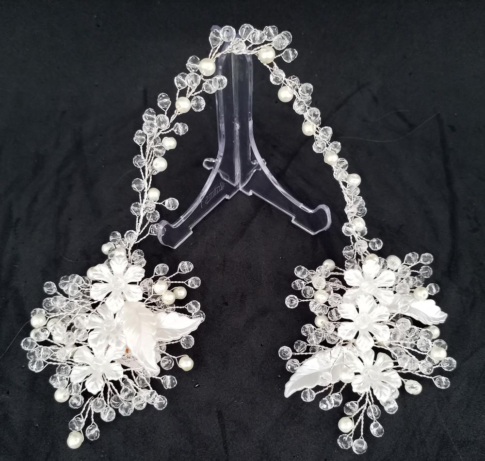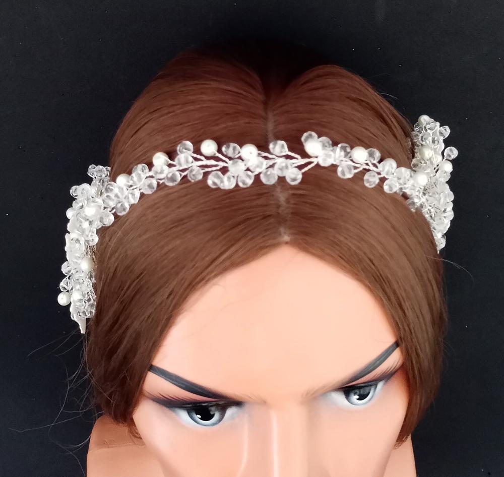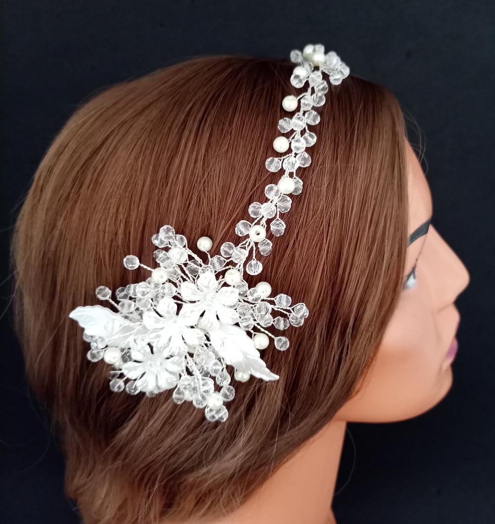 Beyaz İnci Kristal Ve Çiçek Detaylı Gelin Tacı