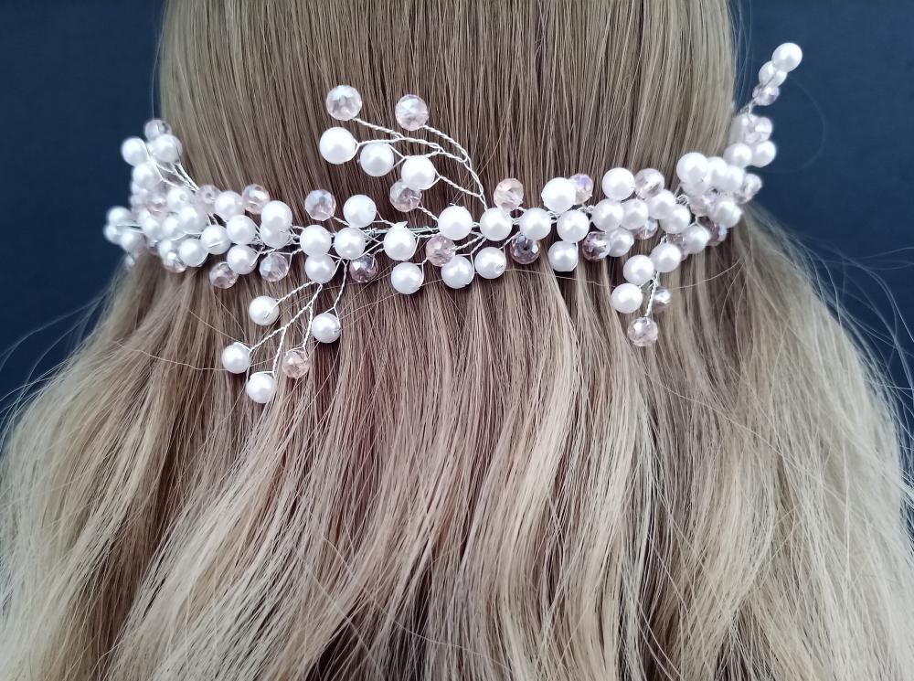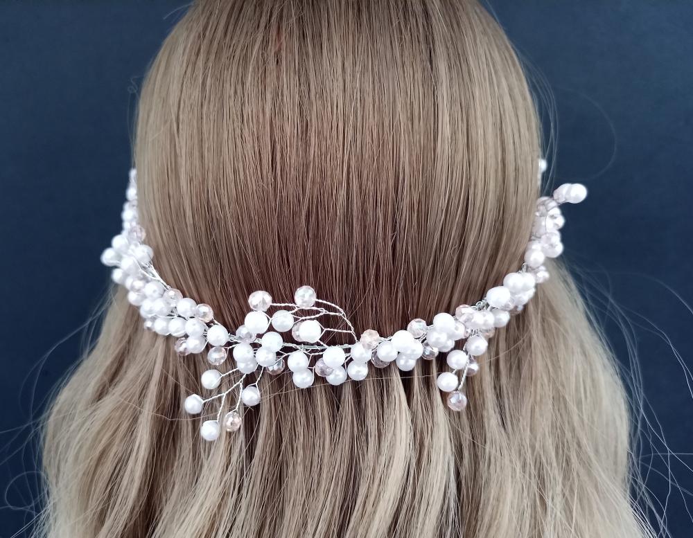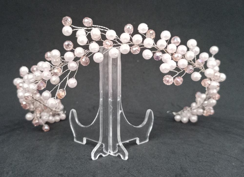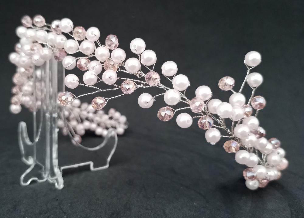Beyaz İnci Ve Pembe Kristallerden Oluşan Gelin Tacı