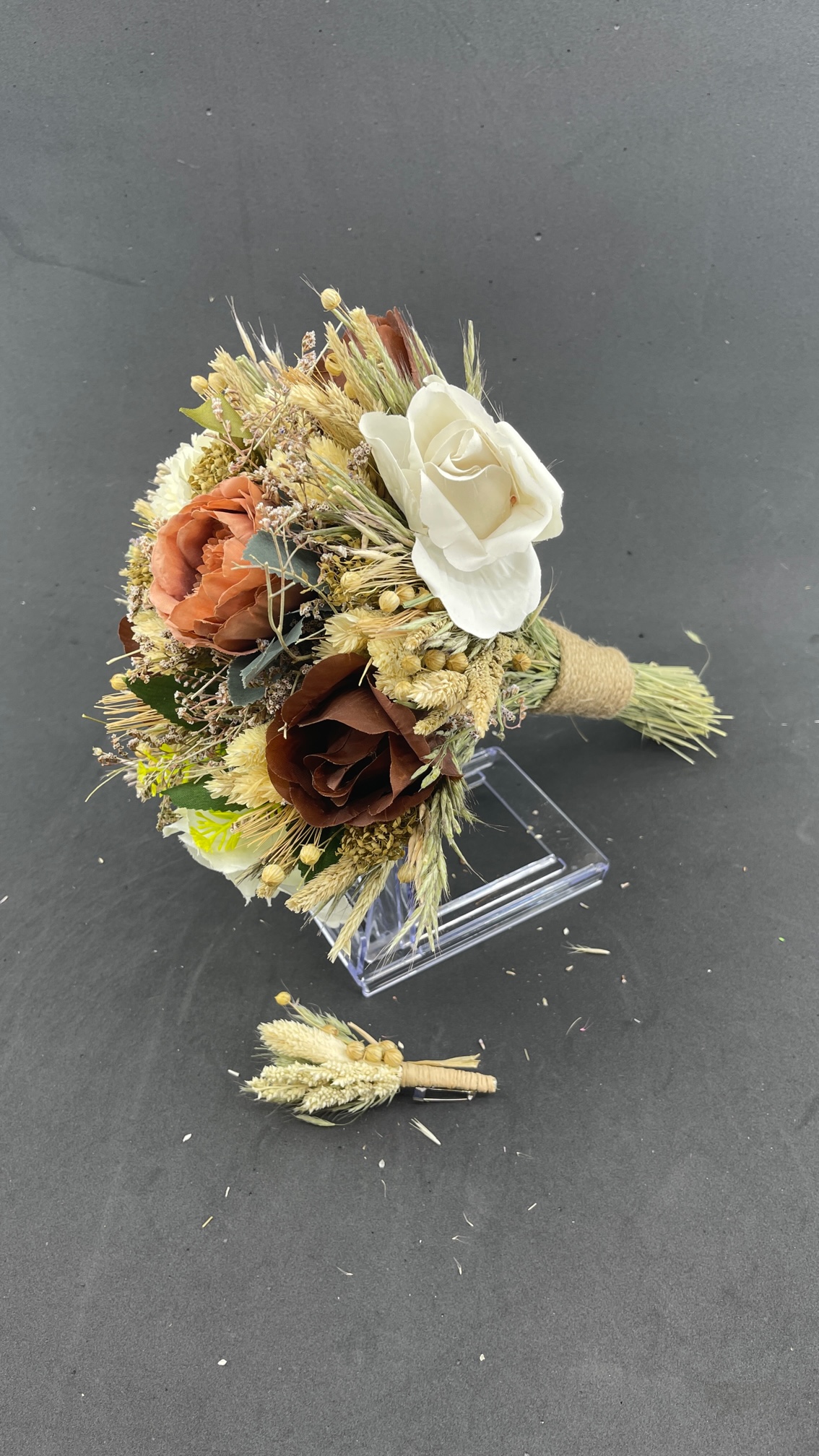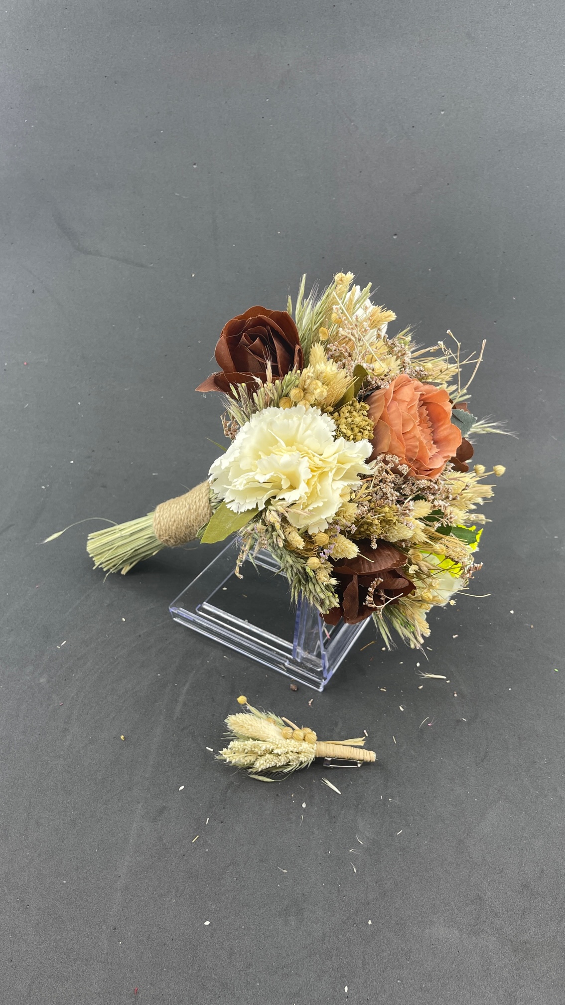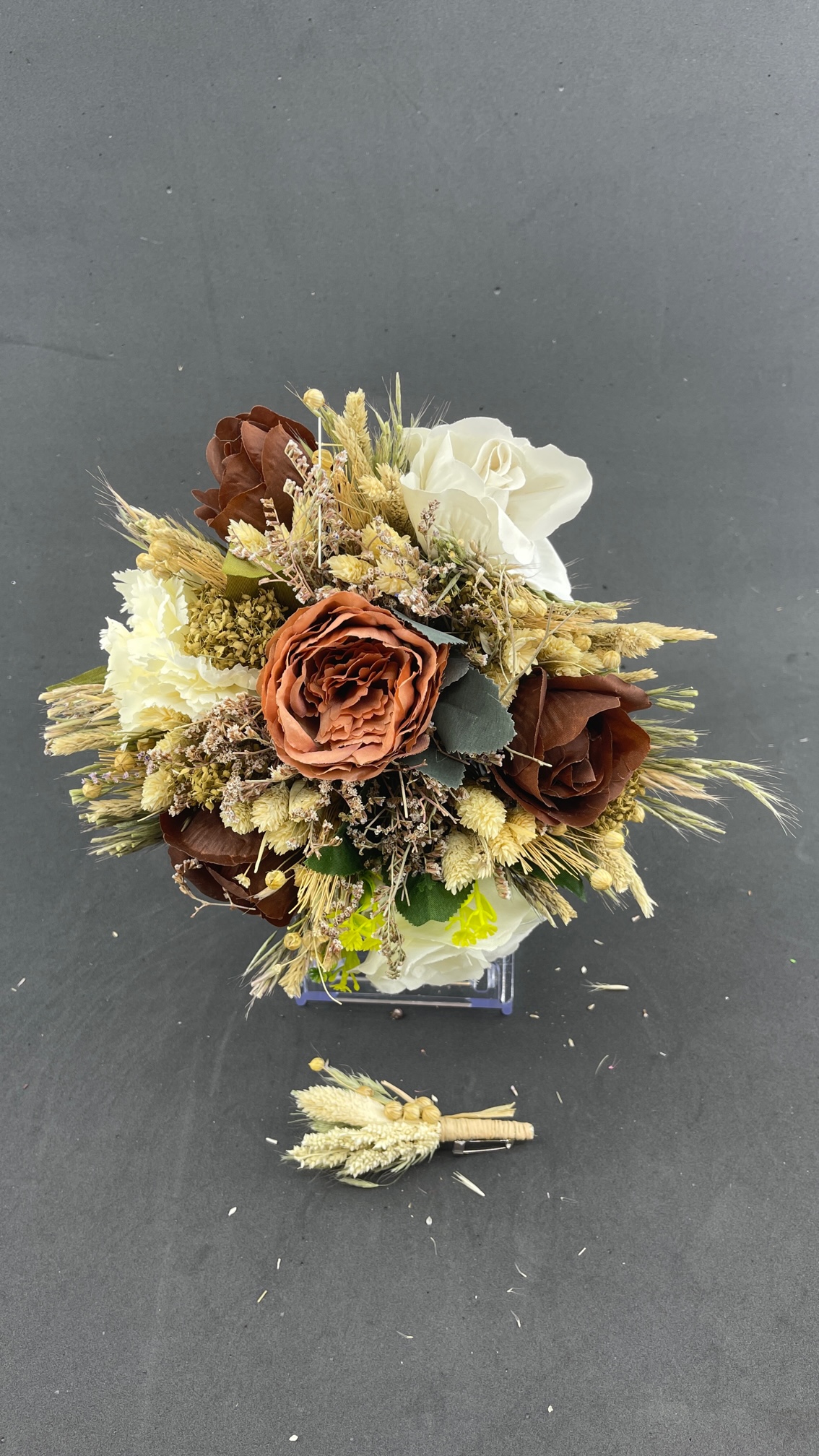 Beyaz Kahve Renklerde Aranjman Gelin Buketi ve Damat Yaka Çiçeği