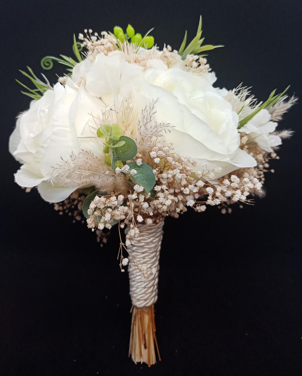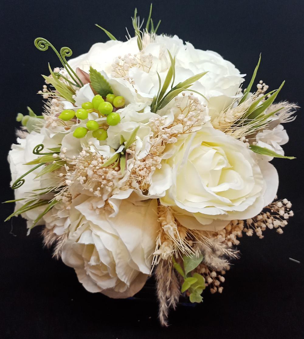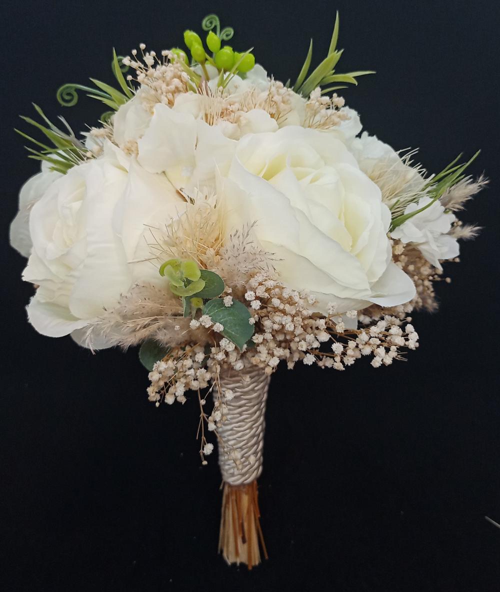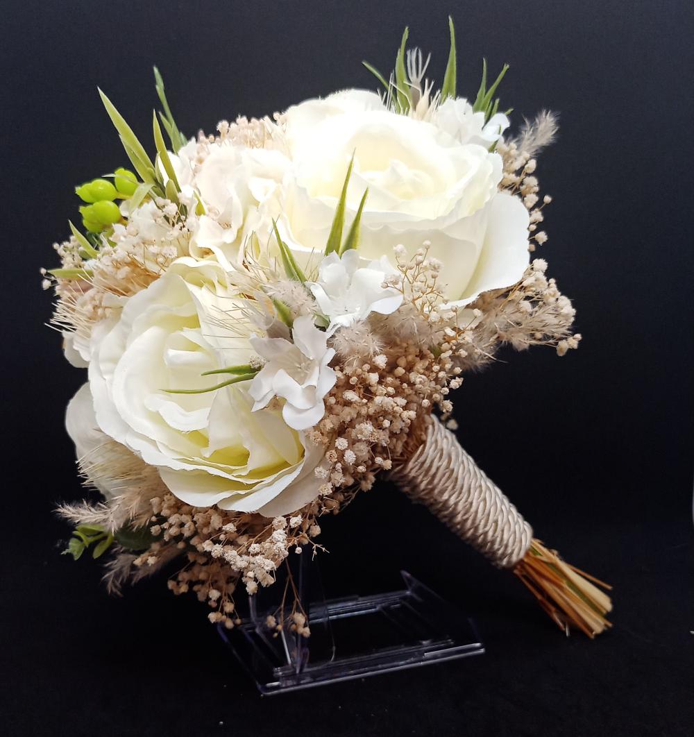 Beyaz cipsolarla süslenmiş yeşil detaylara sahip beyaz gül yapay gelin buketi.