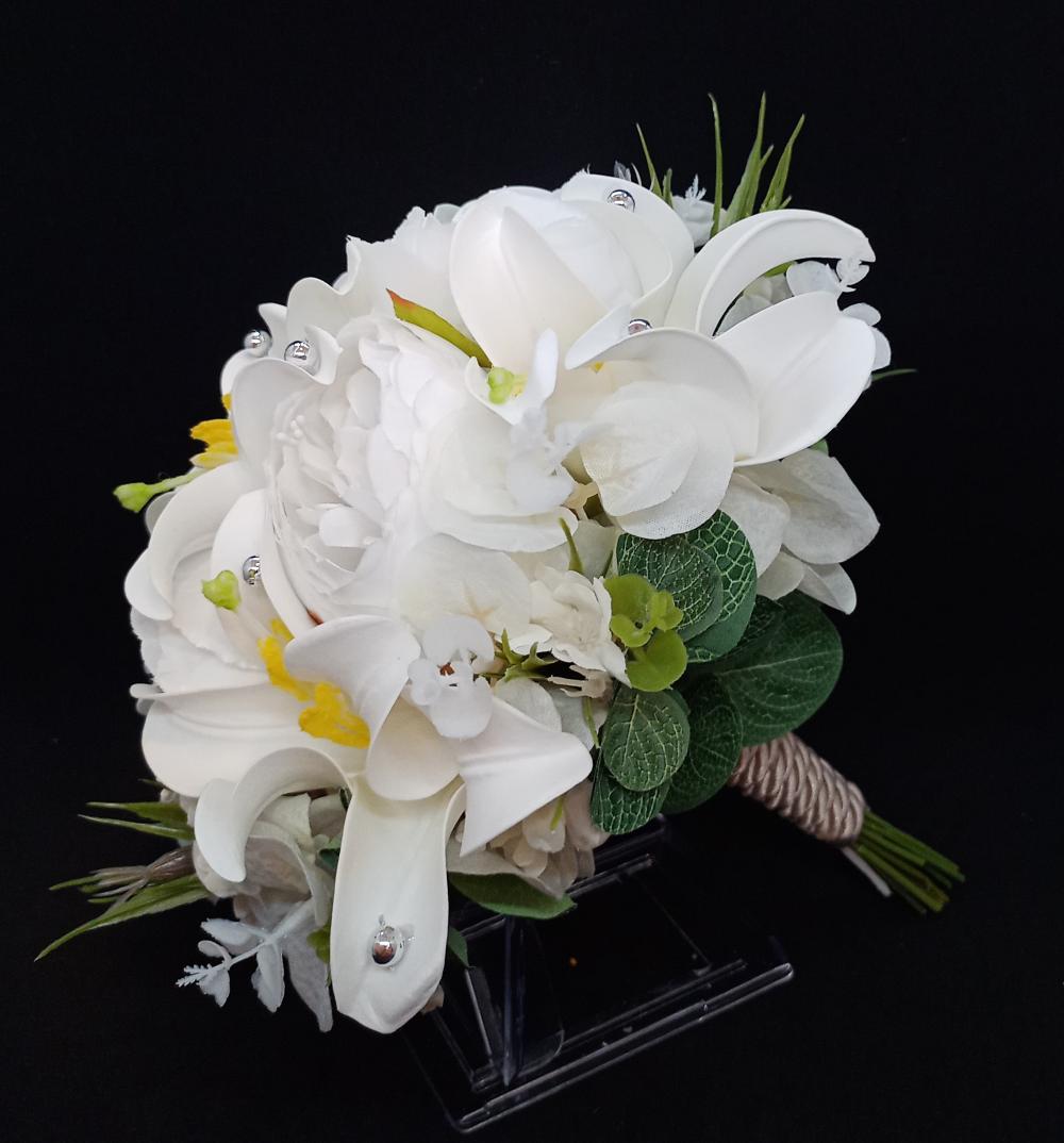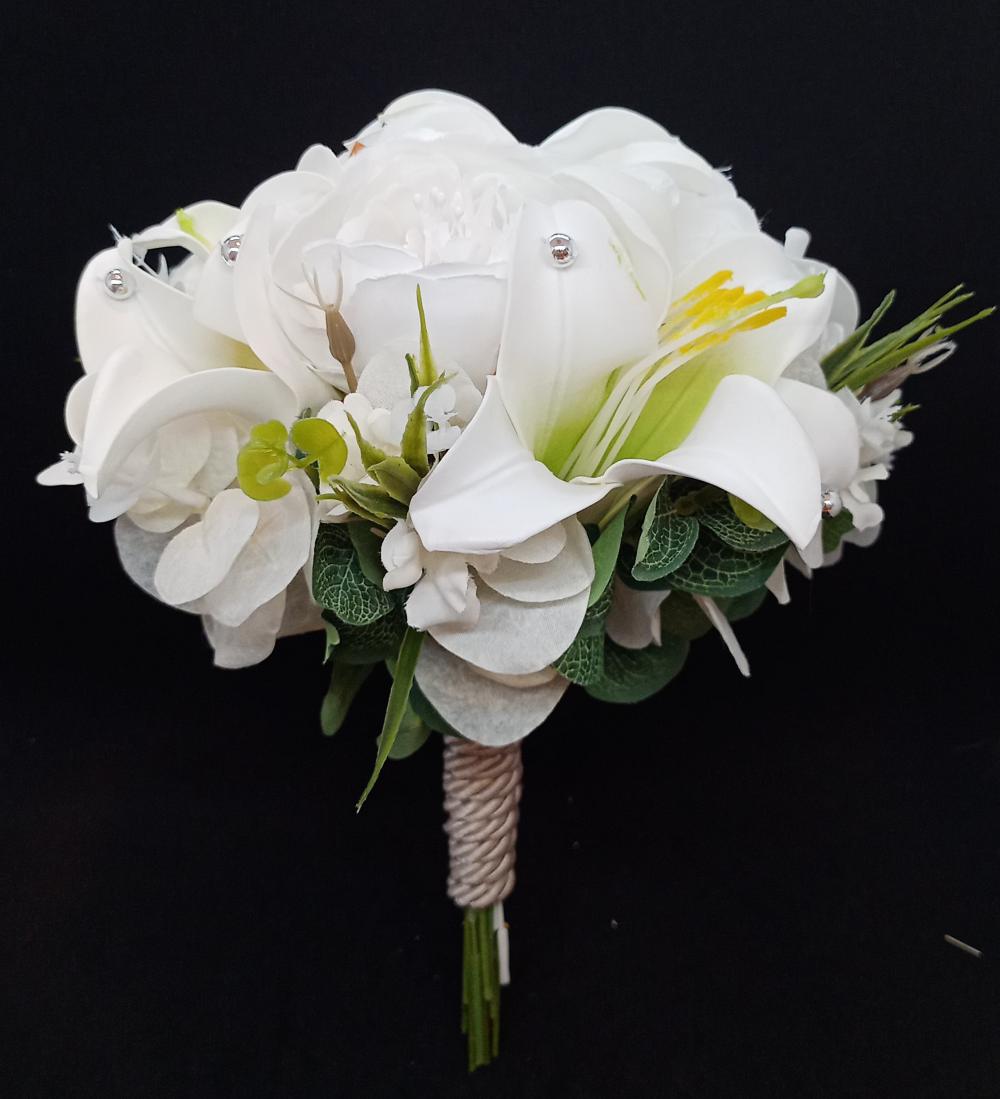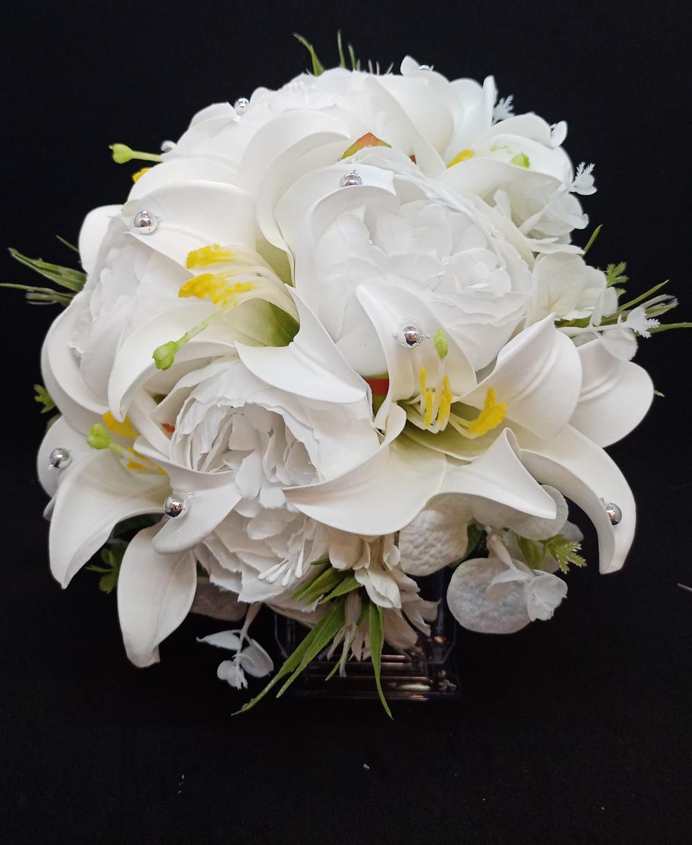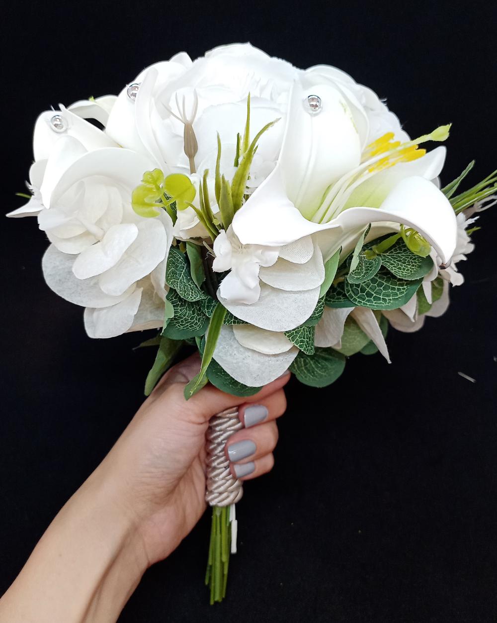 Koyu yeşil yaprak detaylarına sahip beyaz zambak ve güllerden oluşan yapay gelin buketi.