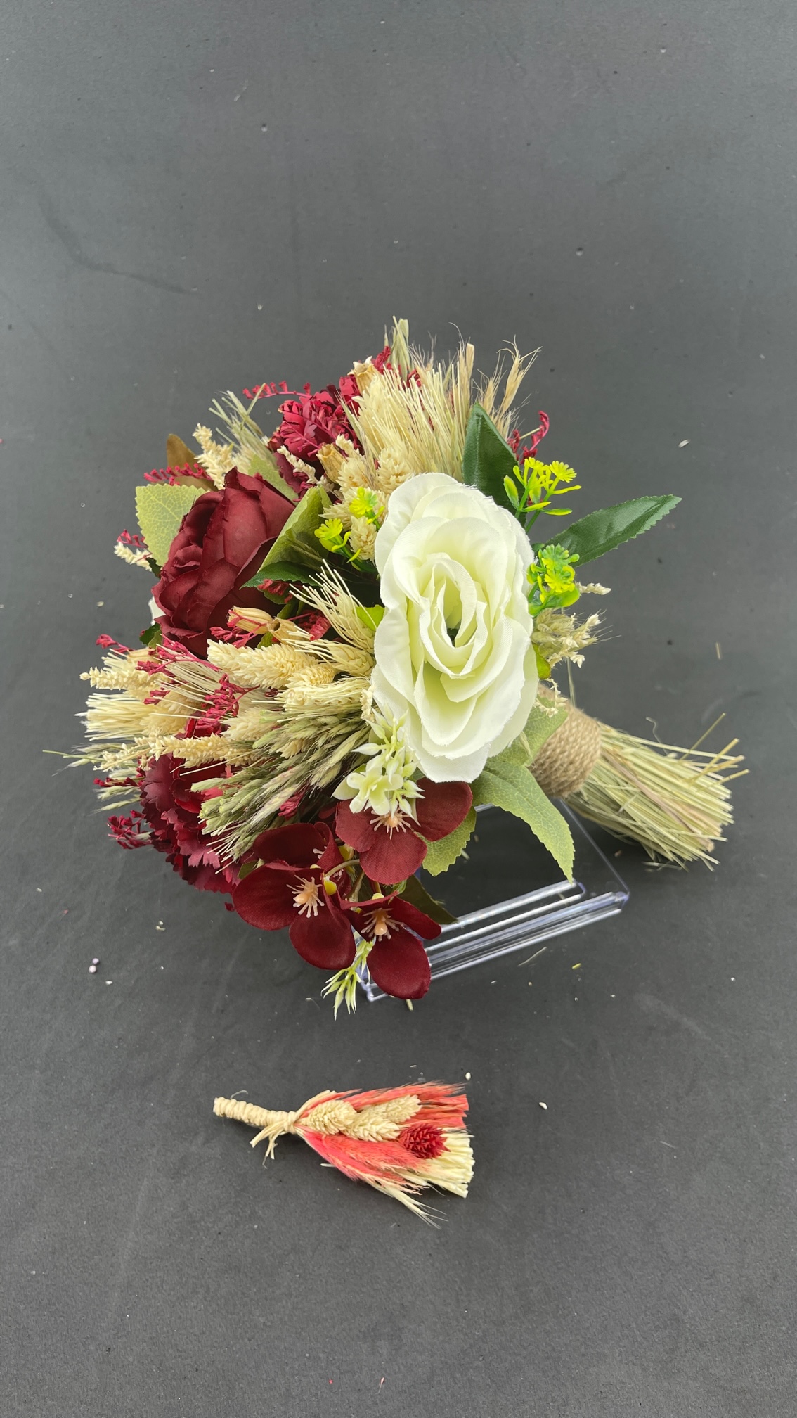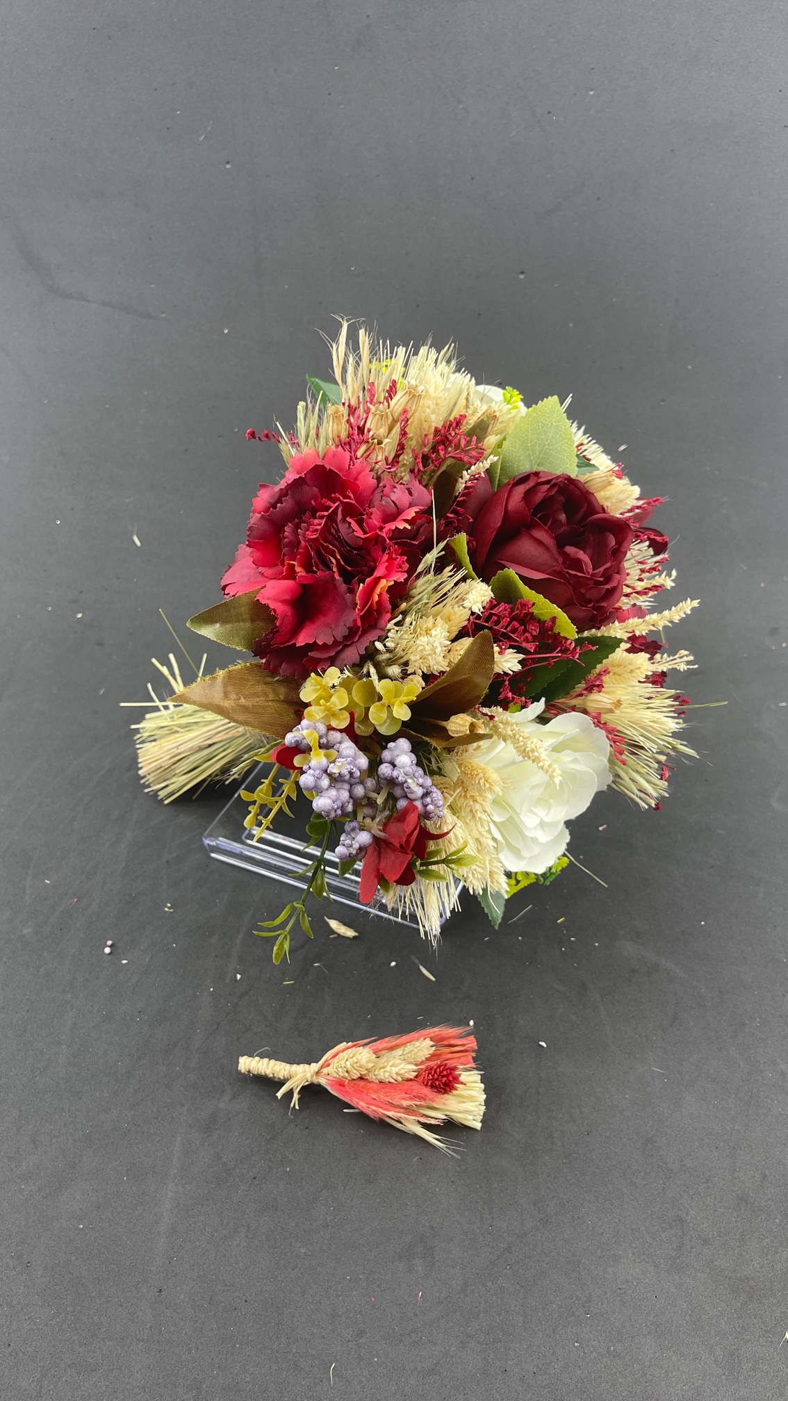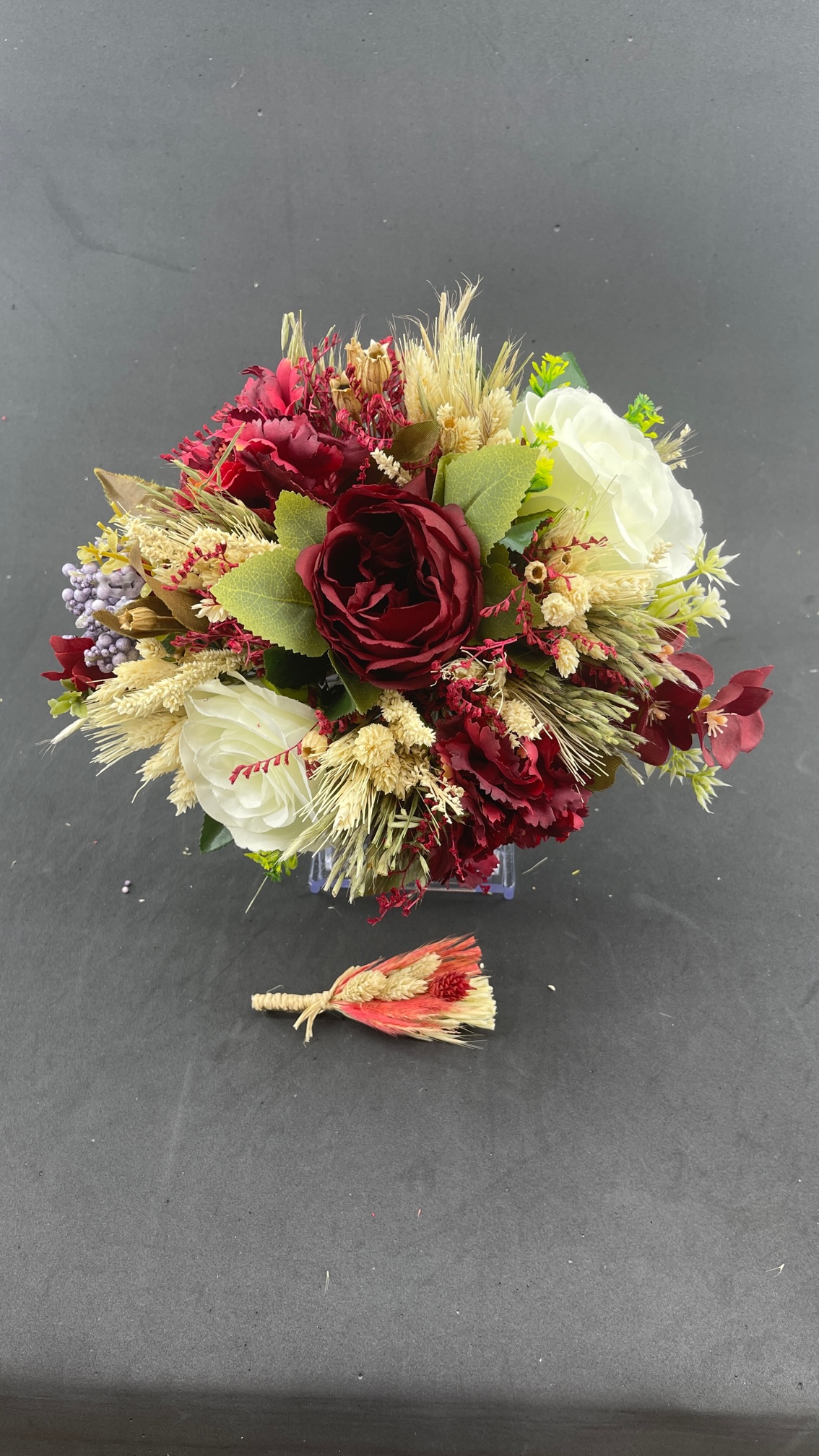 Bordo Kırmızı Güllerle Süslü Aranjman Gelin Buketi Ve Damat Yaka Çiçeği