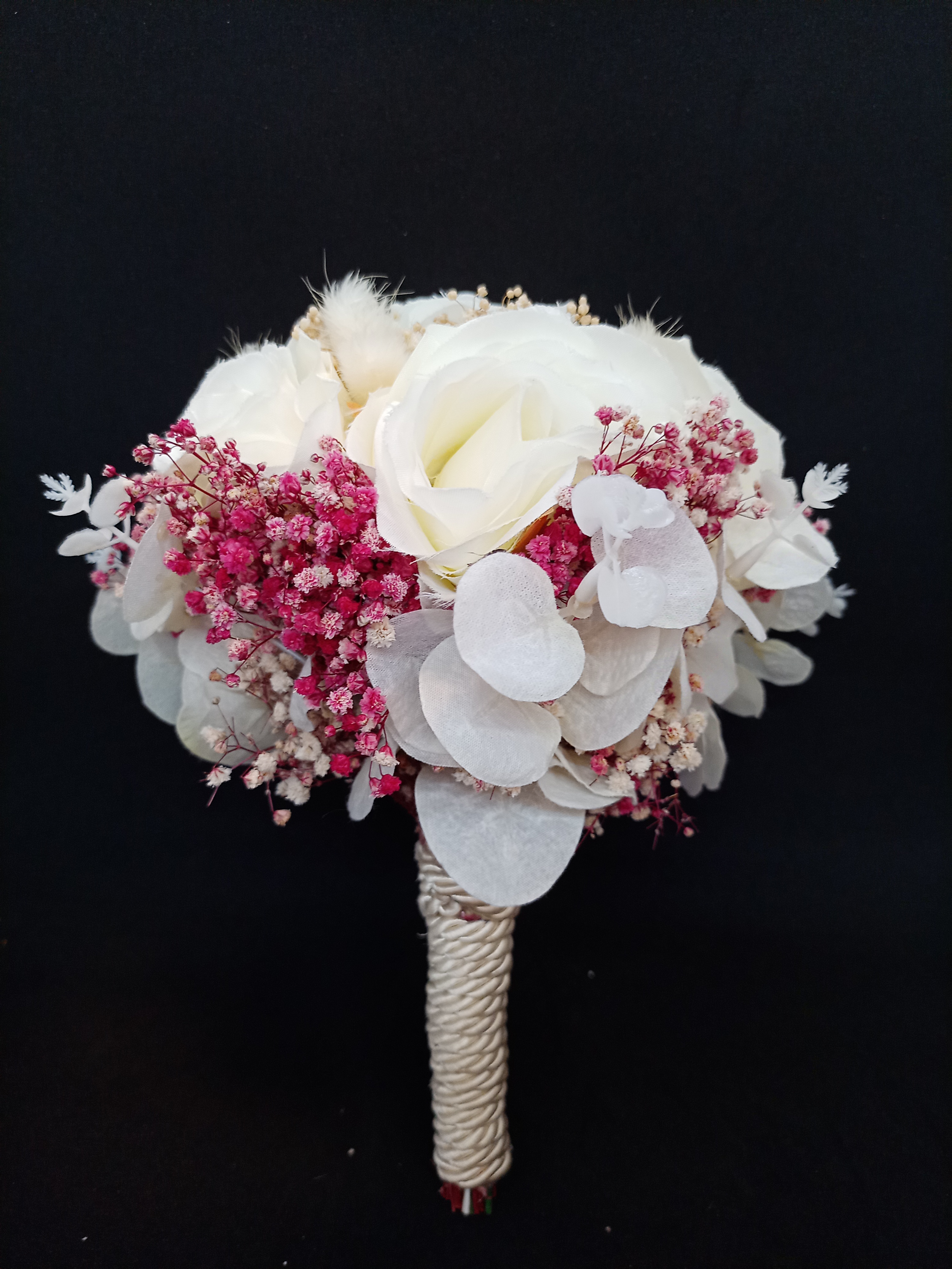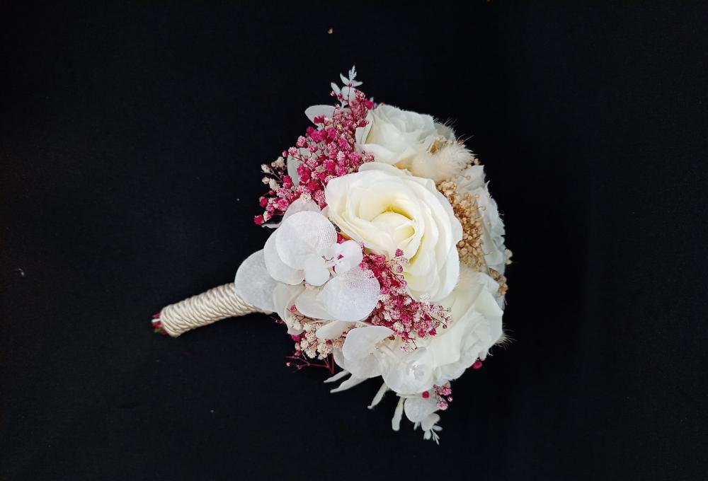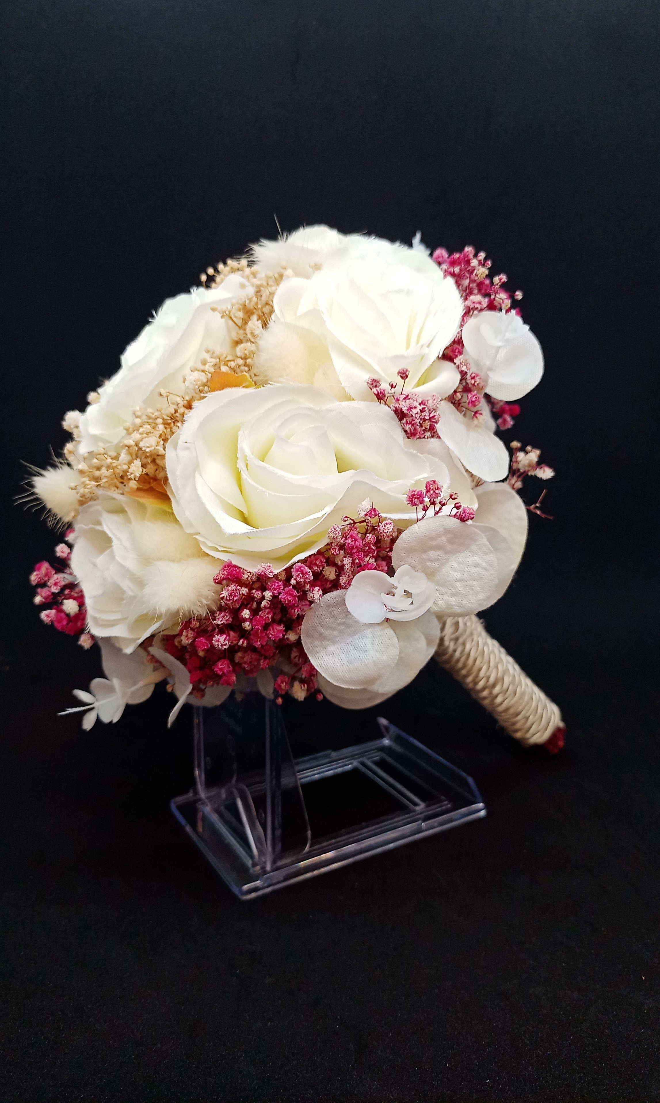 Bordo cipsolarla süslenmiş tavşan kuyruğu otu detaylı ekru güllü yapay gelin buketi.
