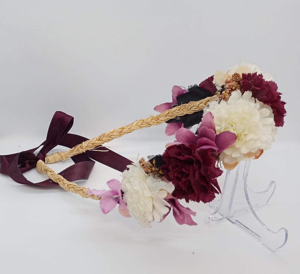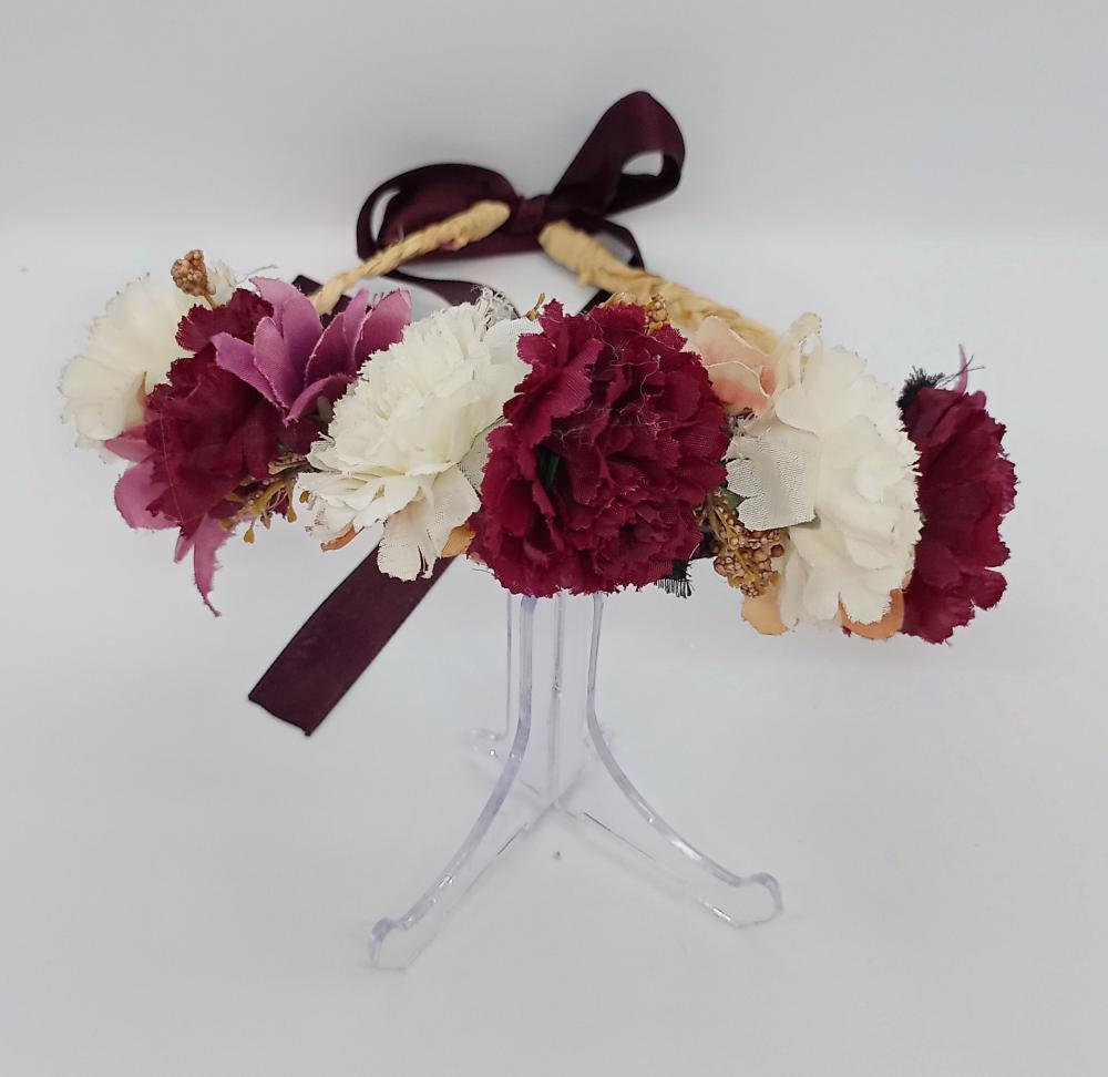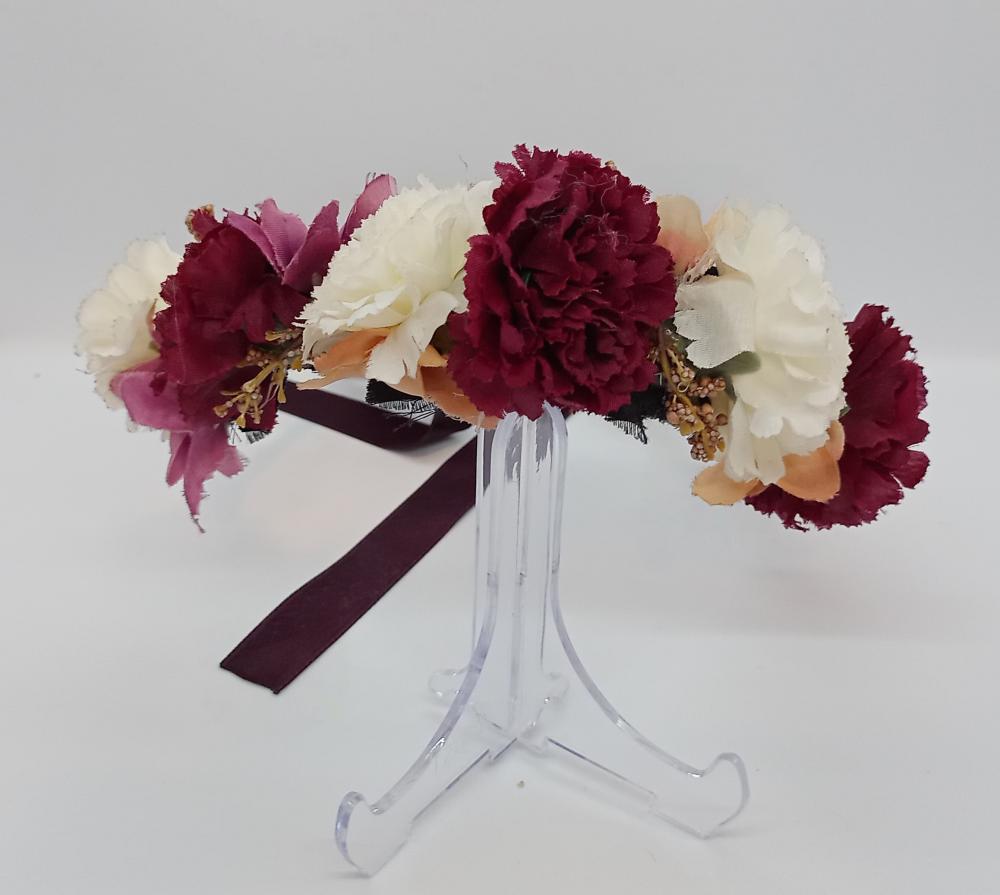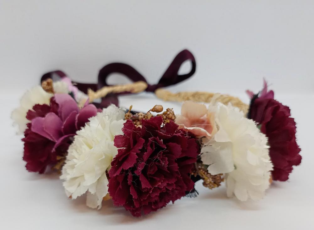 Yapay karanfillerle oluşturulmuş çiçekli taç.