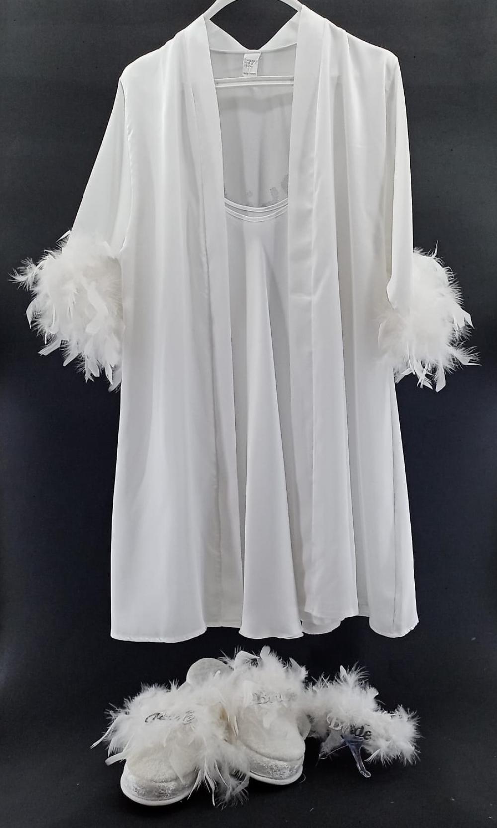 Bride Set Tüylü Model Gümüş Taş İşlemeli Sabahlık /Gecelik Terlik Ve Taç Seti