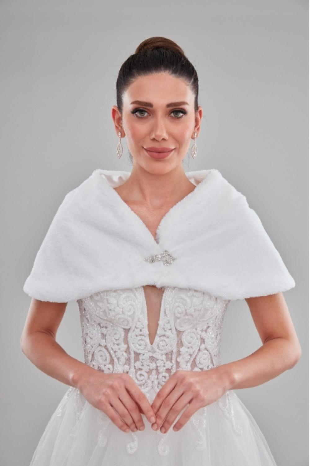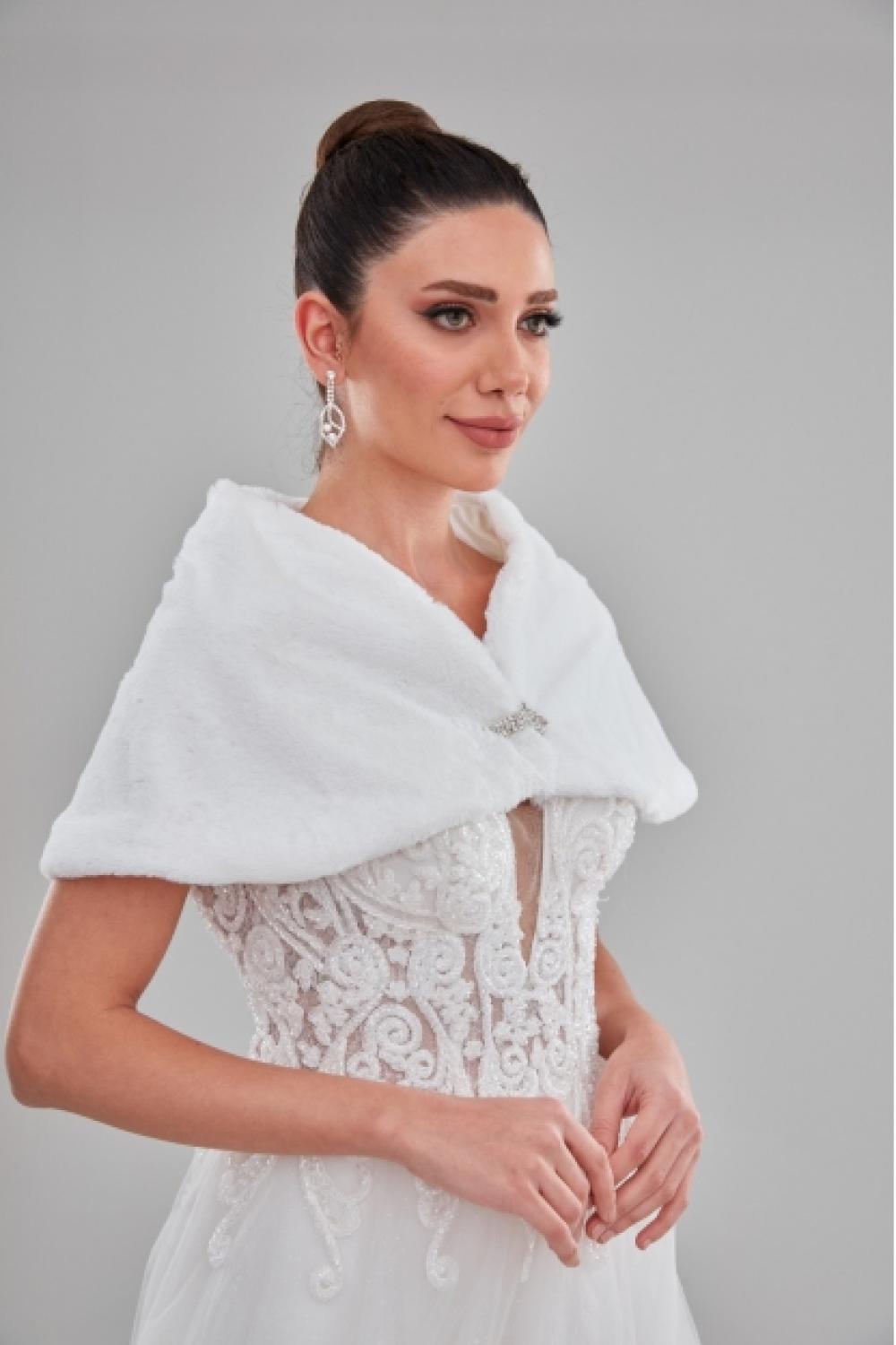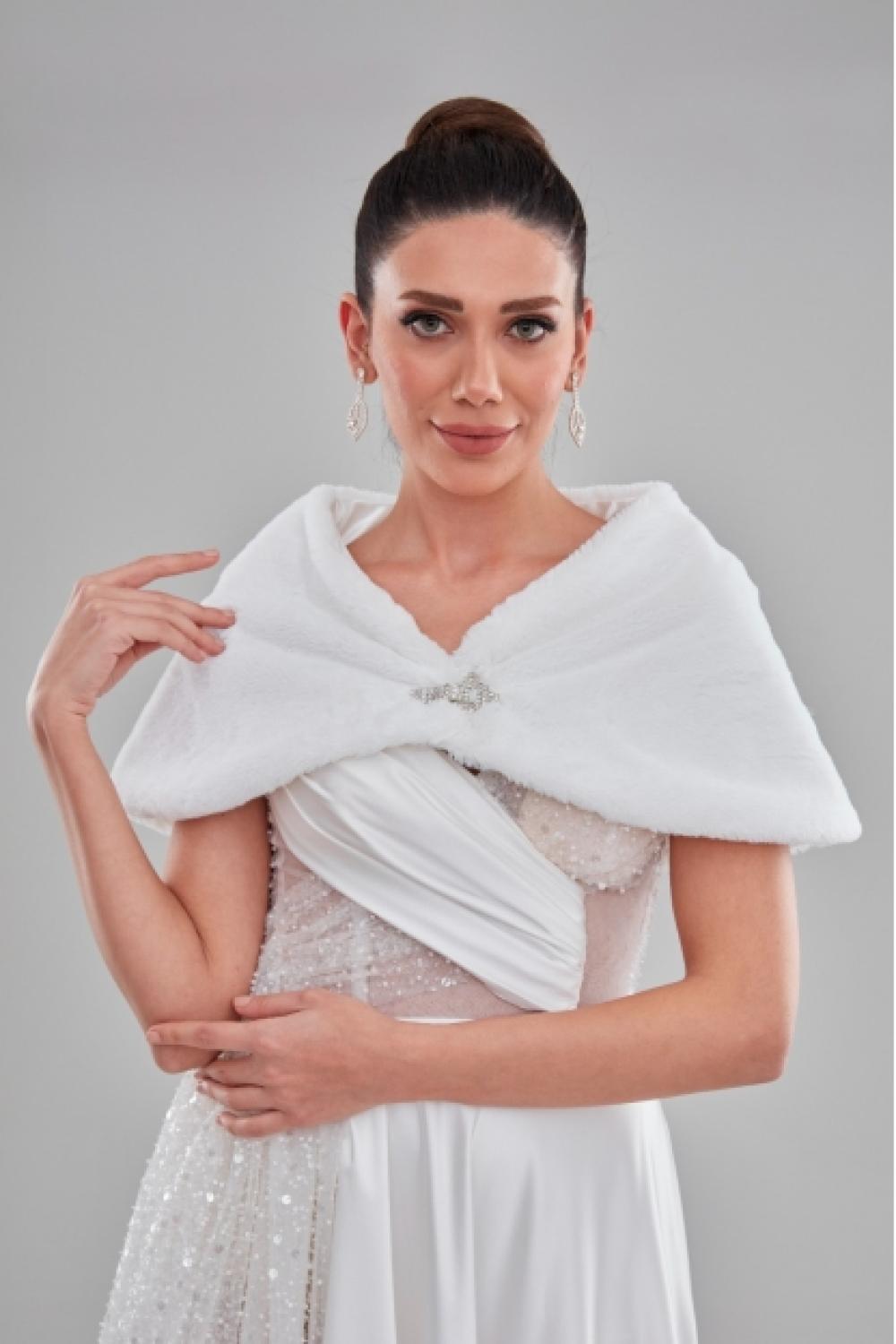 Broş Detayı Olan Beyaz Gelin Etol Kürk Bolero