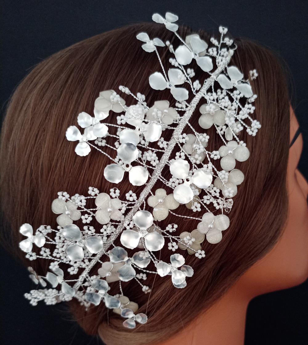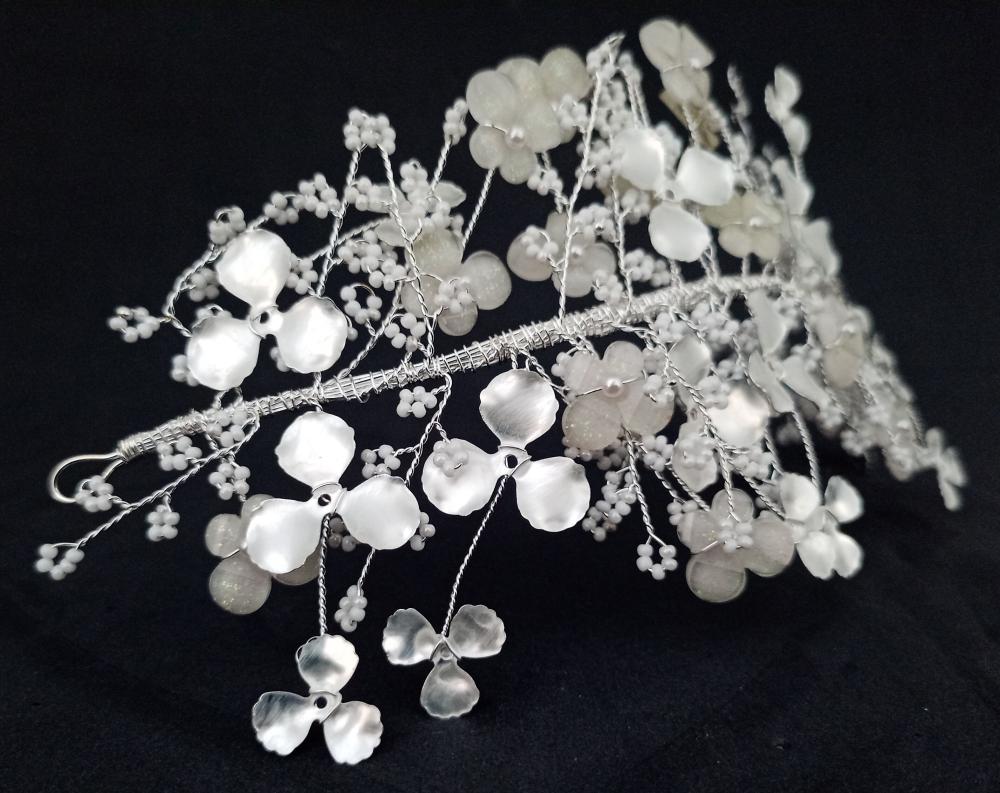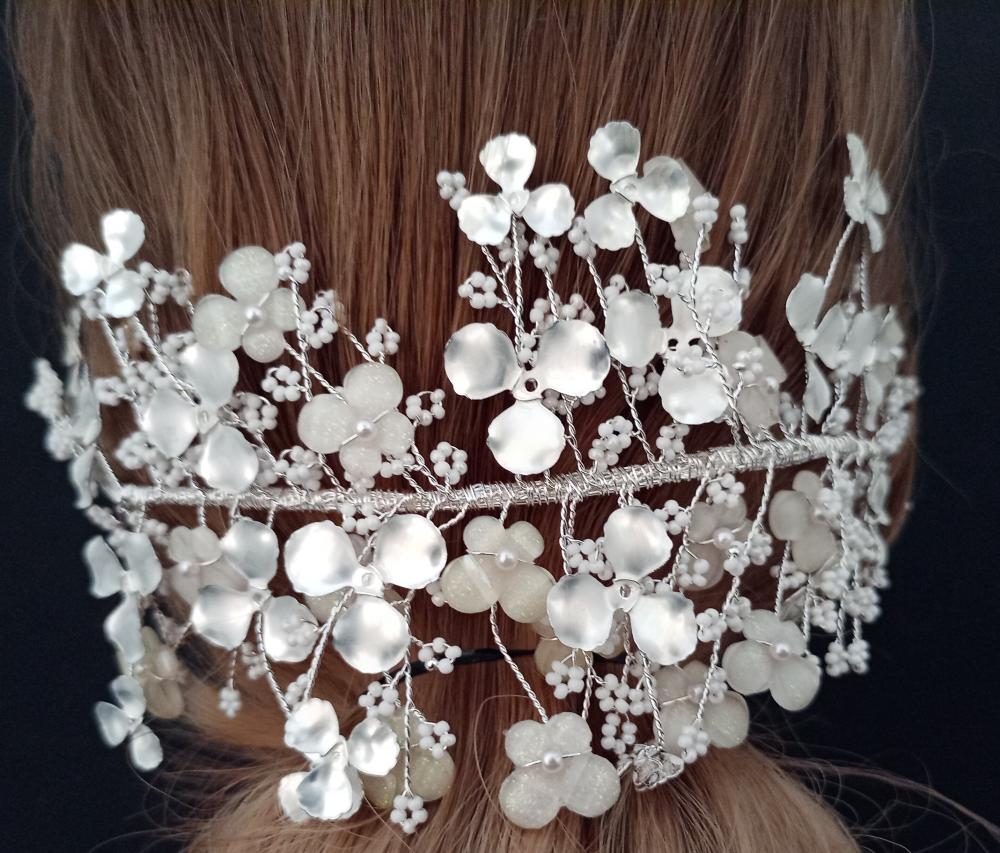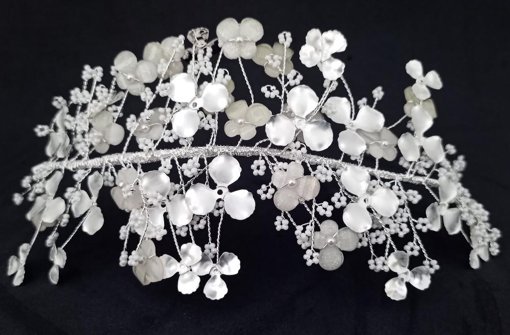 Çiçek Şekilleri Ve Küçük Beyaz Taş İşleme Detayları Olan Helen Gelin Tacı