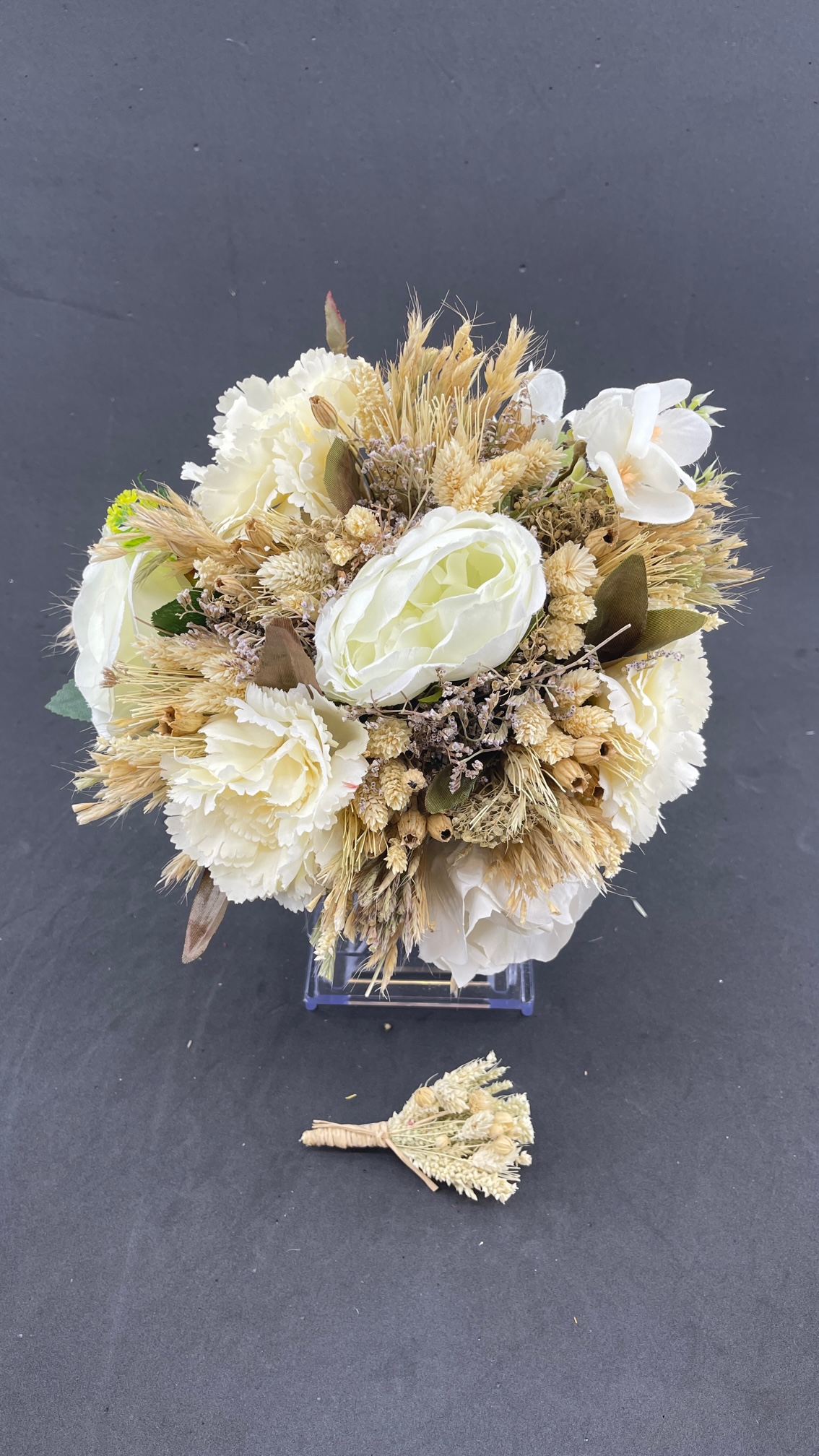 Cipsolar Ve Başaklarla Süslenmiş Krem Beyaz Gül Gelin Buketi Ve Damat Yaka Çiçeği