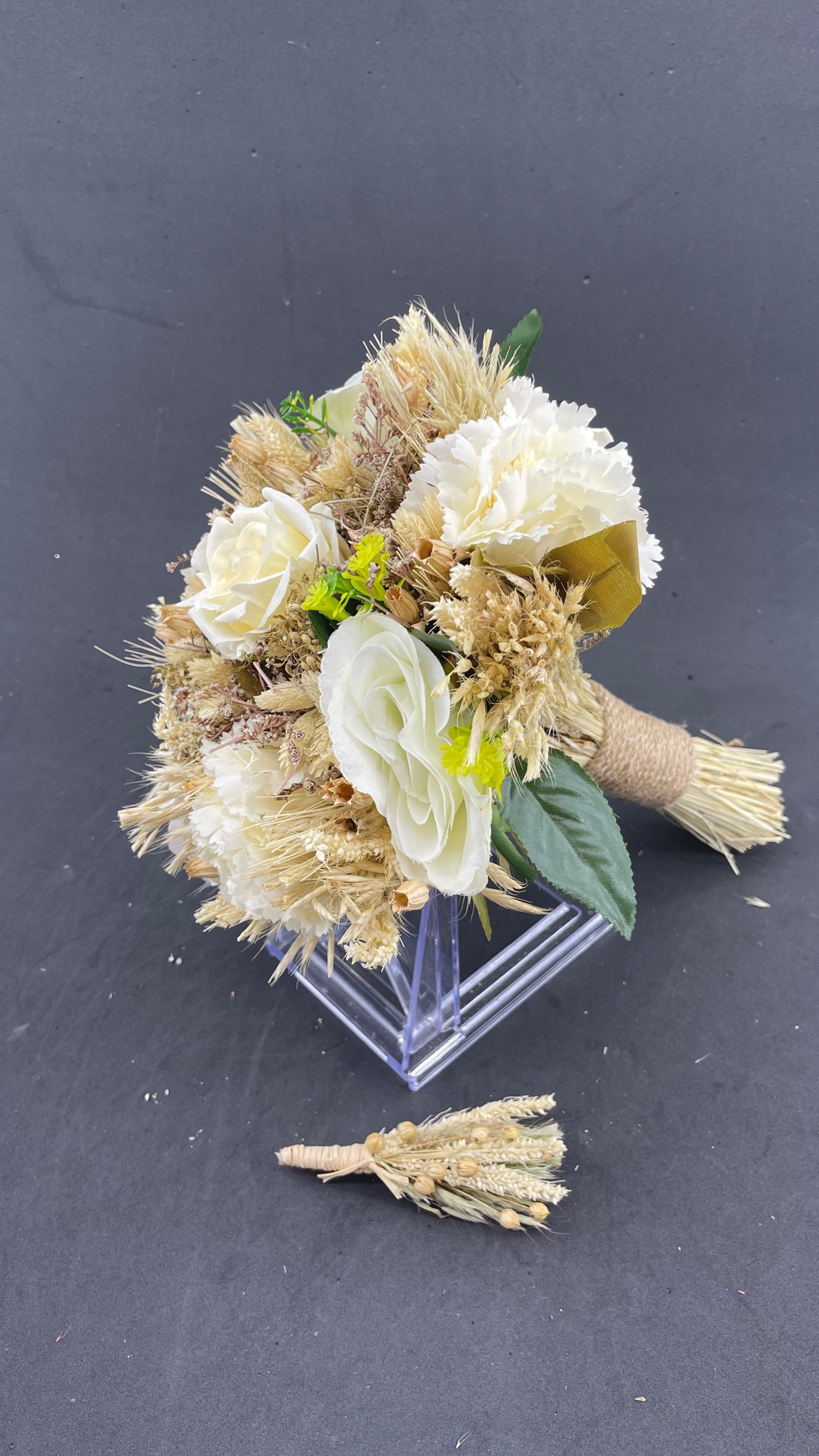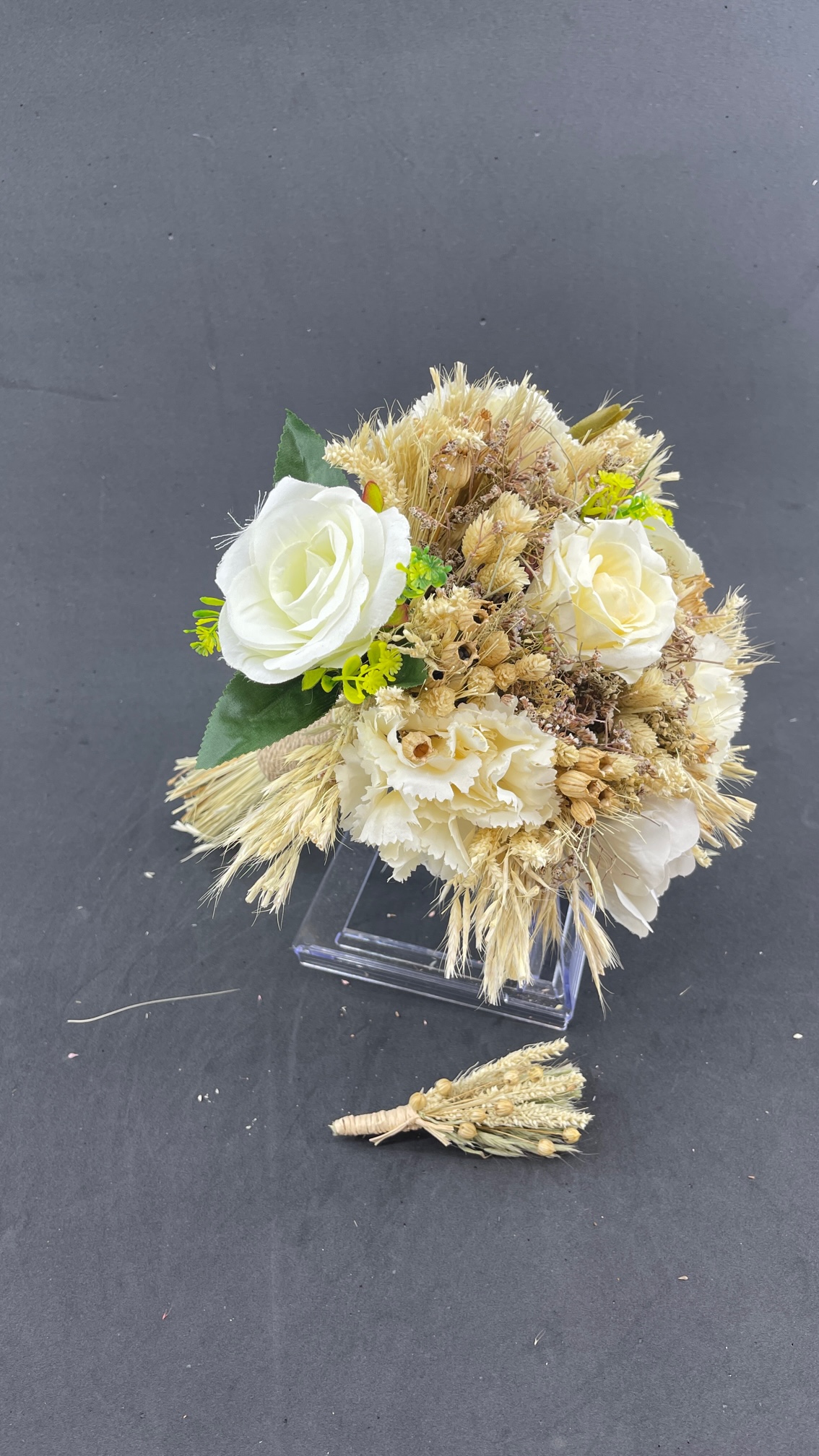 Cipsolar Ve Başaklarla Süslü Ekru Beyaz Aranjman Gül Gelin Buketi Ve Damat Yaka Çiçeği