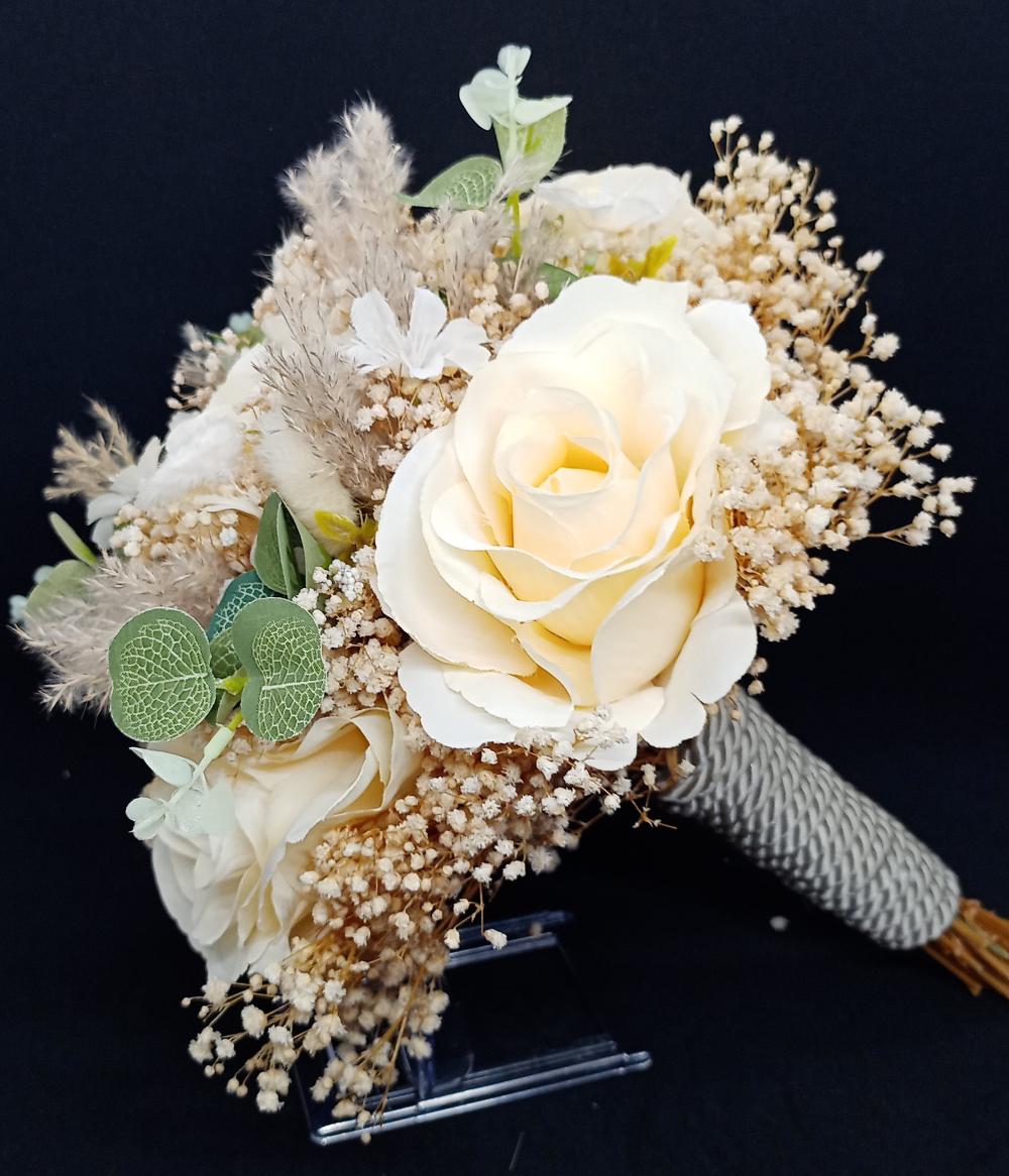 Beyaz cipsolardan ve yeşil yaprak detaylarından oluşan beyaz gül yapay gelin buketi.