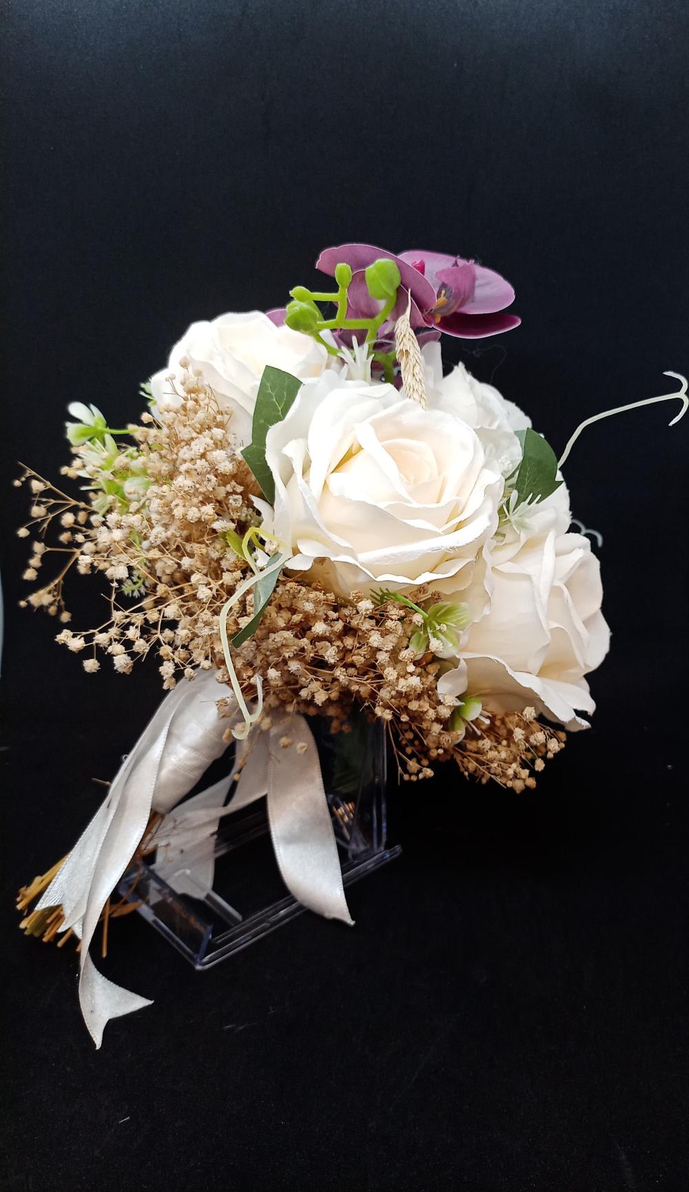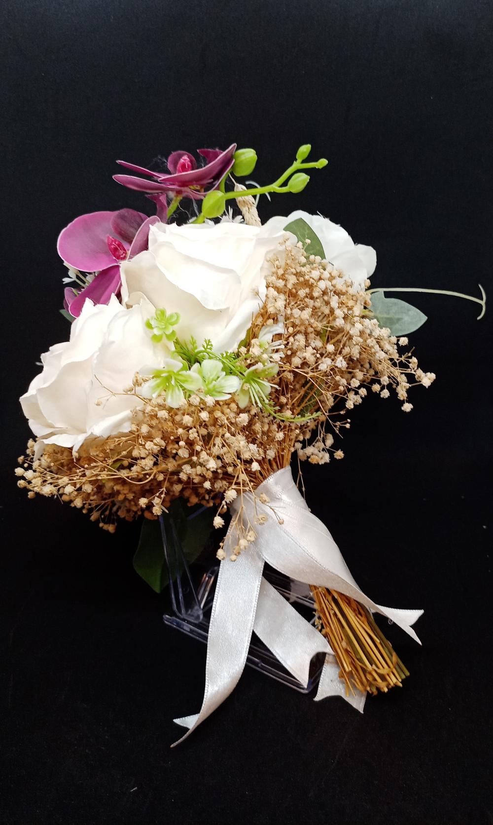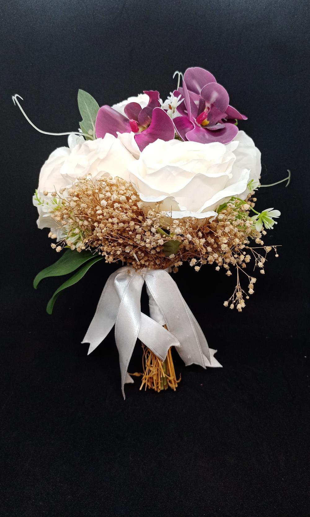 Cipsolarla Süslenmiş Mor Detayı Olan Beyaz Gül Gelin Buketi