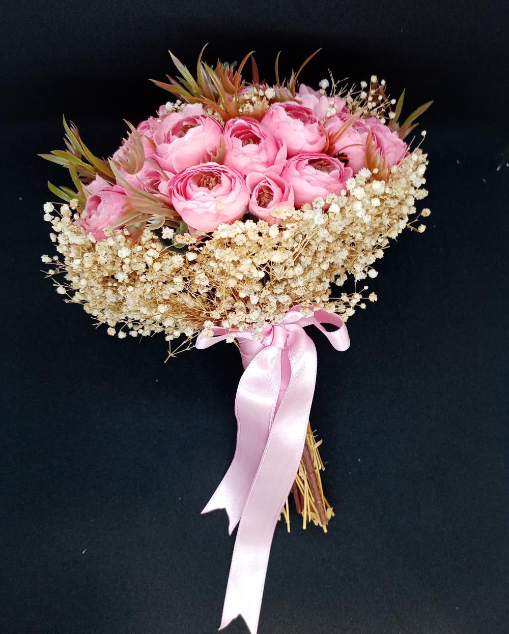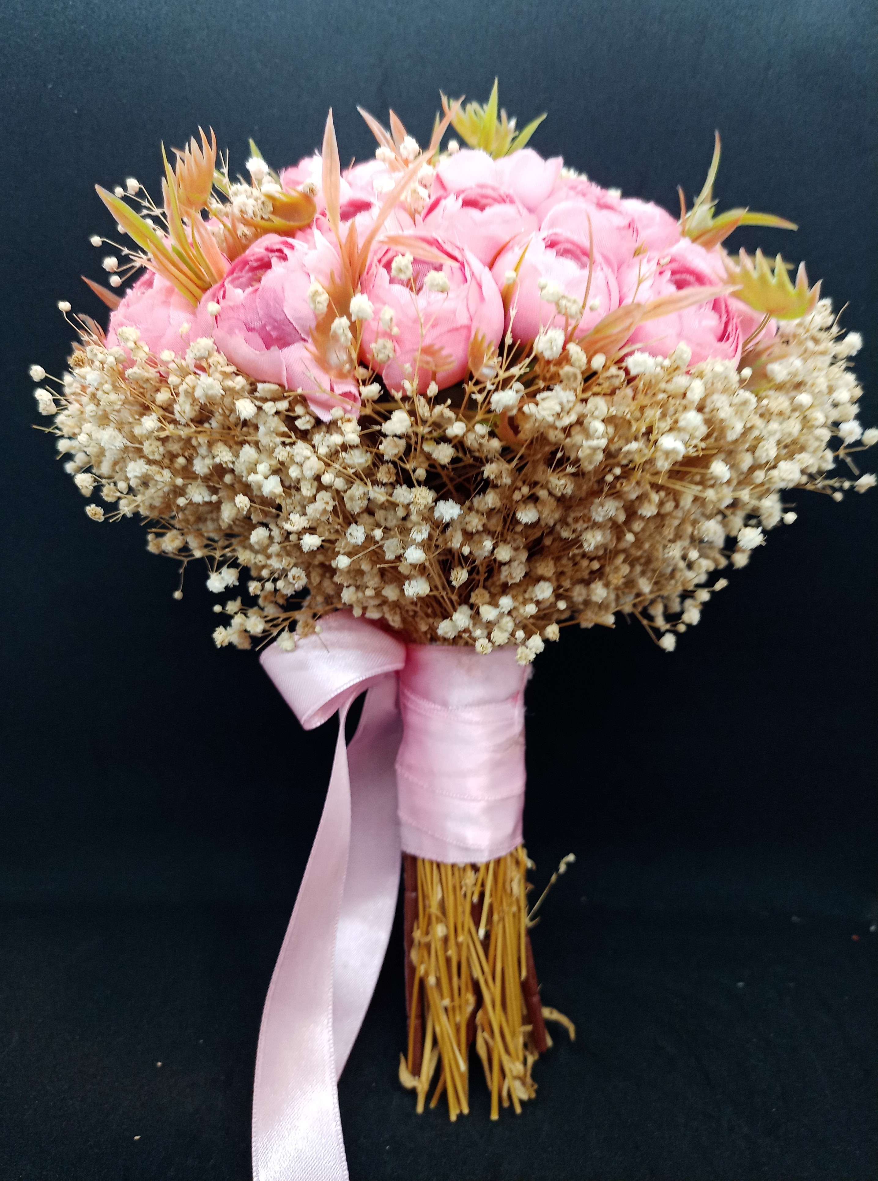 Cipsolarla Süslenmiş Pembe Gül Gelin Buketi.