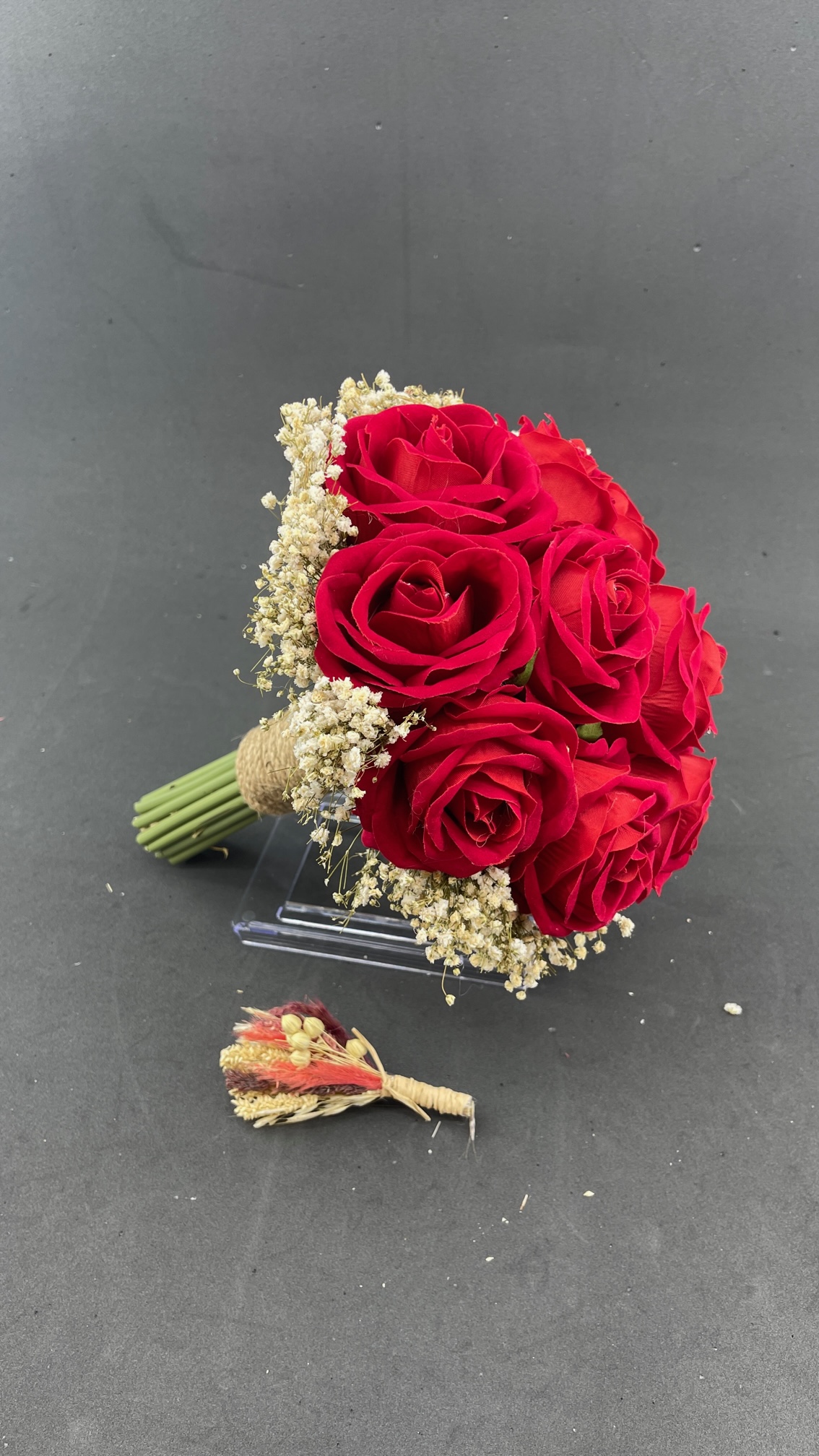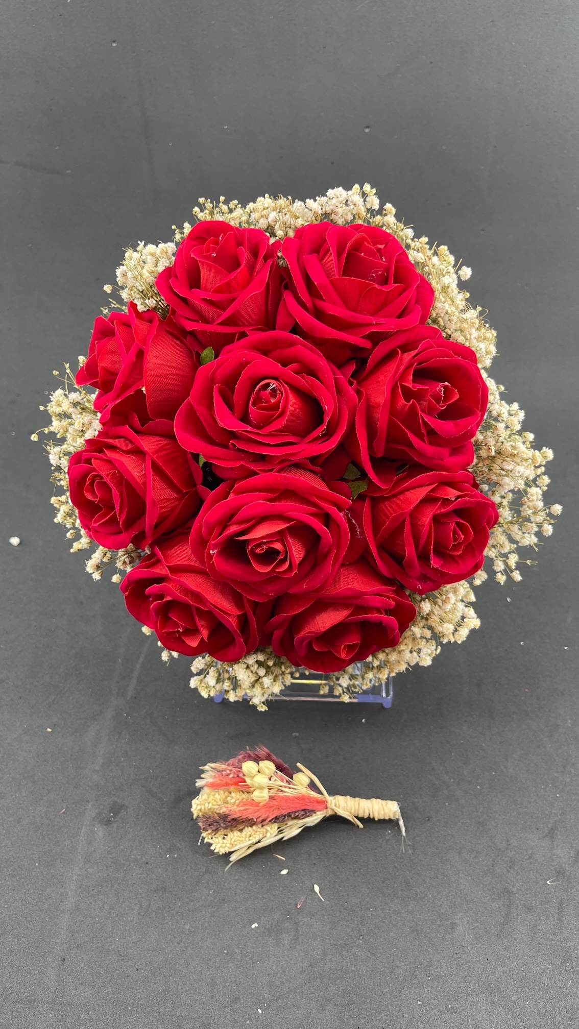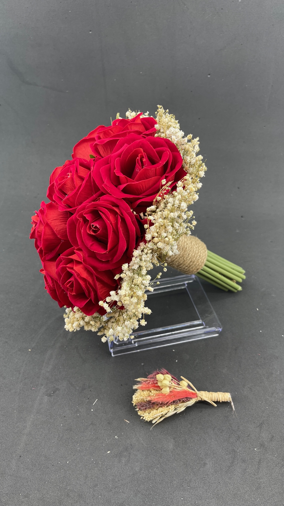 Cipsolarla Süslü Zarif Kırmızı Gül Gelin Buketi Ve Damat Yaka Çiçeği