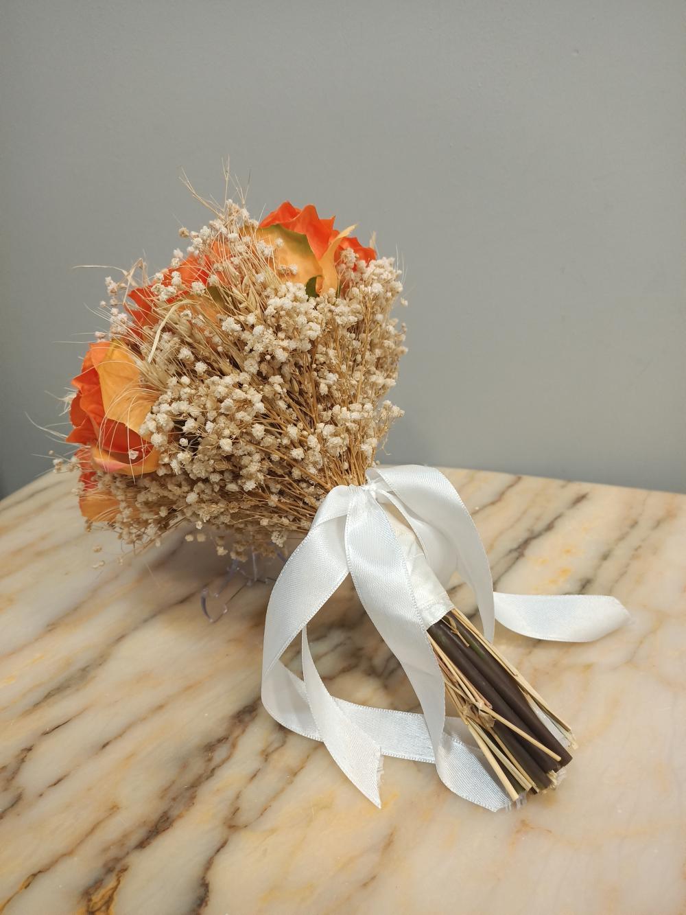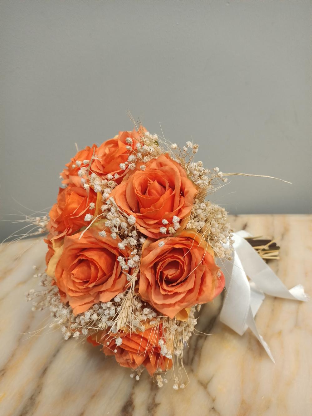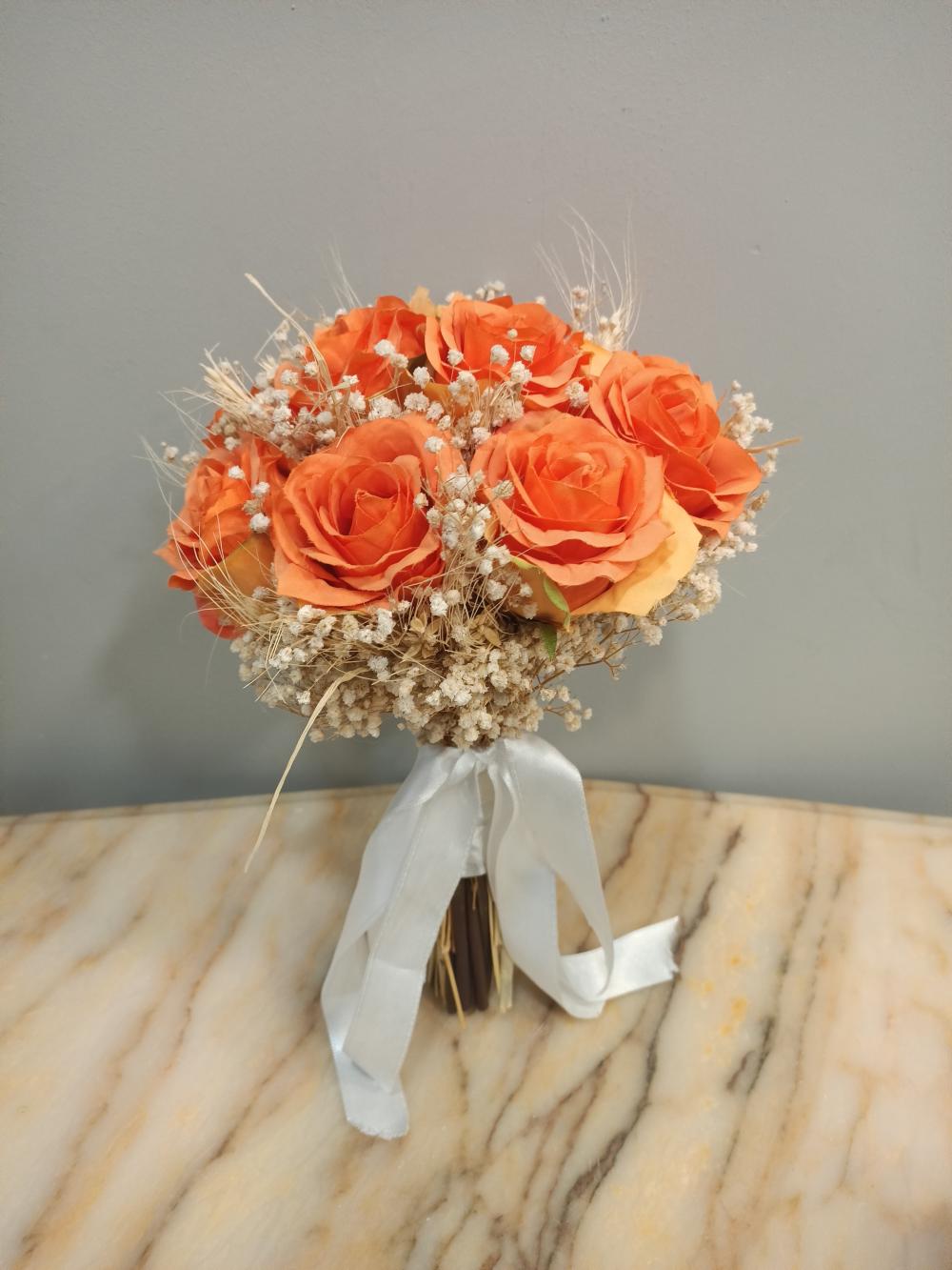 Beyaz kurdele detaylı turuncu gül yapay gelin buketi.