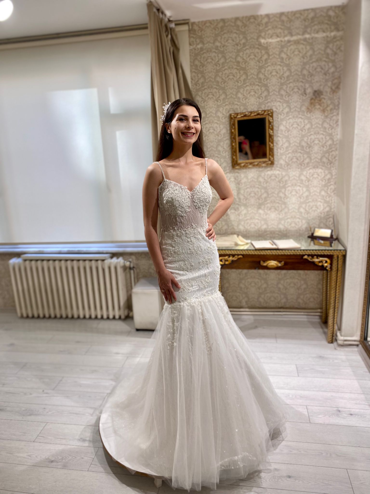 Derin V Yaka Dantel İşlemeli Kuyruklu Balık Gelinlik
