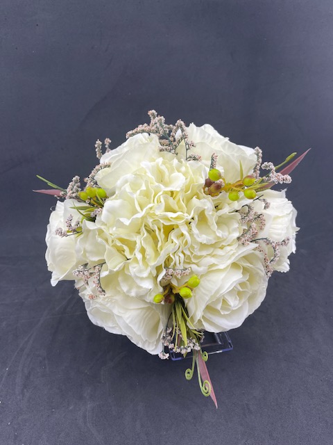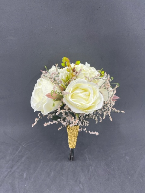 Ekru - Kırık Beyaz Pembe Yeşil Yaprak ve Ot Detaylı Karanfil Gül Gelin Buketi