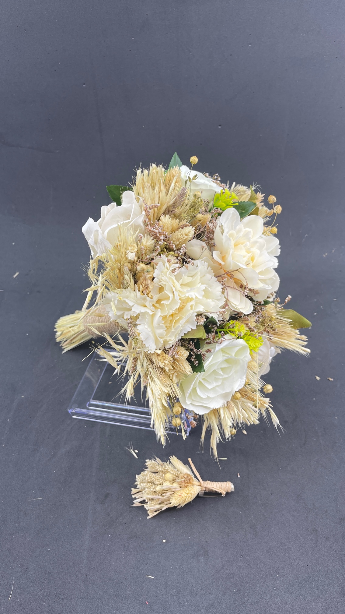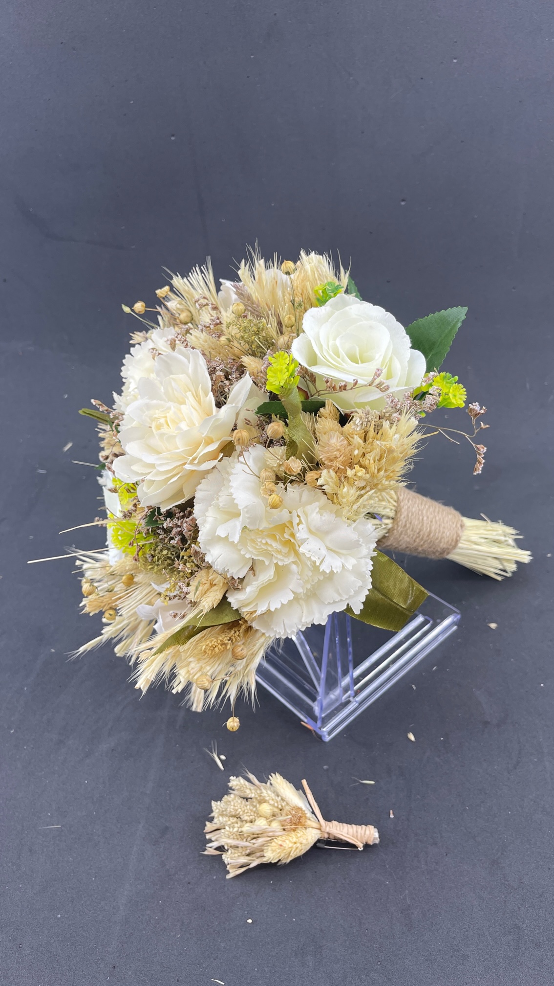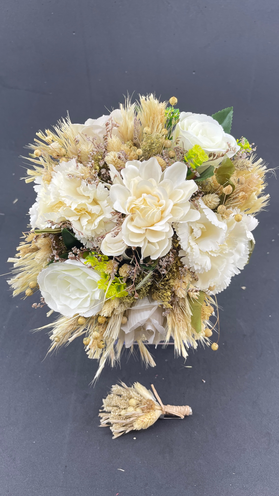 Ekru Kırık Beyaz Tonlarda Yeşil Yaprak Detaylı Aranjman Gelin Buketi Ve Damat Yaka Çiçeği
