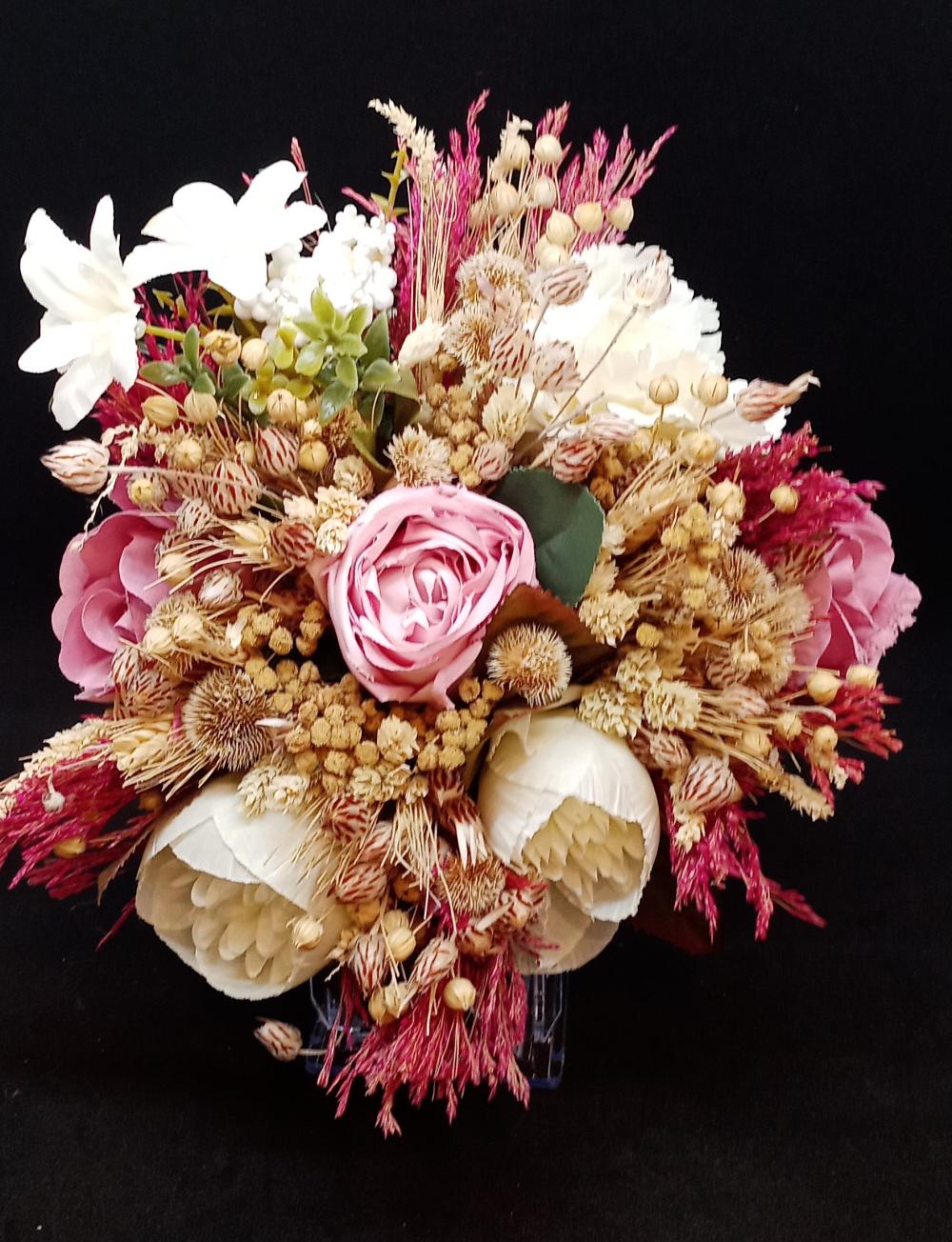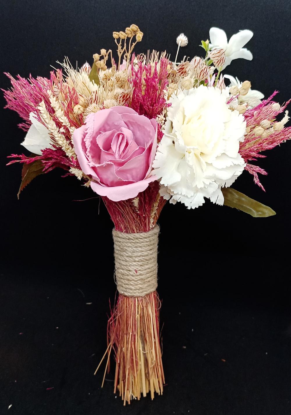 Kahve rengi otlar ve fuşya rengi cipsolarla birleşmiş beyaz ve pembe güllerden oluşan yapay gelin buketi.
