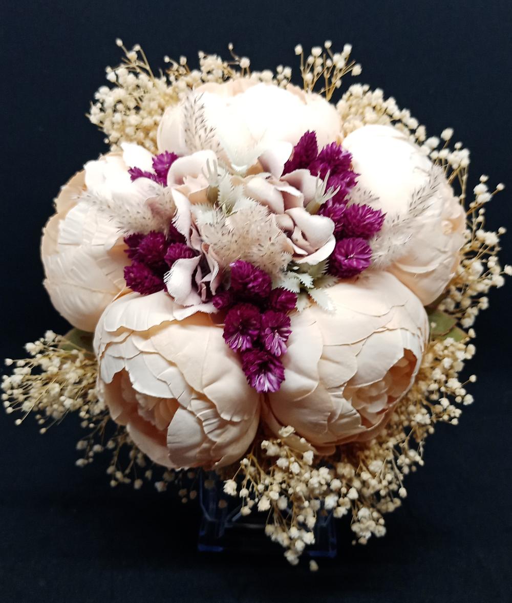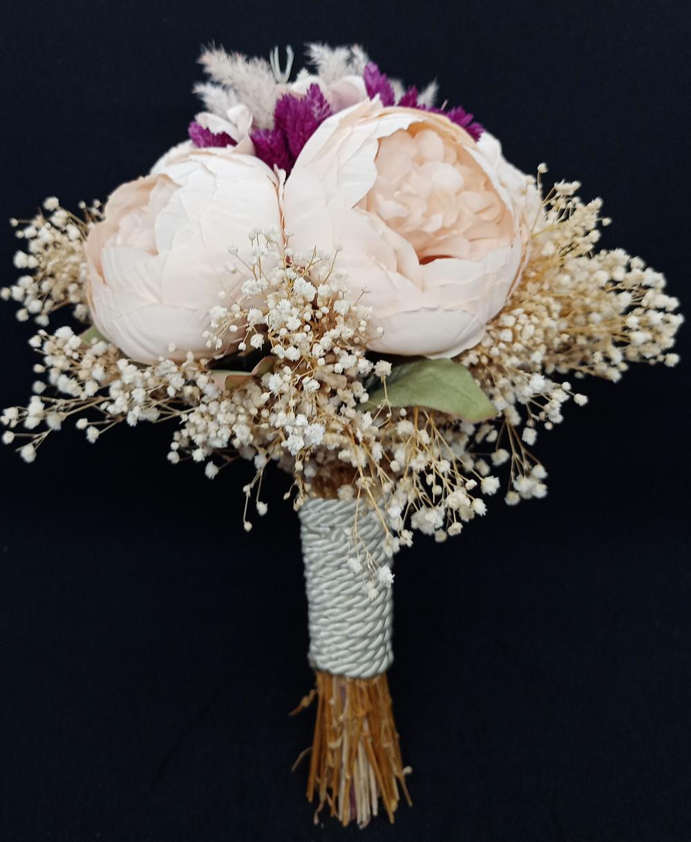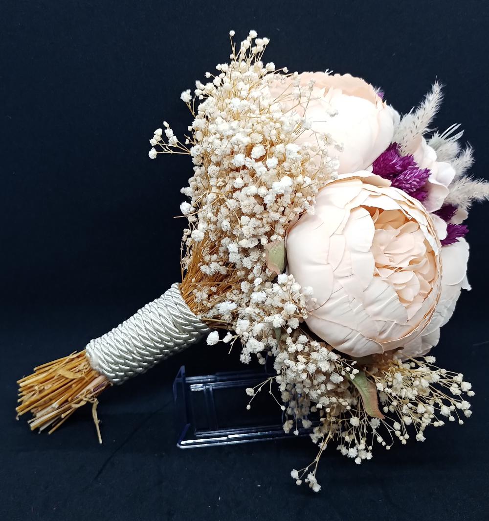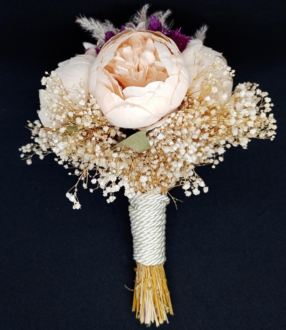 Beyaz cipsolar ve tüylerden oluşan fuşya rengi ot detayına sahip pembe şakayık yapay gelin buketi.