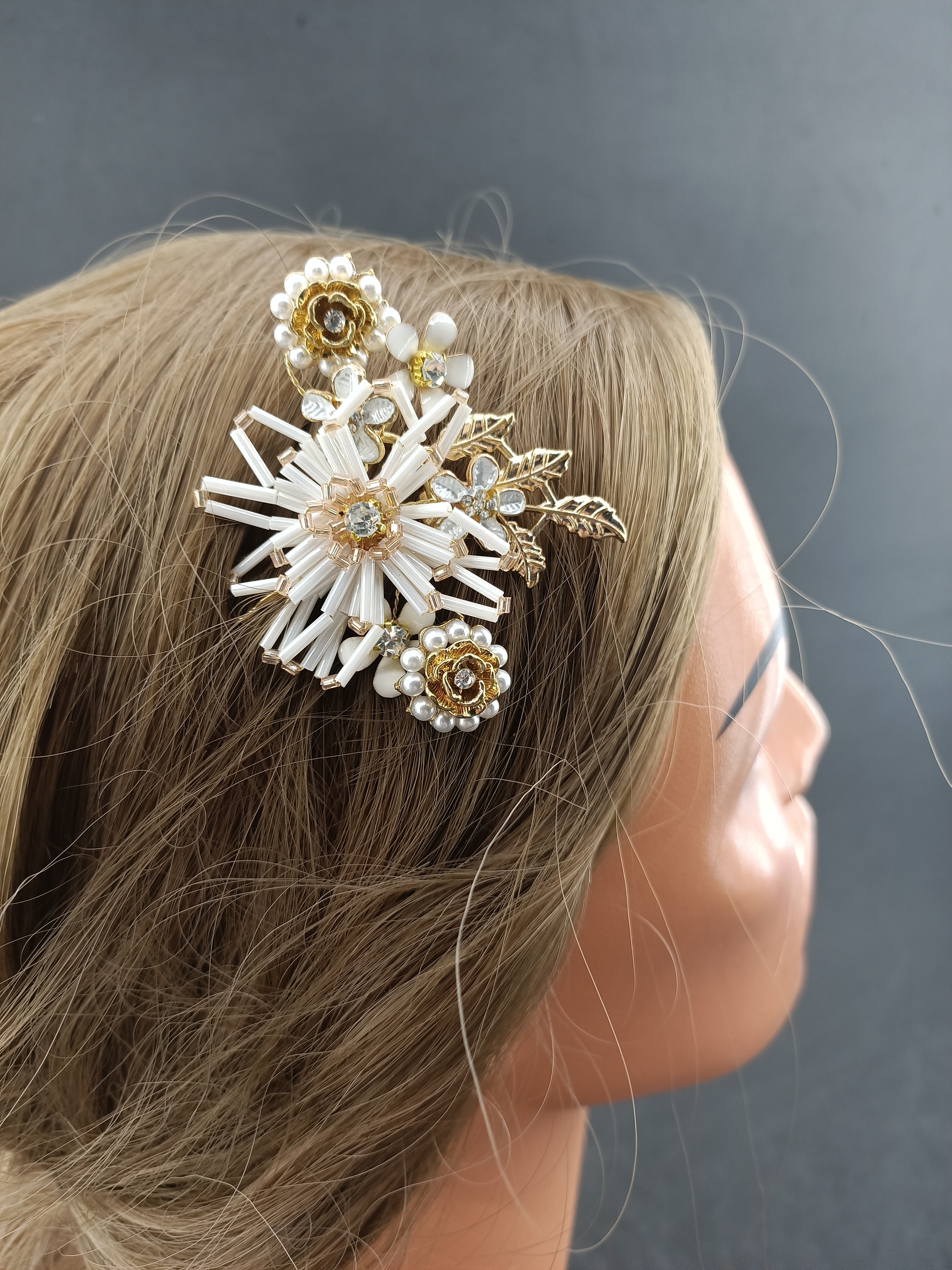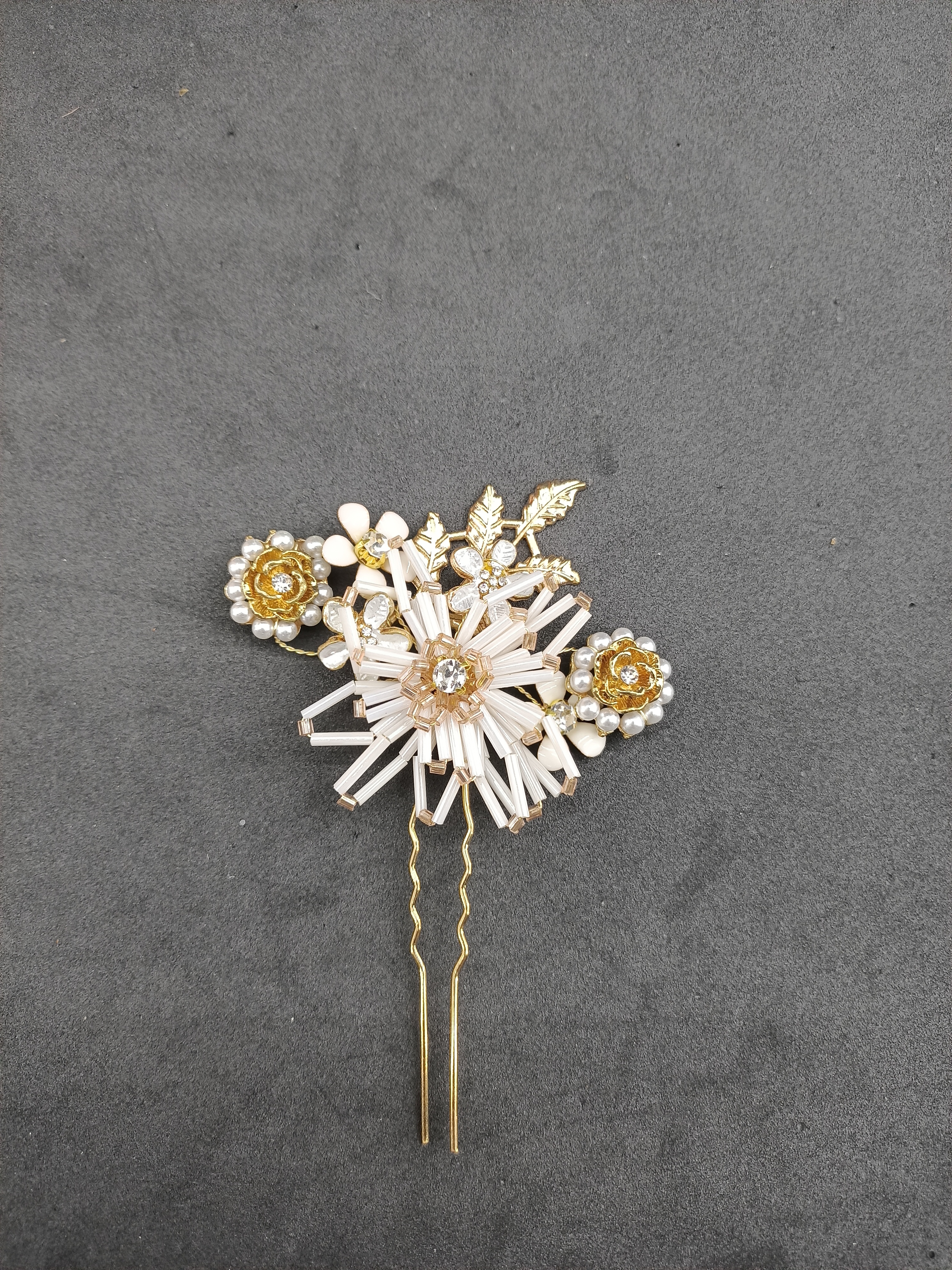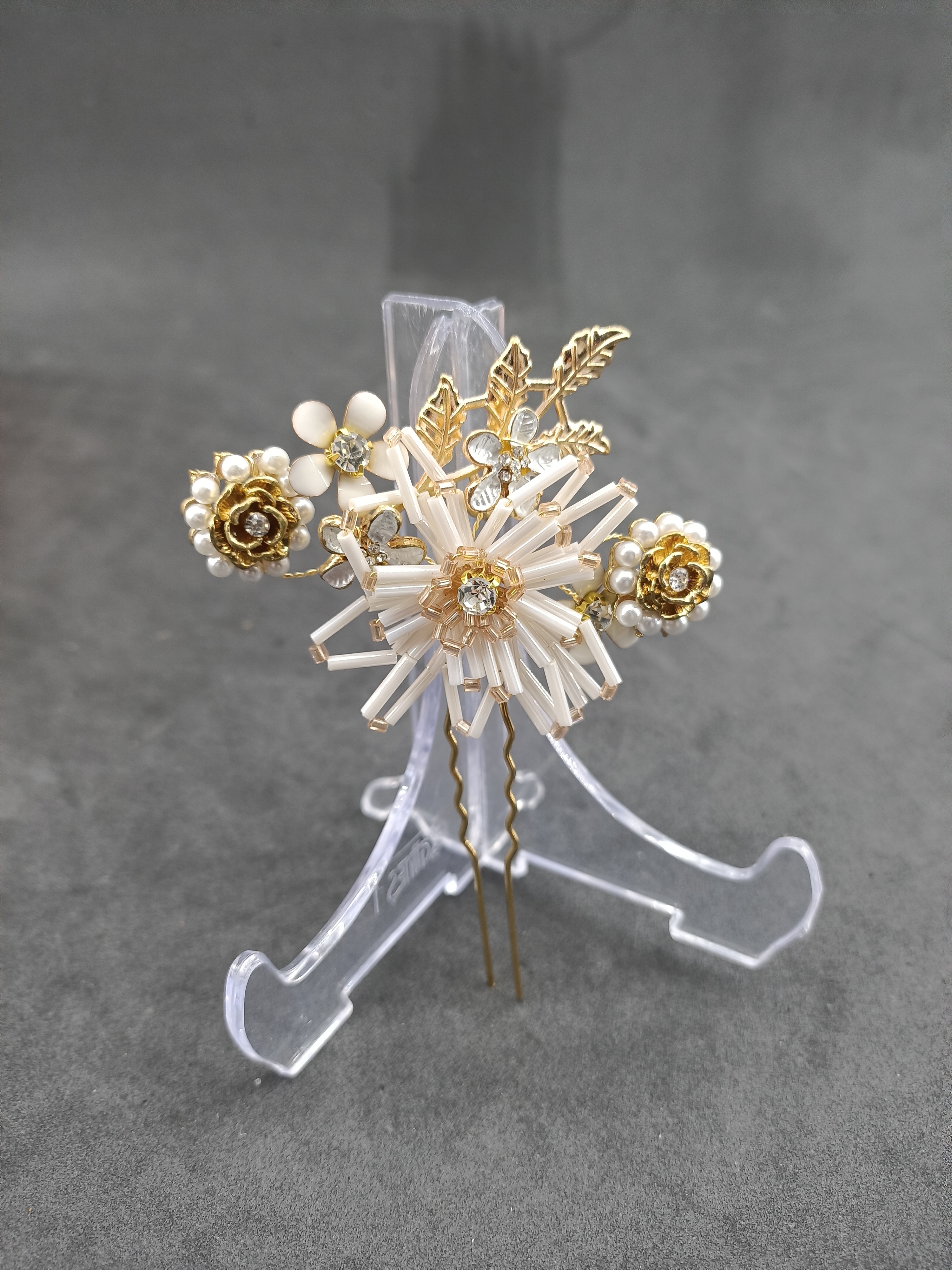 Gold-Altın Detaylı İncili ve Taşlı Gelin Nişan Kına Tokası