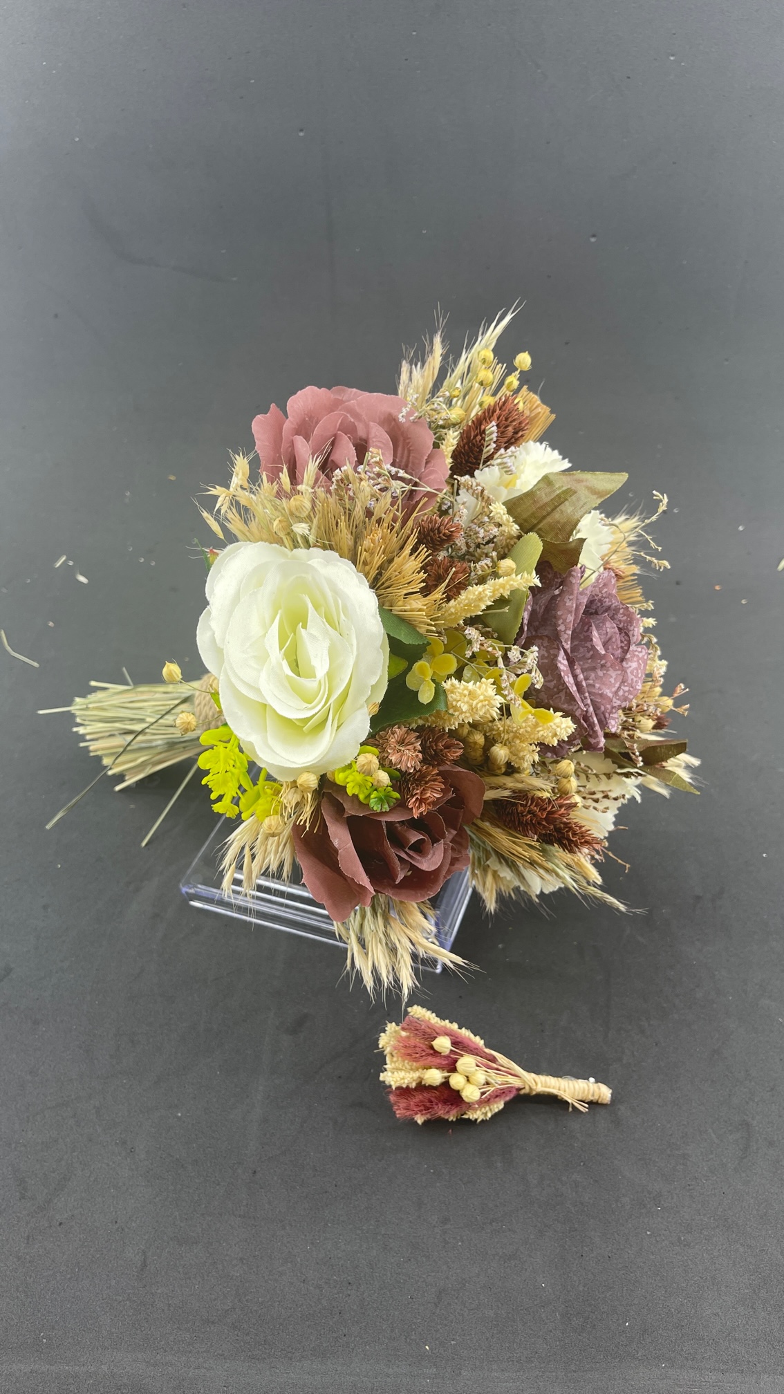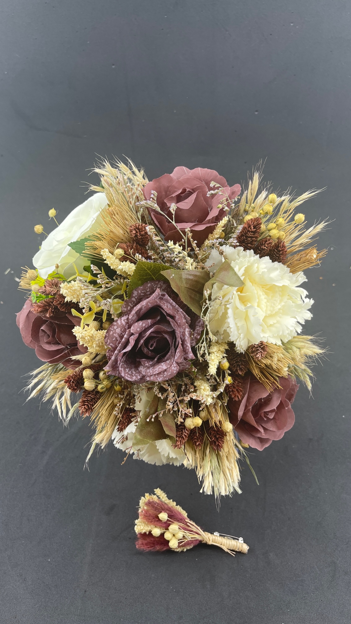 Gül Kurusu Mürdüm Renklerinde Yeşil Yaprak Detaylı Gelin Buketi Ve Damat Yaka Çiçeği