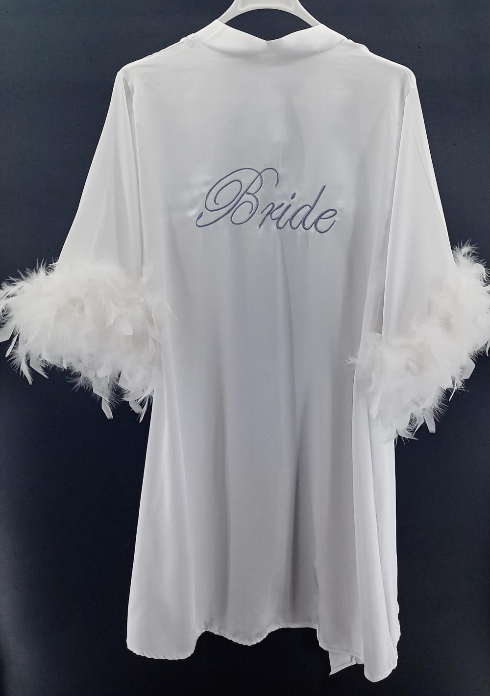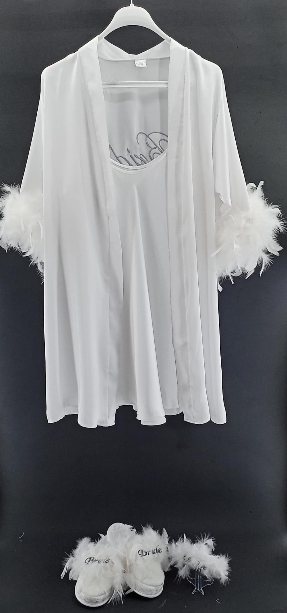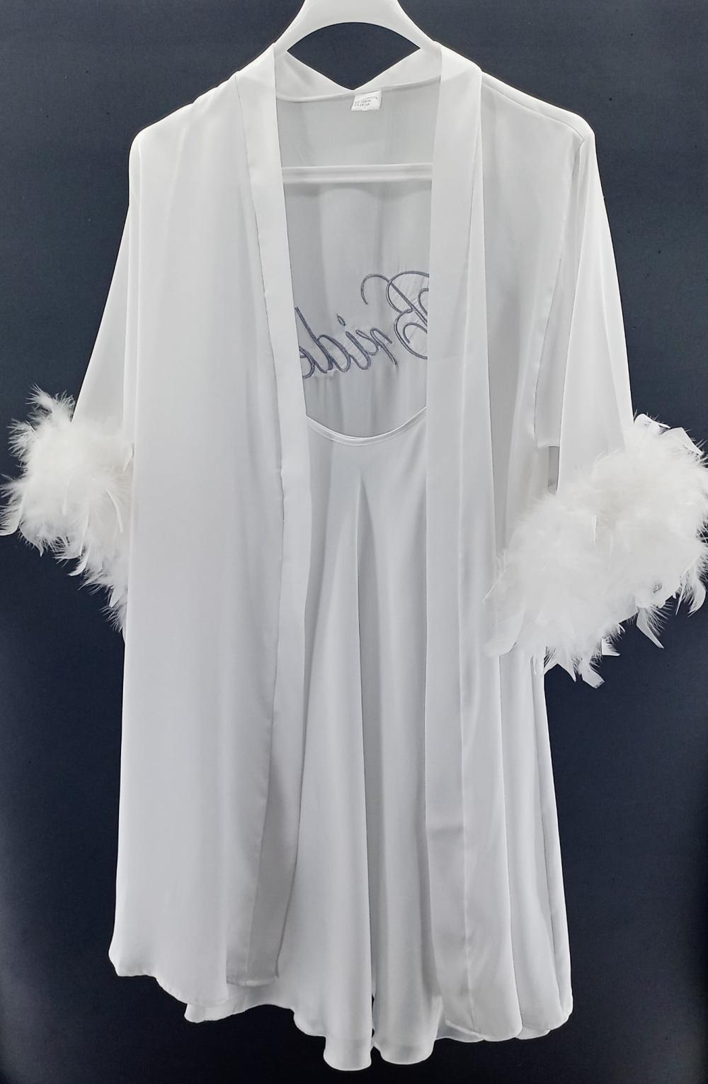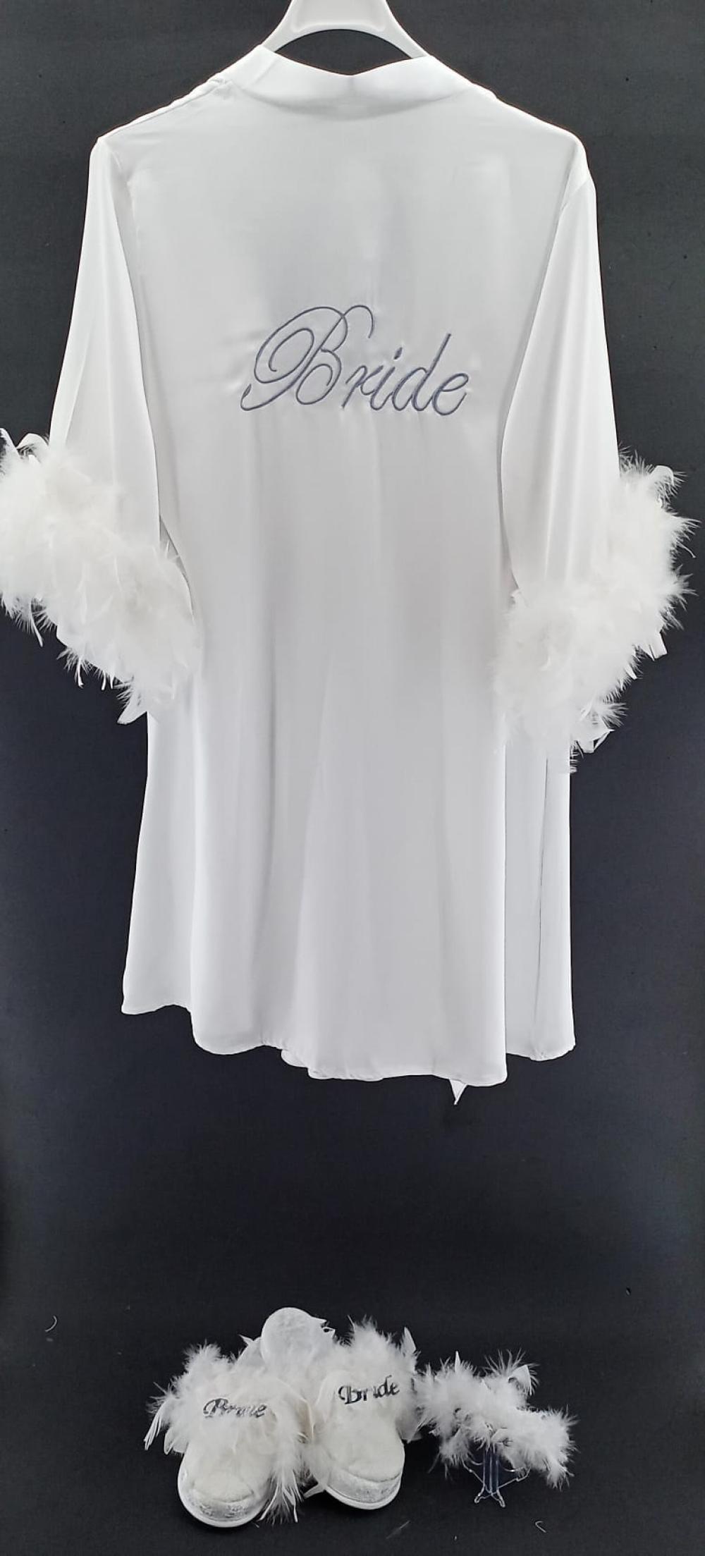Gümüş Nakış İşlemeli Tüylü Model Bride Sabahlık / Gecelik Terlik Taç Seti